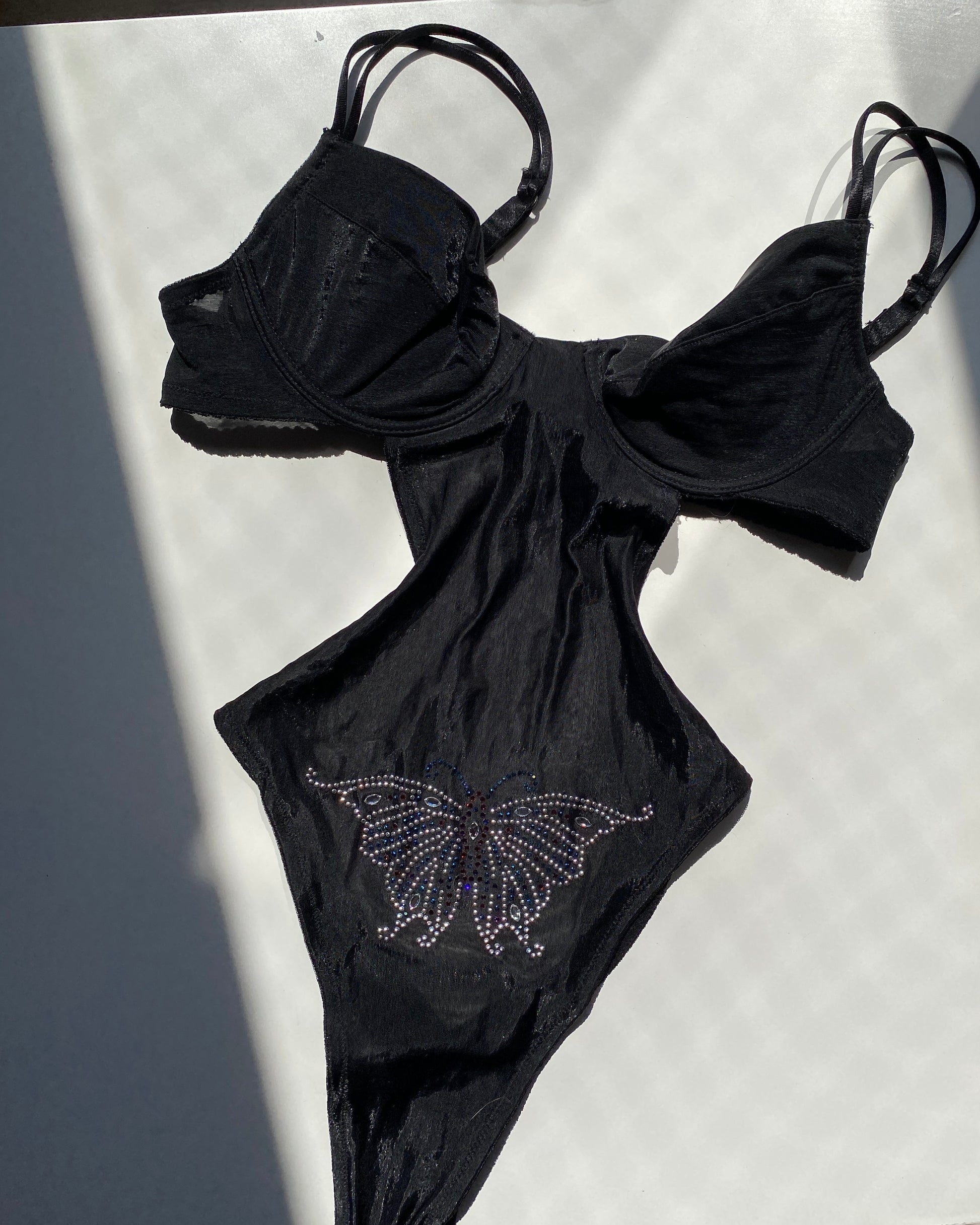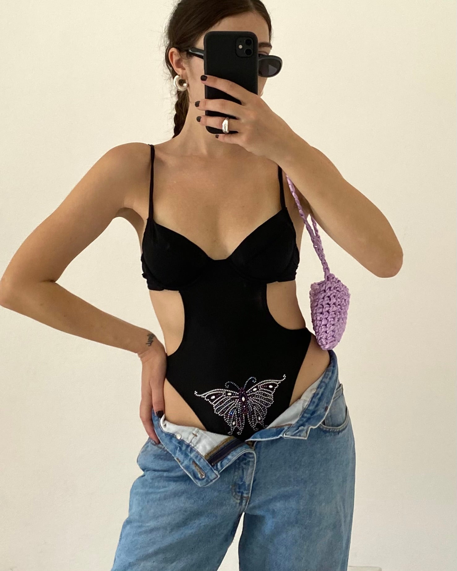Adorable early 00s y2k vintage bodysuit from the Italian designer Margherita Mazzei with cut-out details, rhinestone butterfly embroidery, thong with clasps, adjustable straps and hooks at the back.