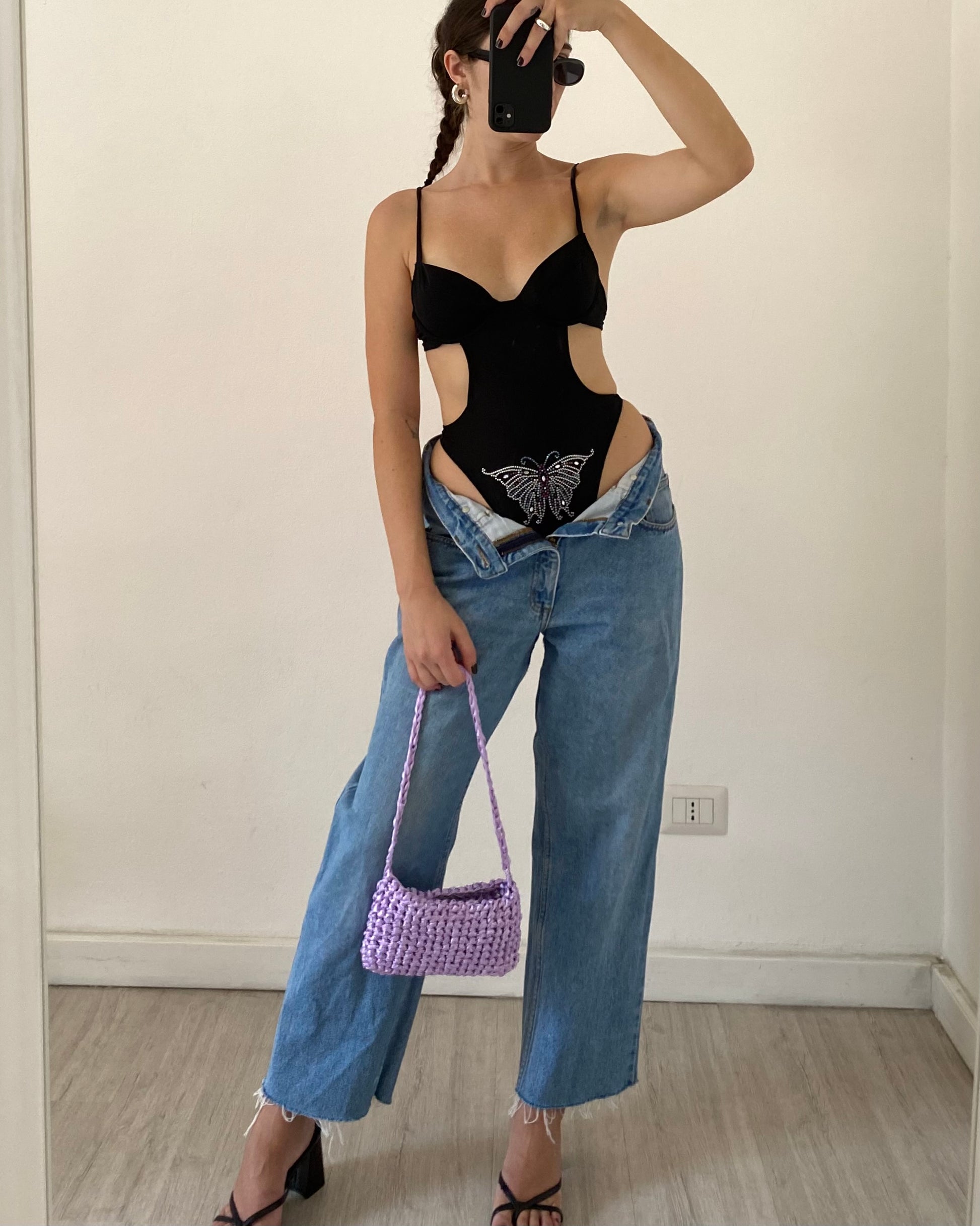 Body primi anni 2000 della designer italiana Margherita Mazzei, dettagli cut-out, farfalla in strass colorati, perizoma con chiusura, spalline regolabili e gancetti sul retro.