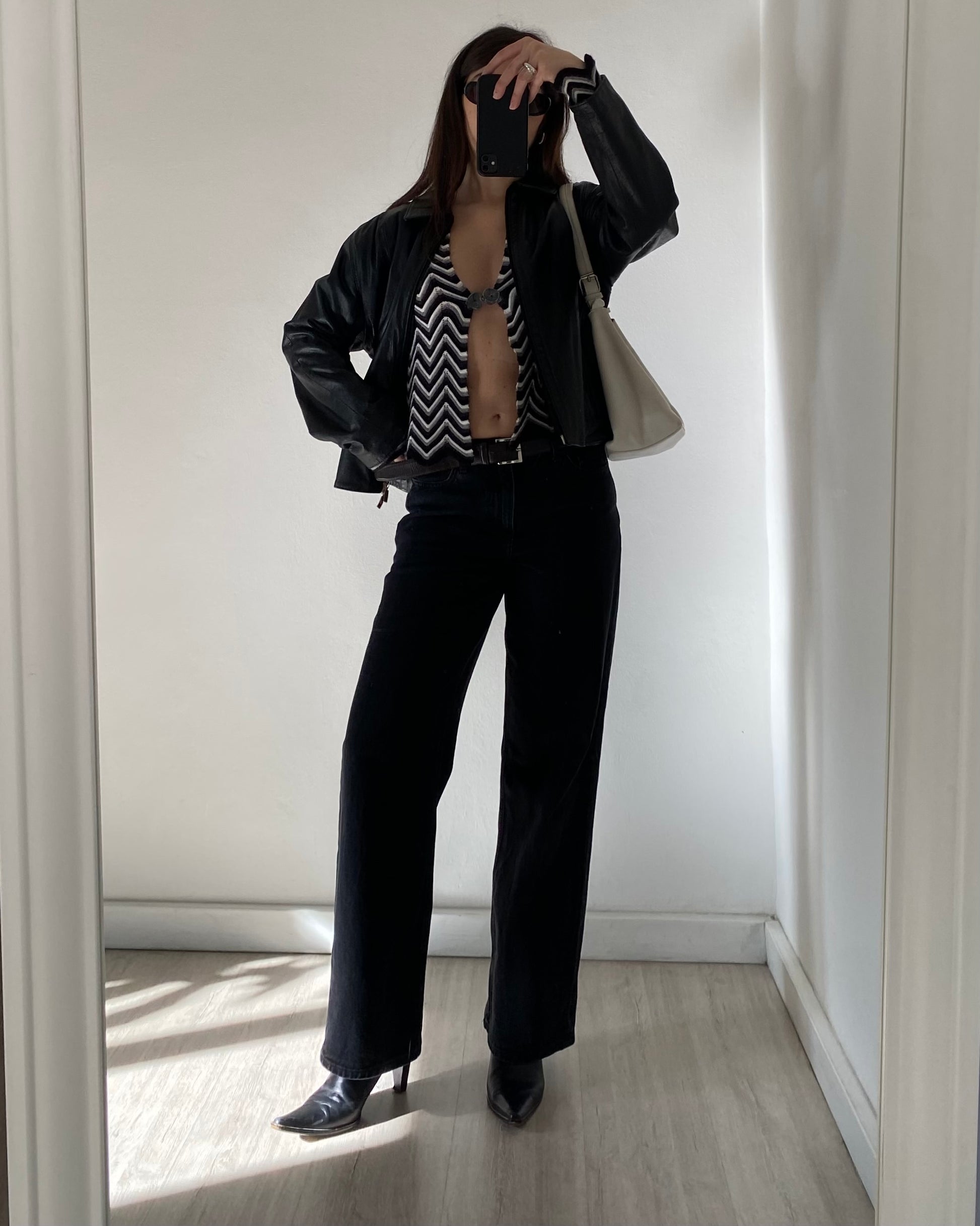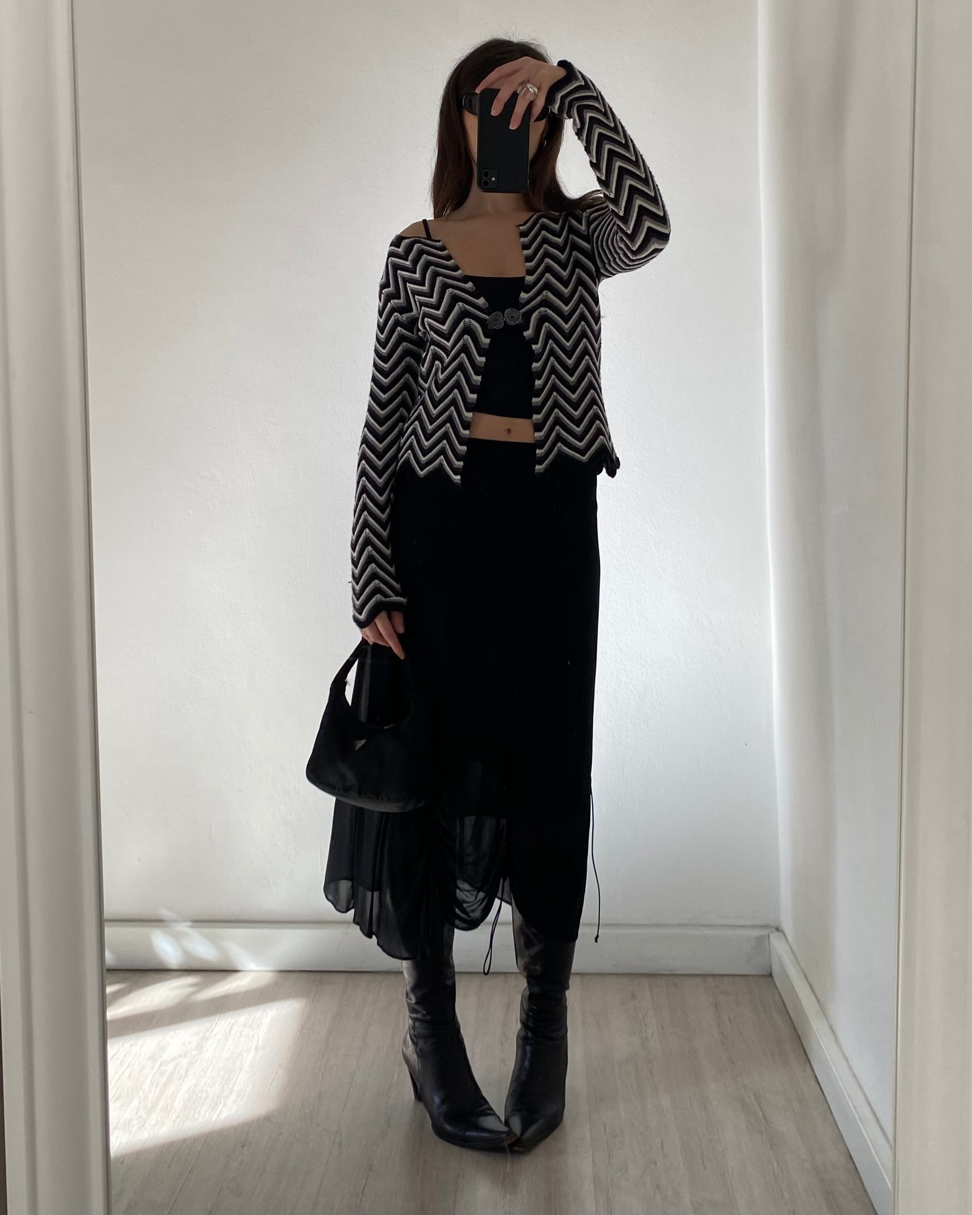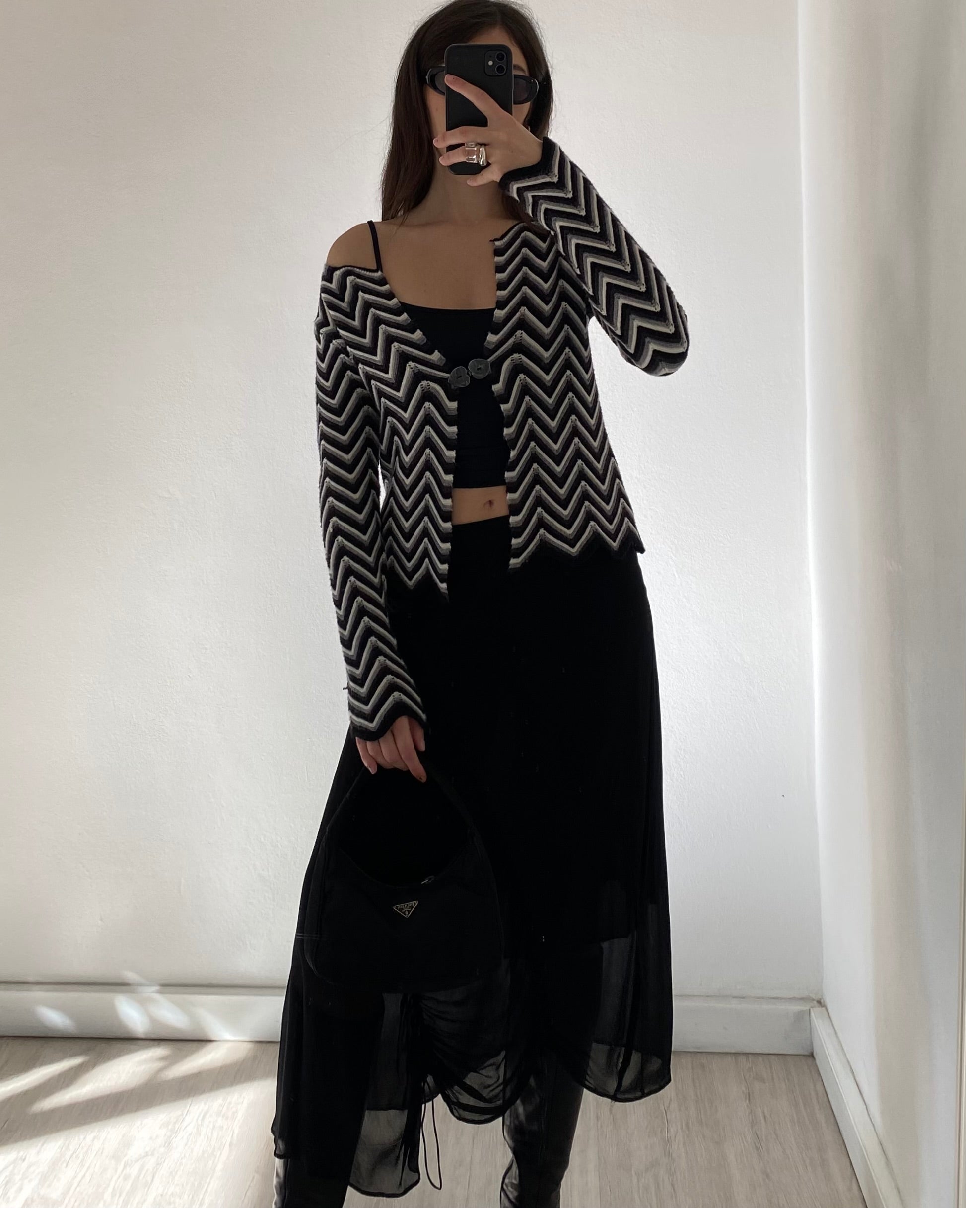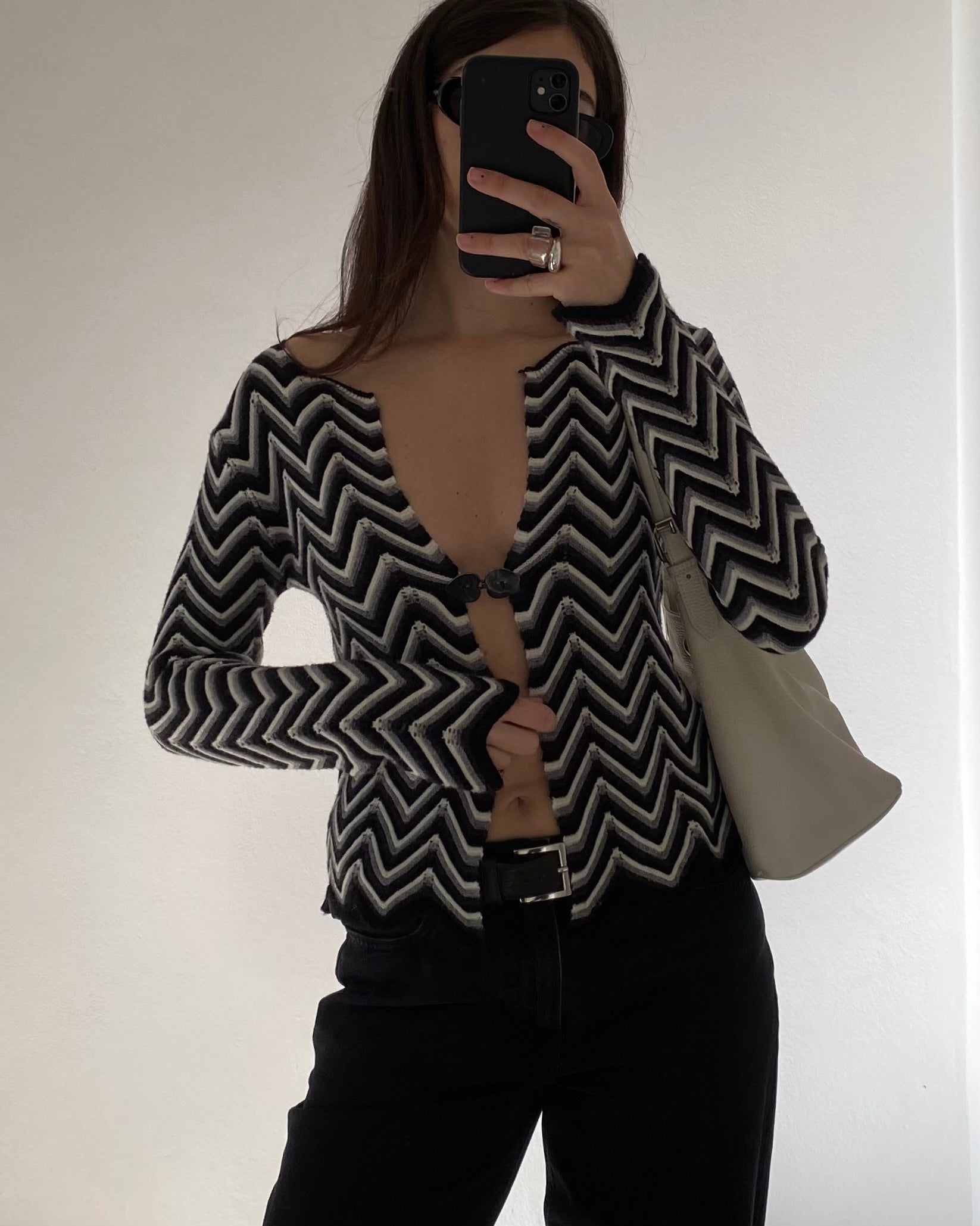 Delizioso cardigan top in maglia primi anni 2000, taglio slim con vestibilità aderete, aperto sul davanti, trama lavorata zig-zag, bottone-gancio in metallo, morbidissima viscosa. Perfetto per creare sovrapposizioni, da indossare come top, come mini cardigan o come sottogiacca.