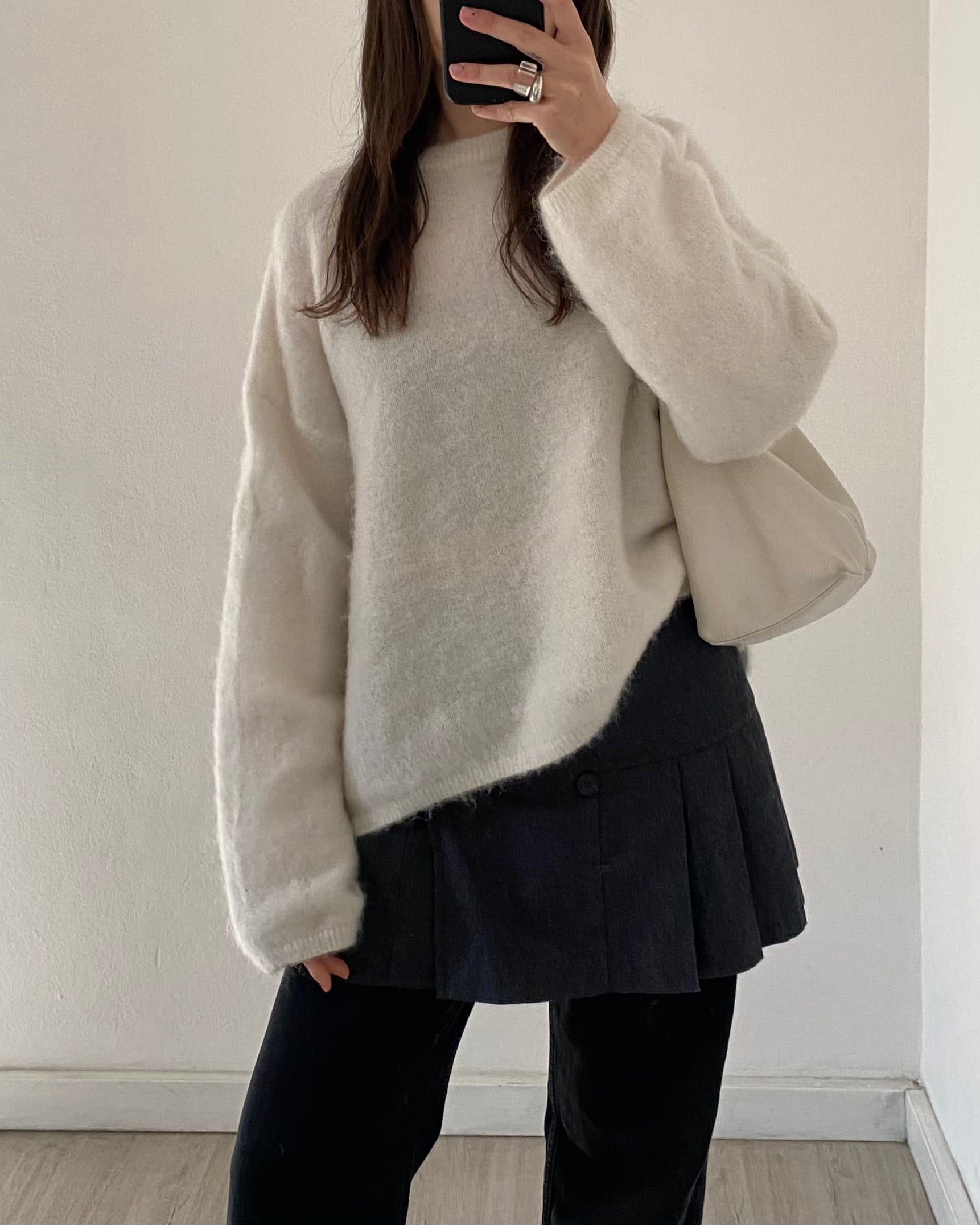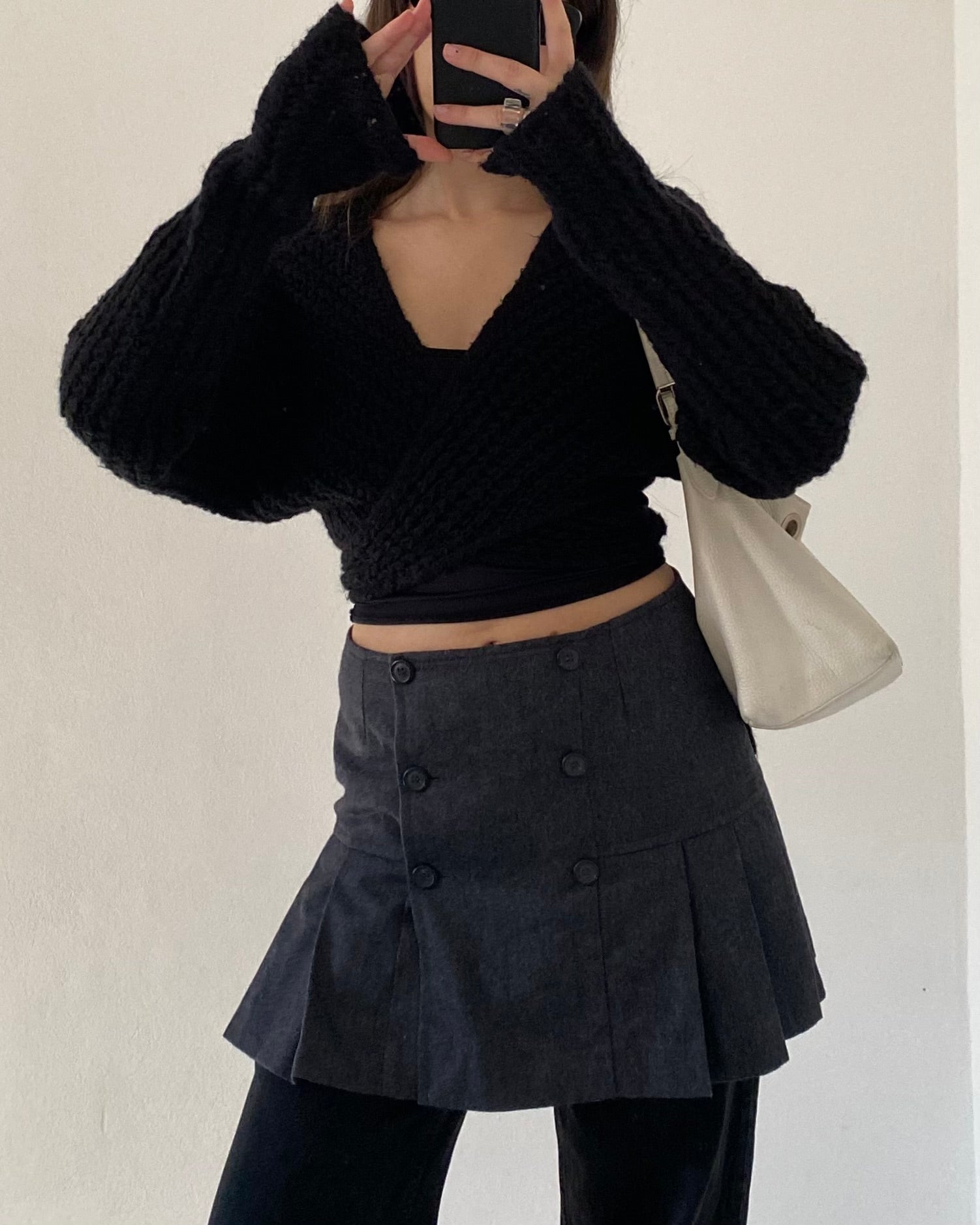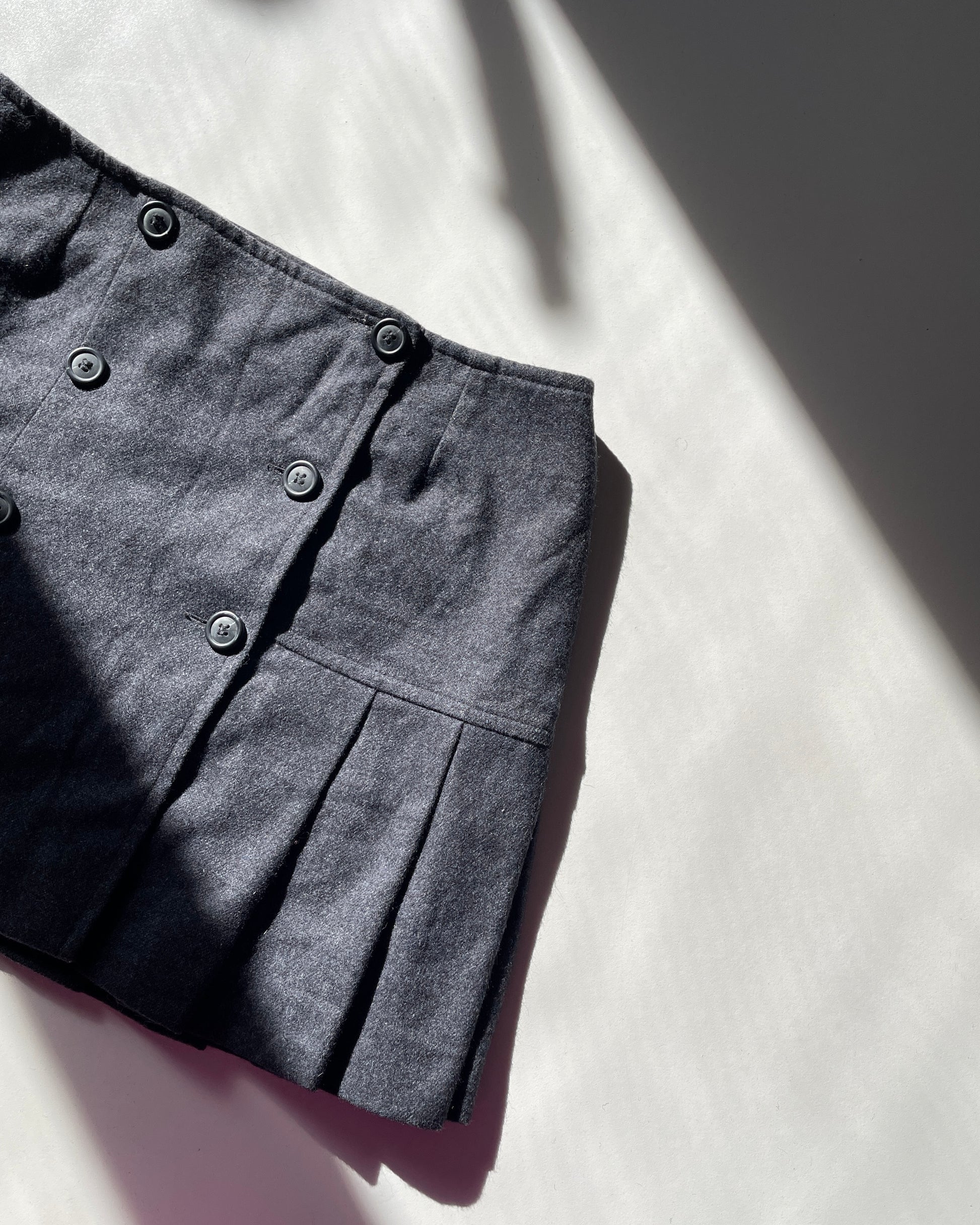 Meravigliosa minigonna in lana primi anni 2000, modello a portafoglio con bottoni, leggermente svasata con pieghe, fodera interna.