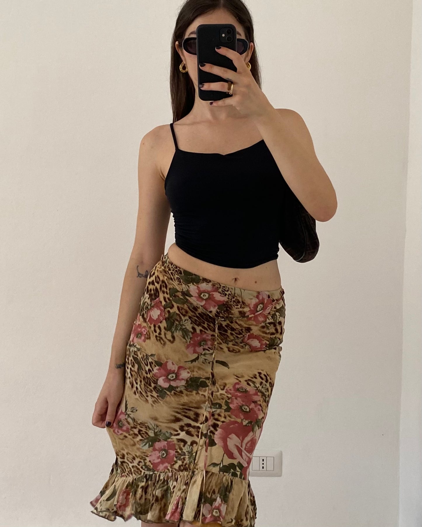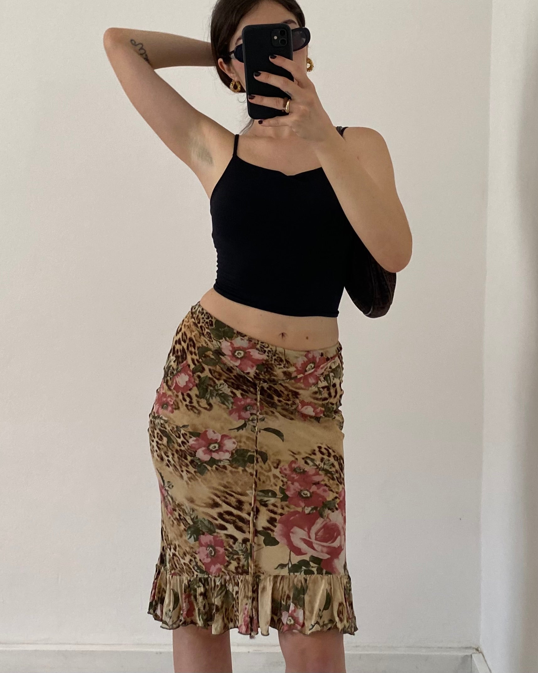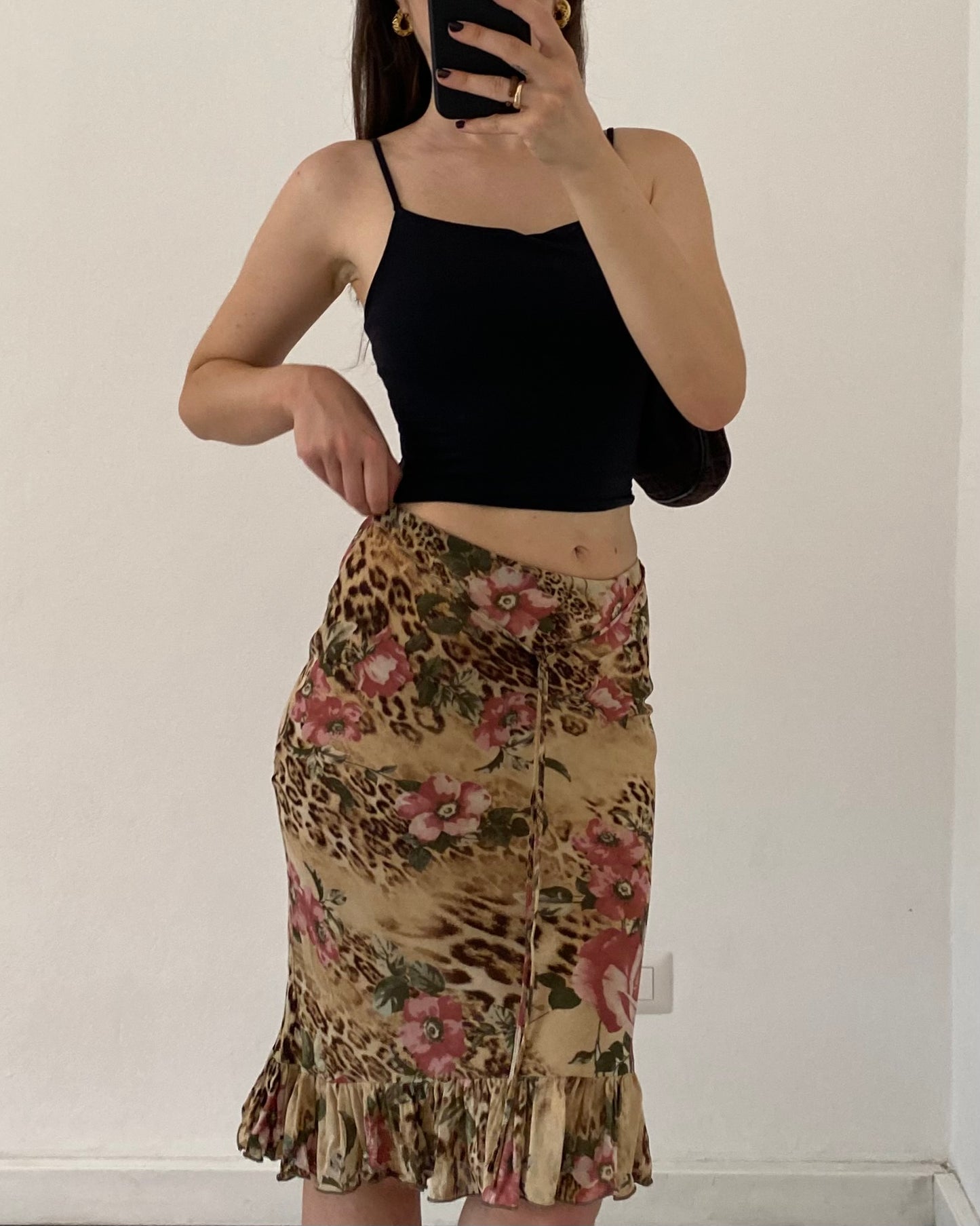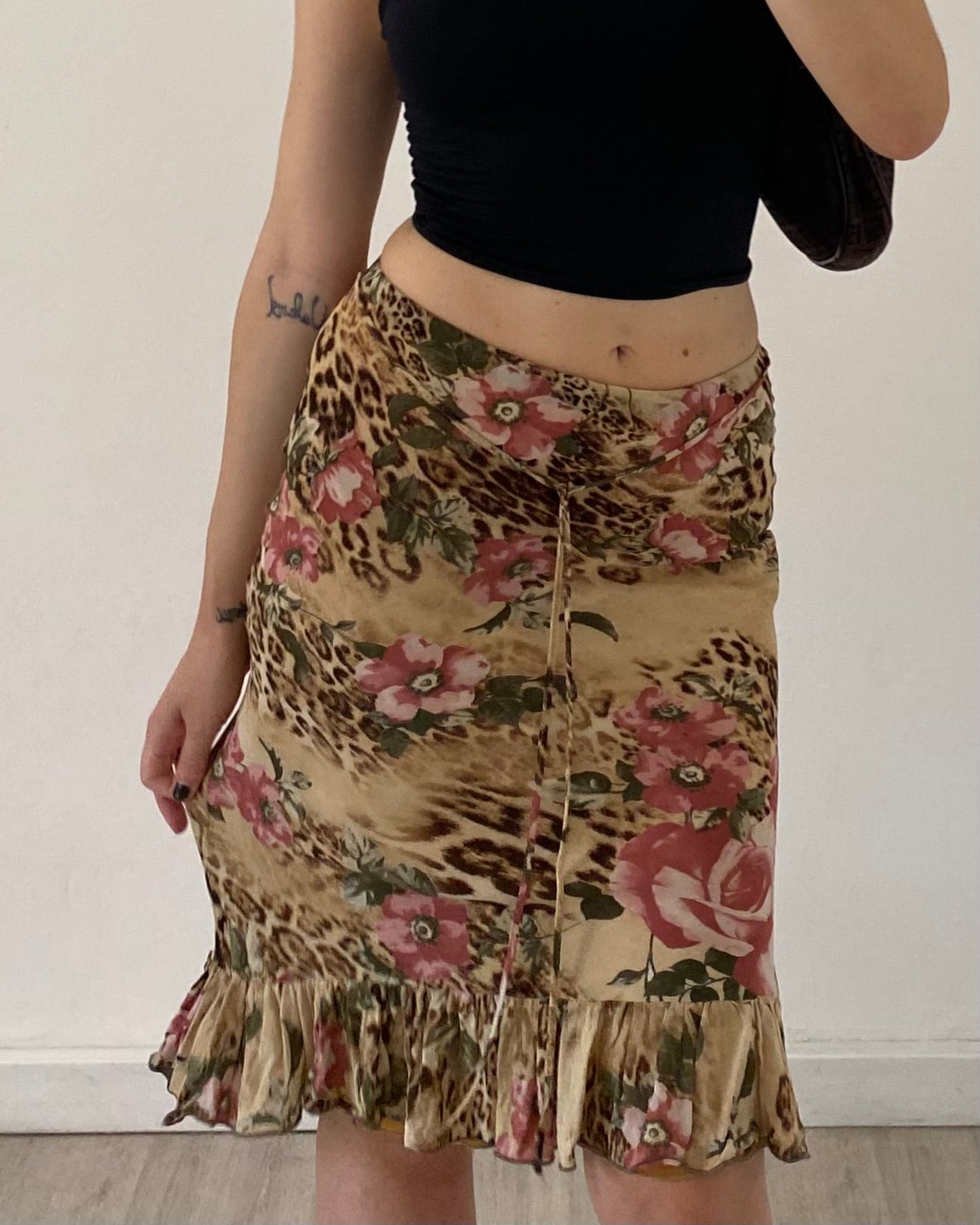 Mevigliosa gonna midi primi anni 2000 con stampa animalier e floreale, dettagli volant, vita media con lacetti da annodare fronte/retro o in vita, fodera interna. Bellissima!
