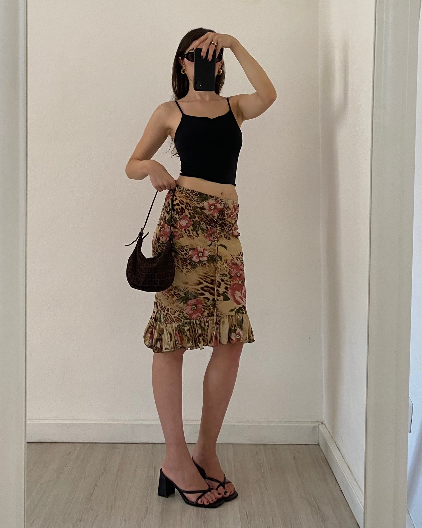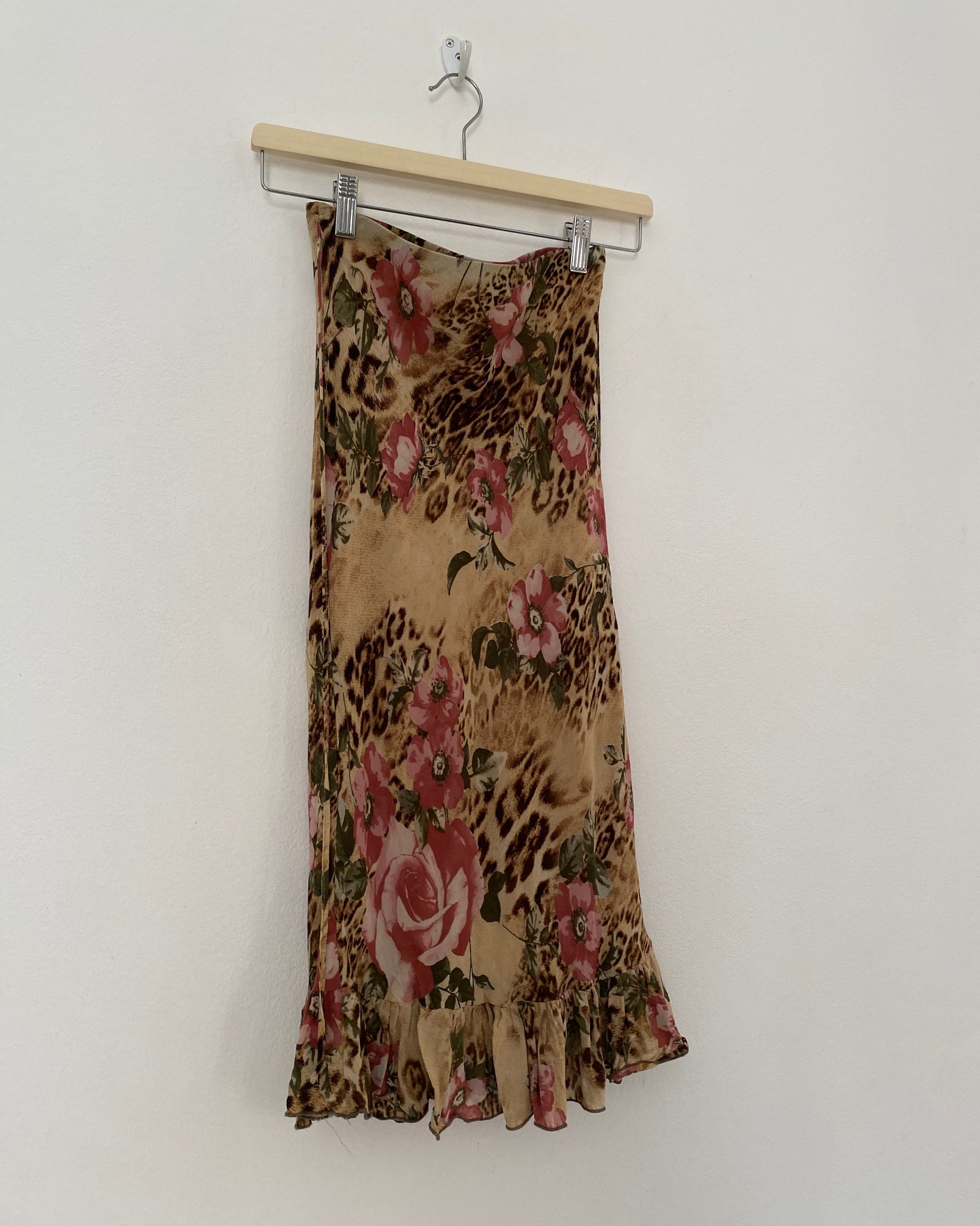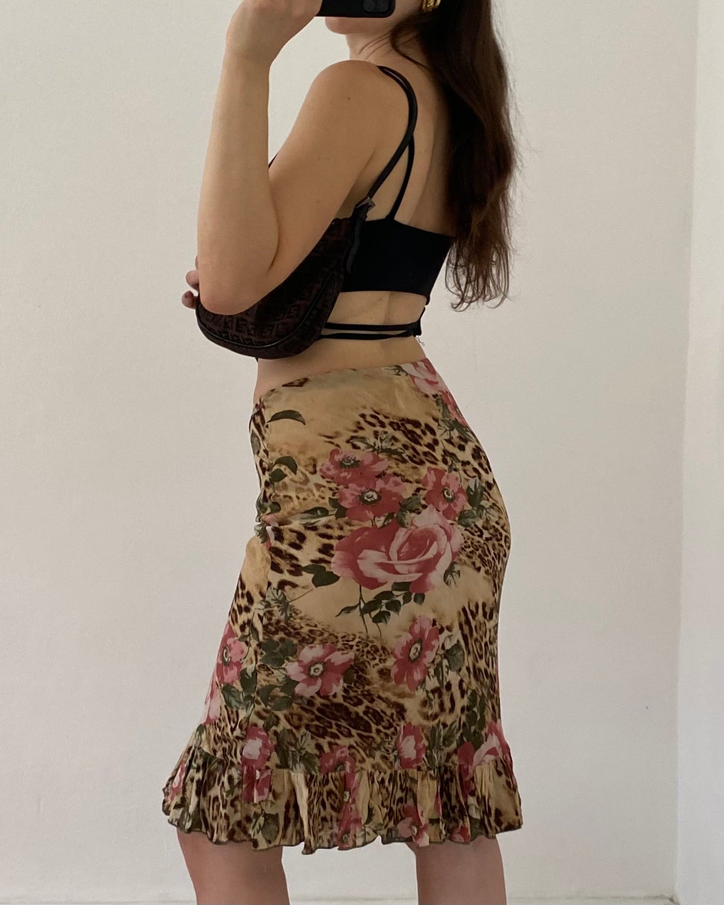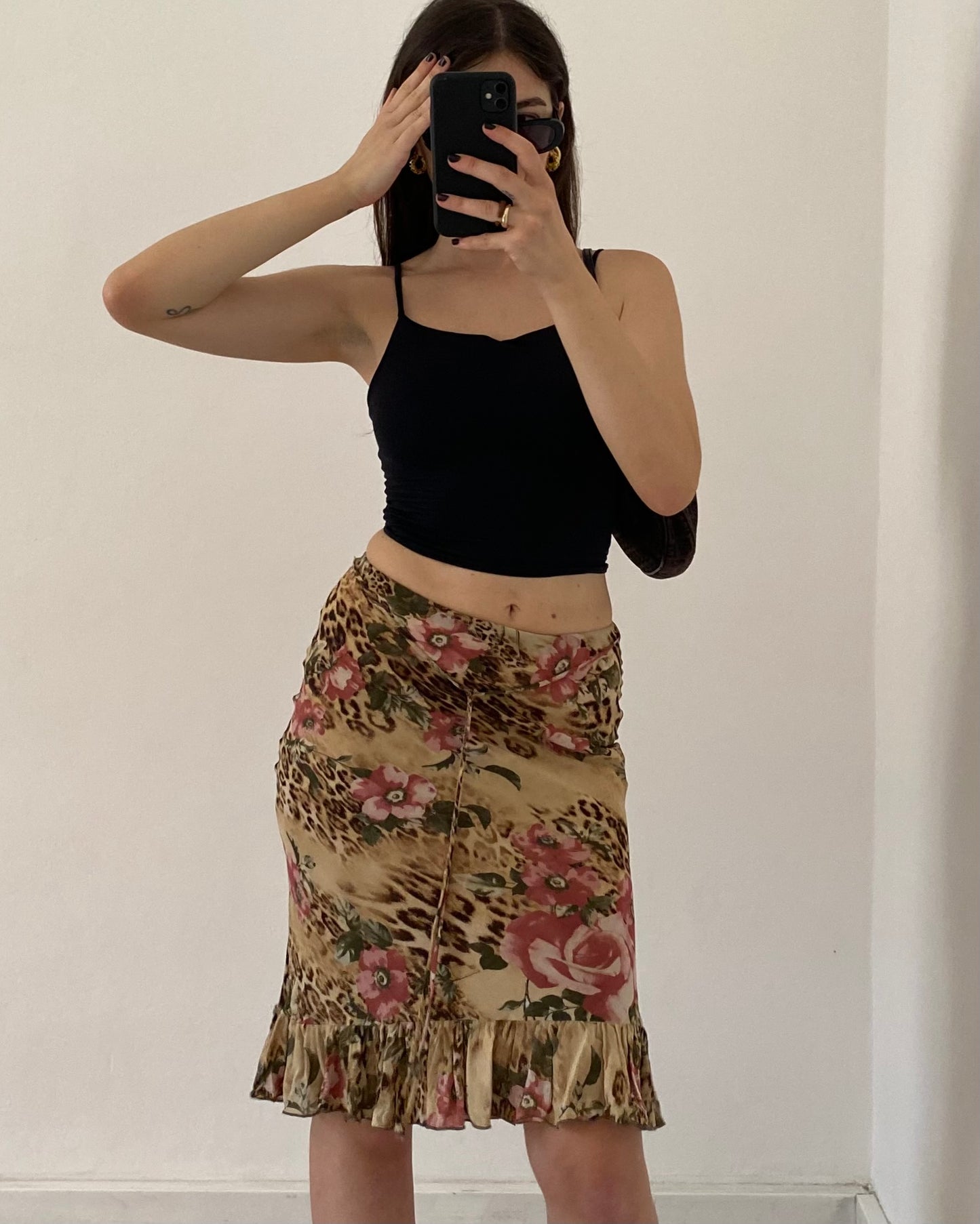 Mevigliosa gonna midi primi anni 2000 con stampa animalier e floreale, dettagli volant, vita media con lacetti da annodare fronte/retro o in vita, fodera interna. Bellissima!