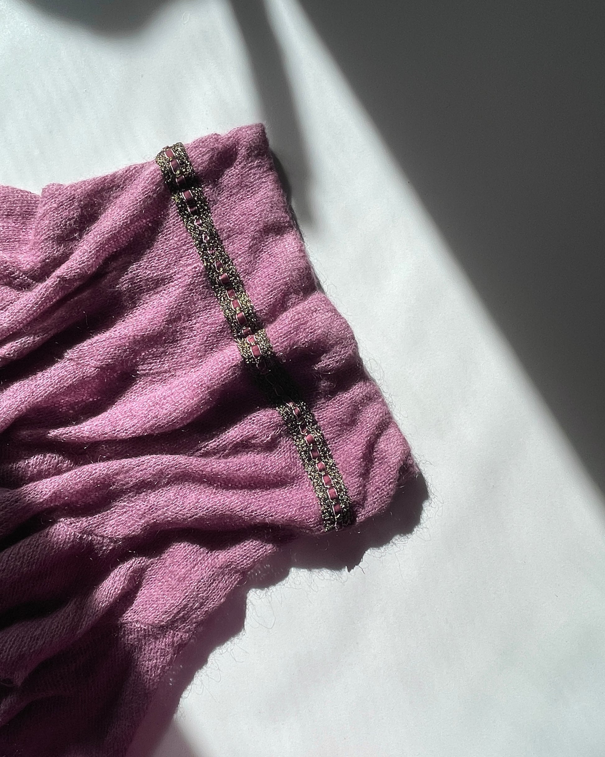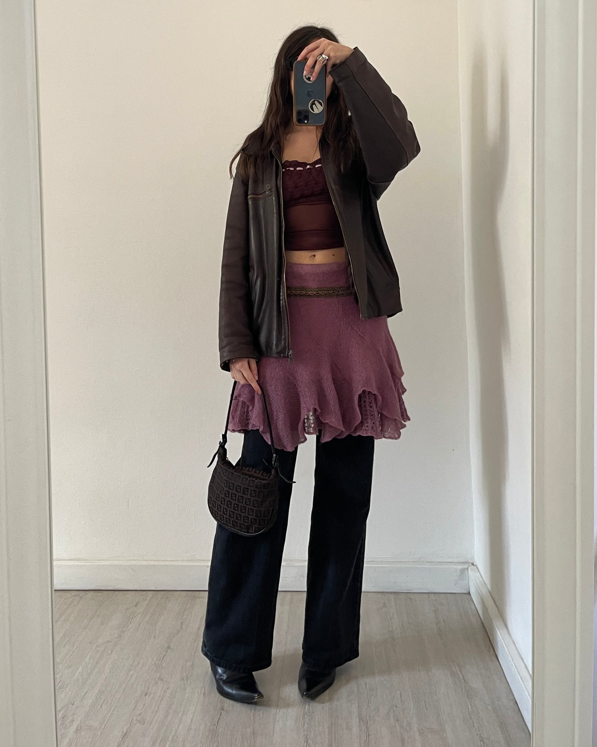 Gonna anni 2000 in misto lana mohair con orlo asimmetrico e svolazzante, doppia fodera interna, vita elasticizzata e dettagli ricamati.