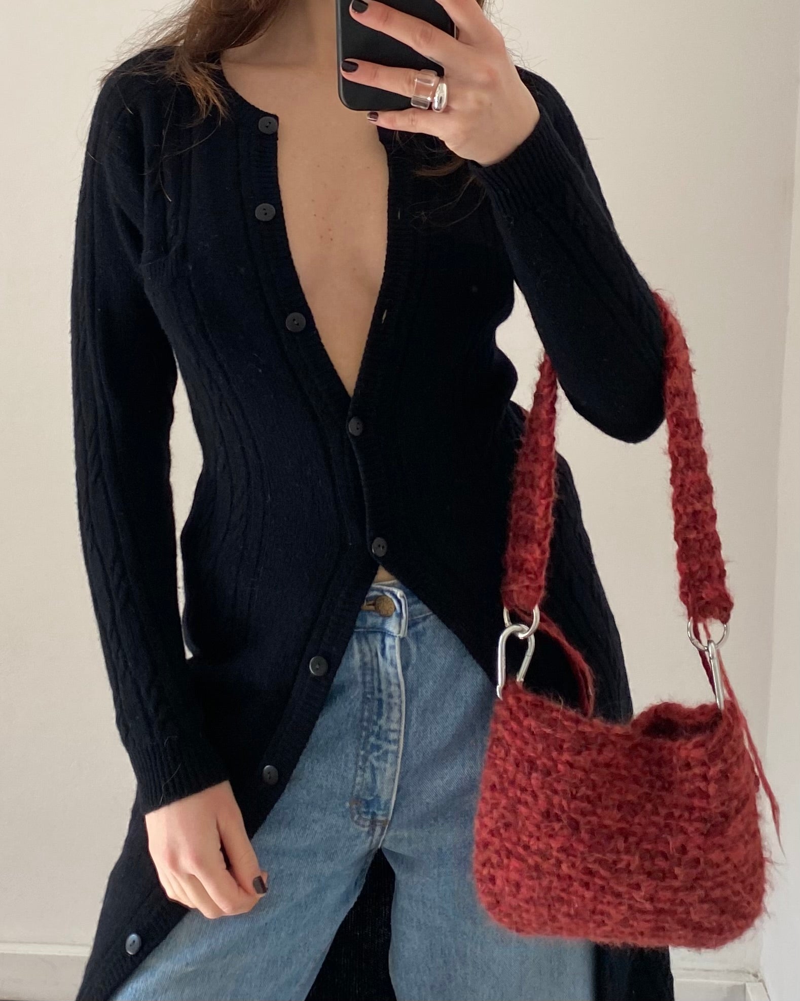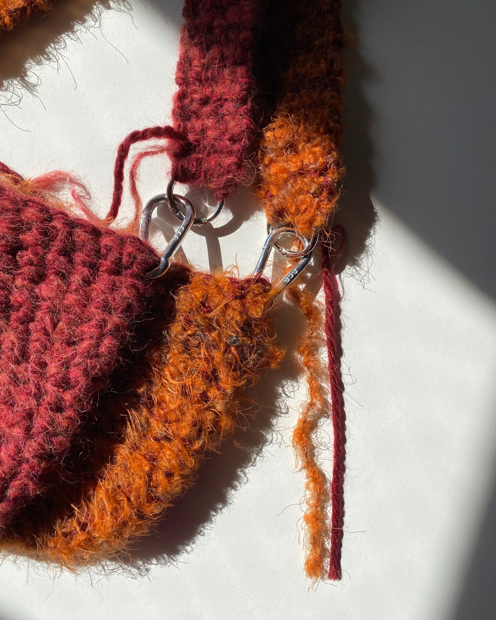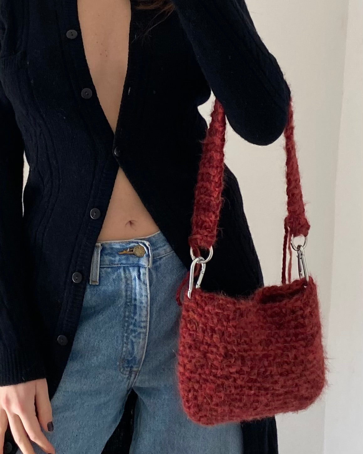 Borsina realizzata a mano in misto lana, chiusura con bottone automatico, dettagli in metallo argentati. I moschettoni sono rimovibili, in modo tale da poter accorciare il manico o semplicemente cambiare look, si può indossare sia a spalla che a mano <3