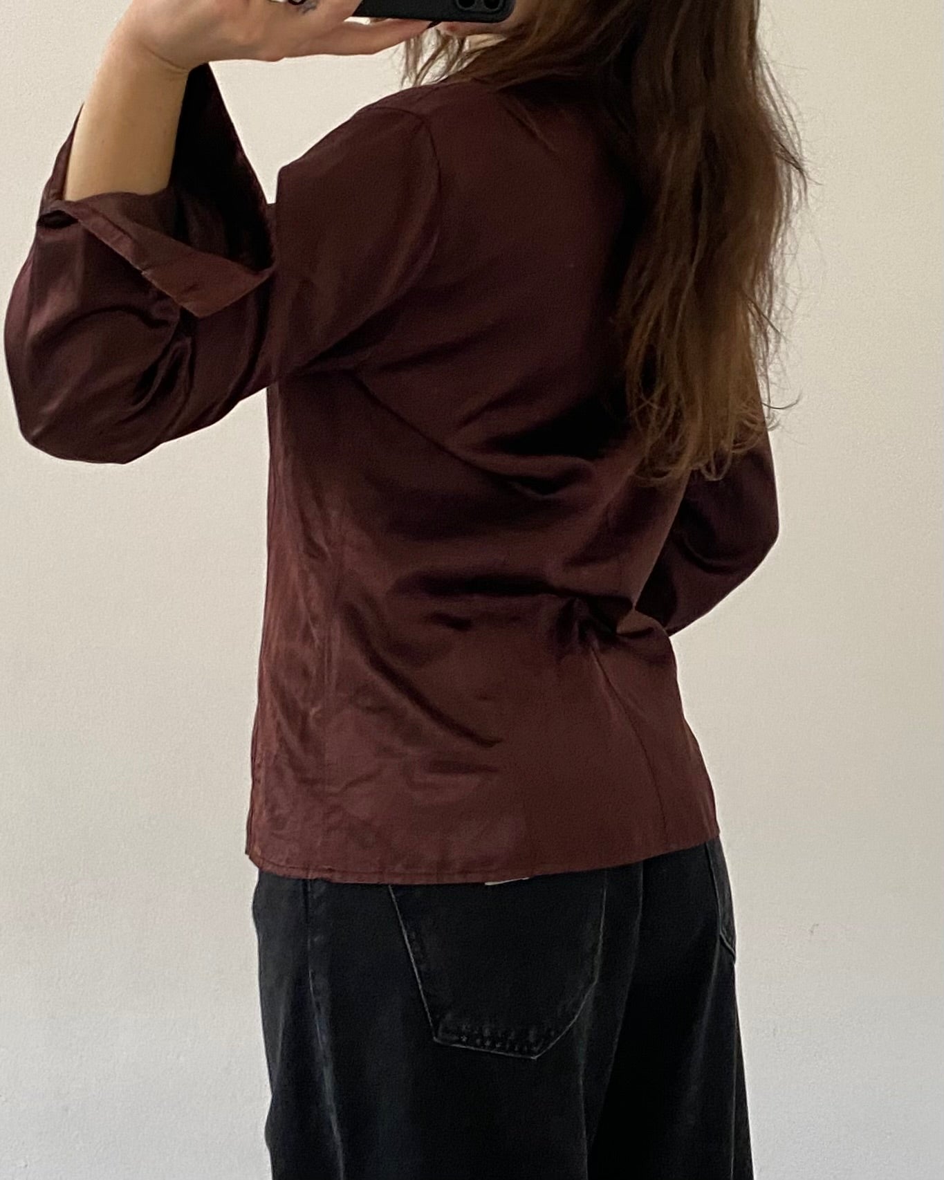 Camicetta in raso color cioccolato anni 2000, fit sagomato, ottima qualità del tessuto.