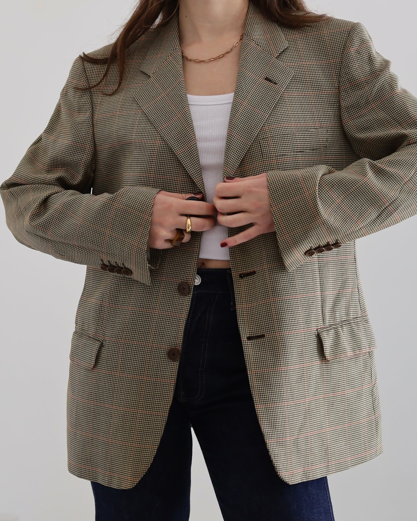 Vintage tailored check blazer in extra fine wool "super 120", the finest lightweight wool yarn, perfect for spring! Structured fit, cupro lining, excellent quality. Labelled as a man size 48(man M), would fit S-M depending on the desired fit (oversize/regular). Seen on a size S 1,68m.