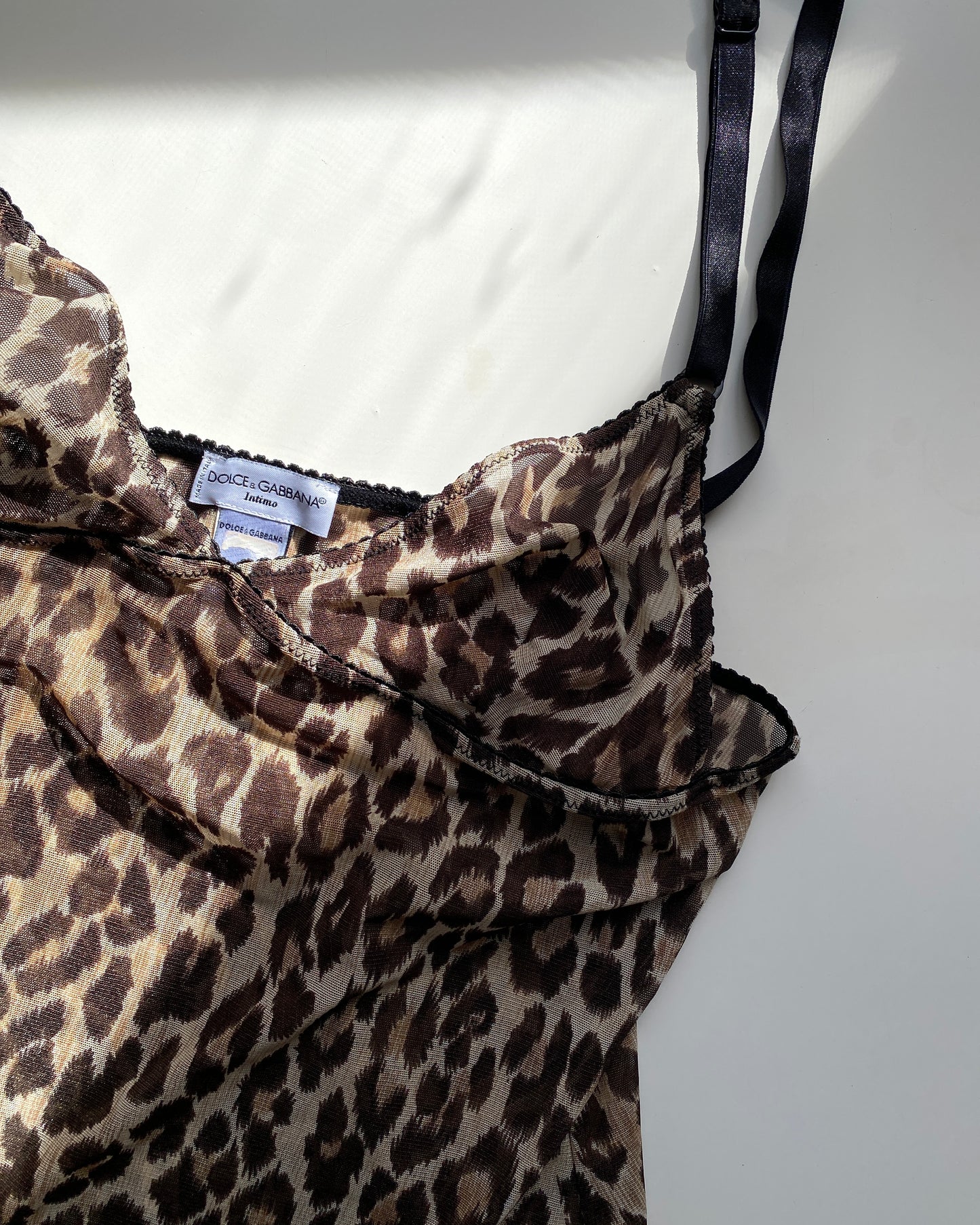 00s vintage Dolce&Gabbana leopard print micro mesh top, semi-sheer stretchy material, adjustable straps, deep plunge on the front. Nylon/elastane mix.