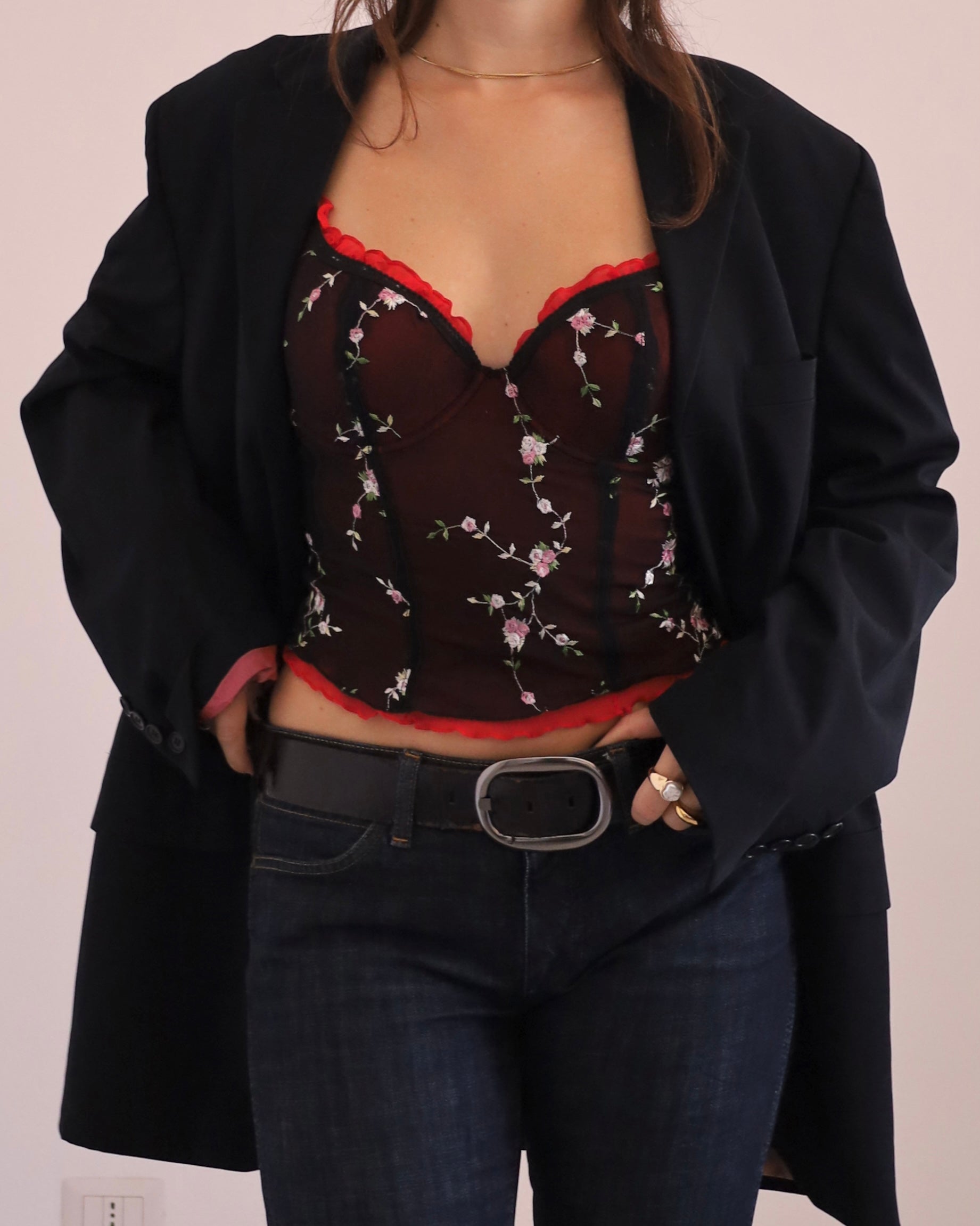 Rare and super sought after 00s y2k corset+matching brief co-ord set, double layered micro mesh top with lettuce hem and floral embroidery + soft ruched briefs, adjustable straps, hooks at the back, light padding, it's dead-stock without tags. No size label but would best fit size S-M cup C. Seen on a size S 1,68cm cup B.