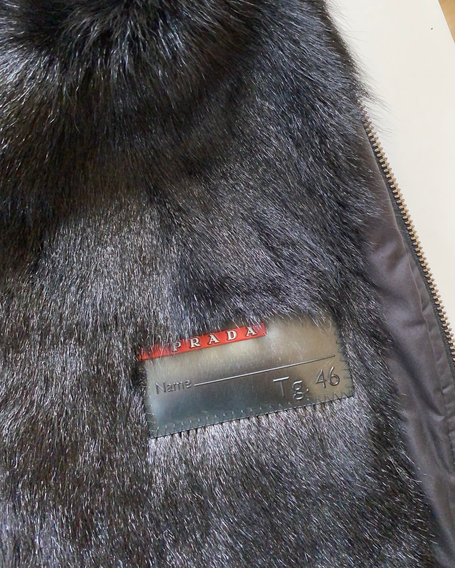 Meravigliosa giacca in nylon Prada con interno in pelliccia di capretto, doppia zip che può essere regolata in vari modi, logo sul retro.