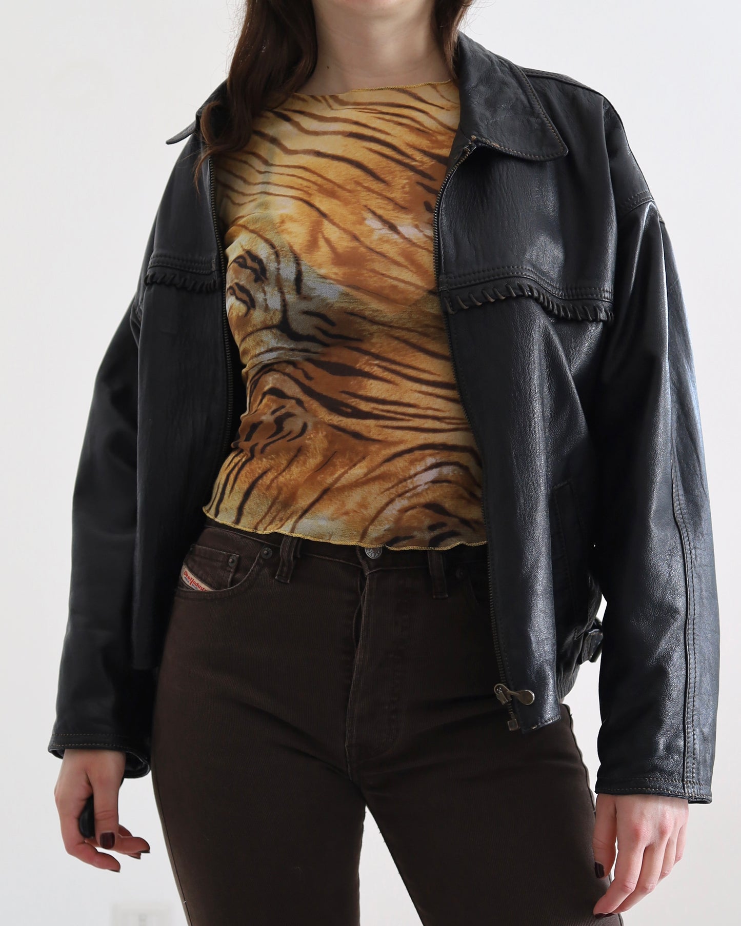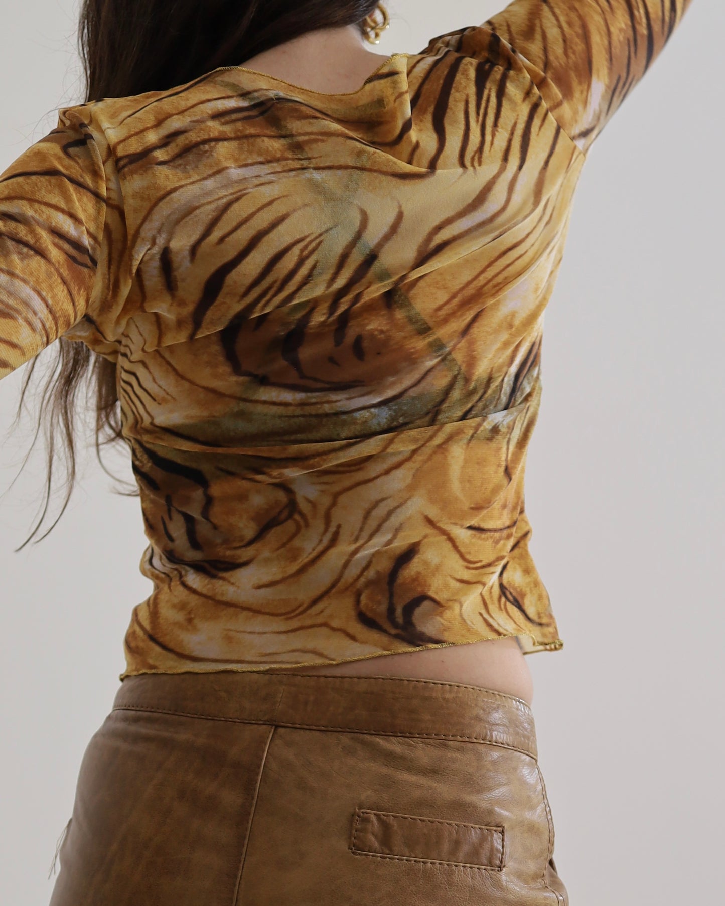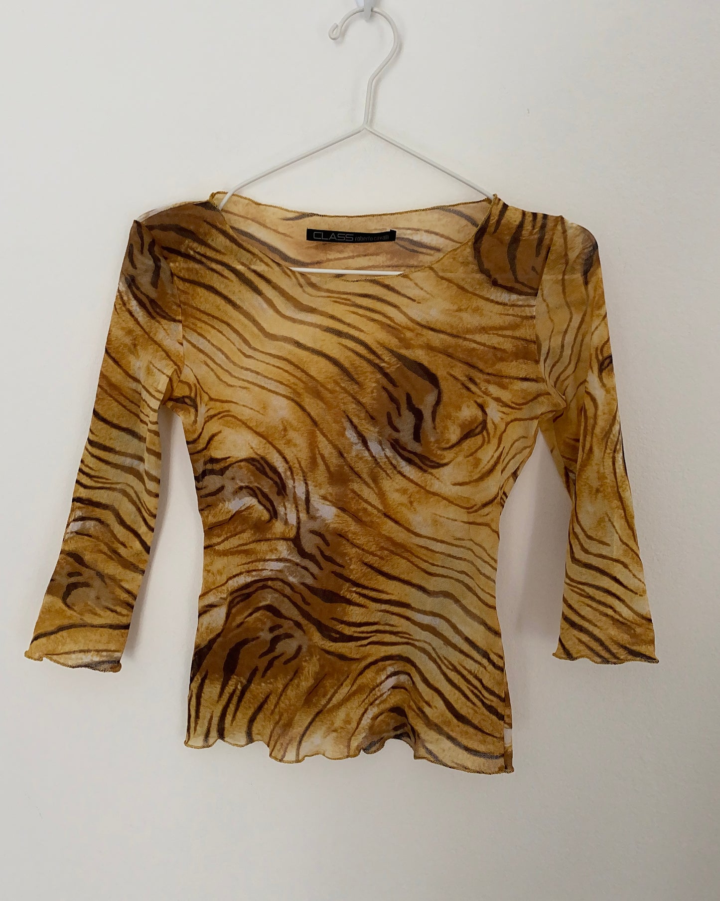 Unreal 00s vintage micro mesh top from Roberto Cavalli, tiger print, semi sheer, 3/4 sleeves.