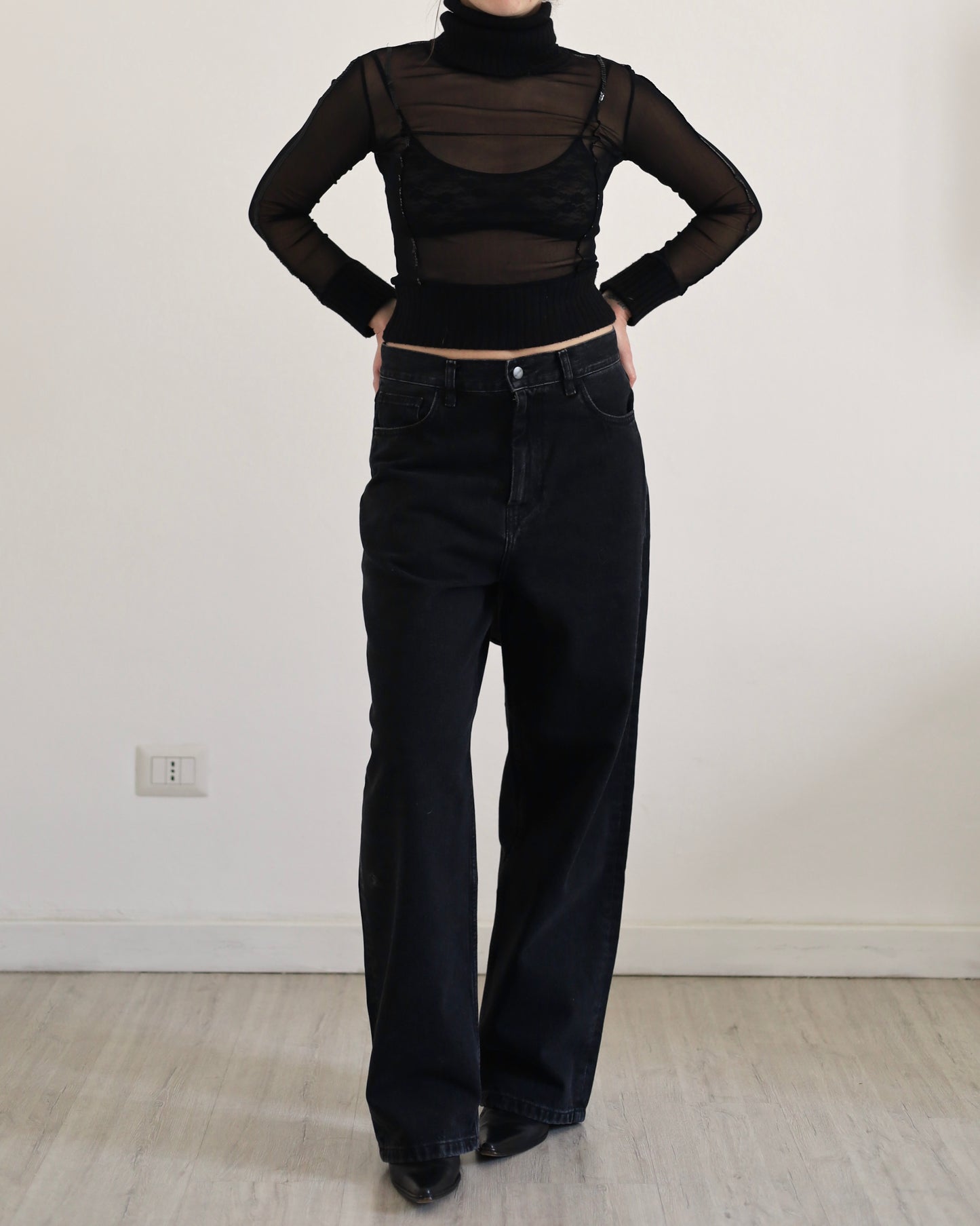 Top anni 2000 in micro tulle trasparente con collo alto, inserti in lana e dettagli con paillettes.