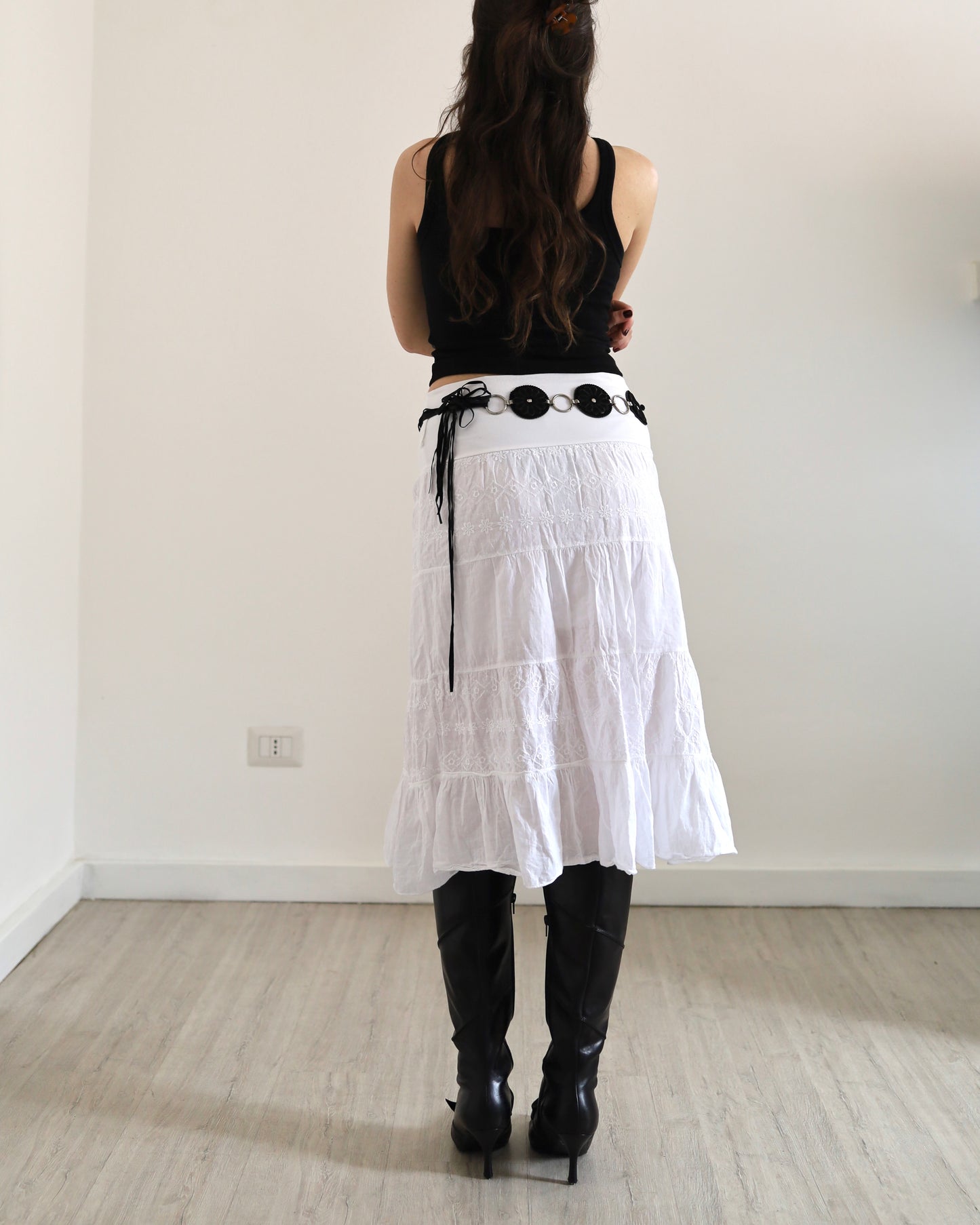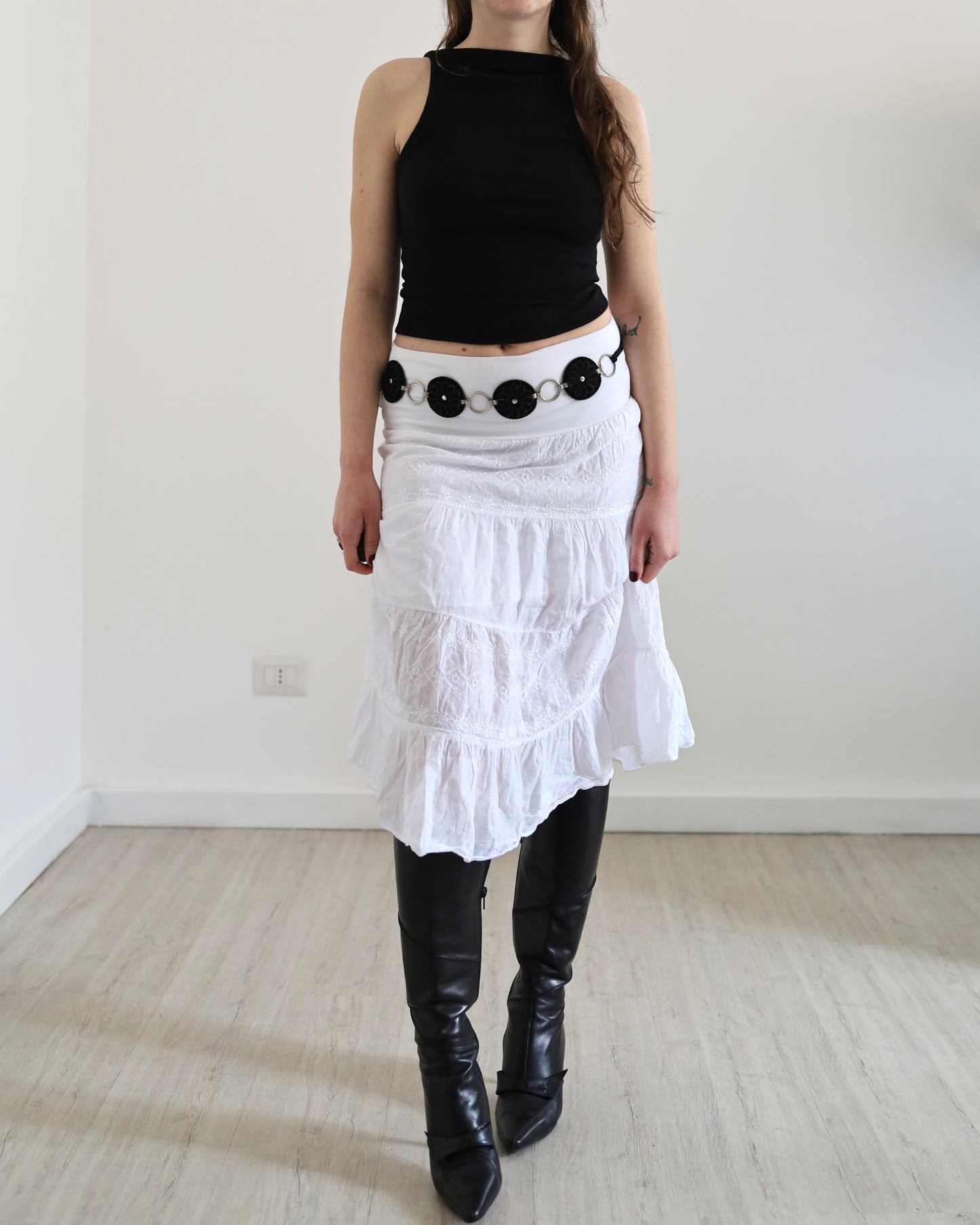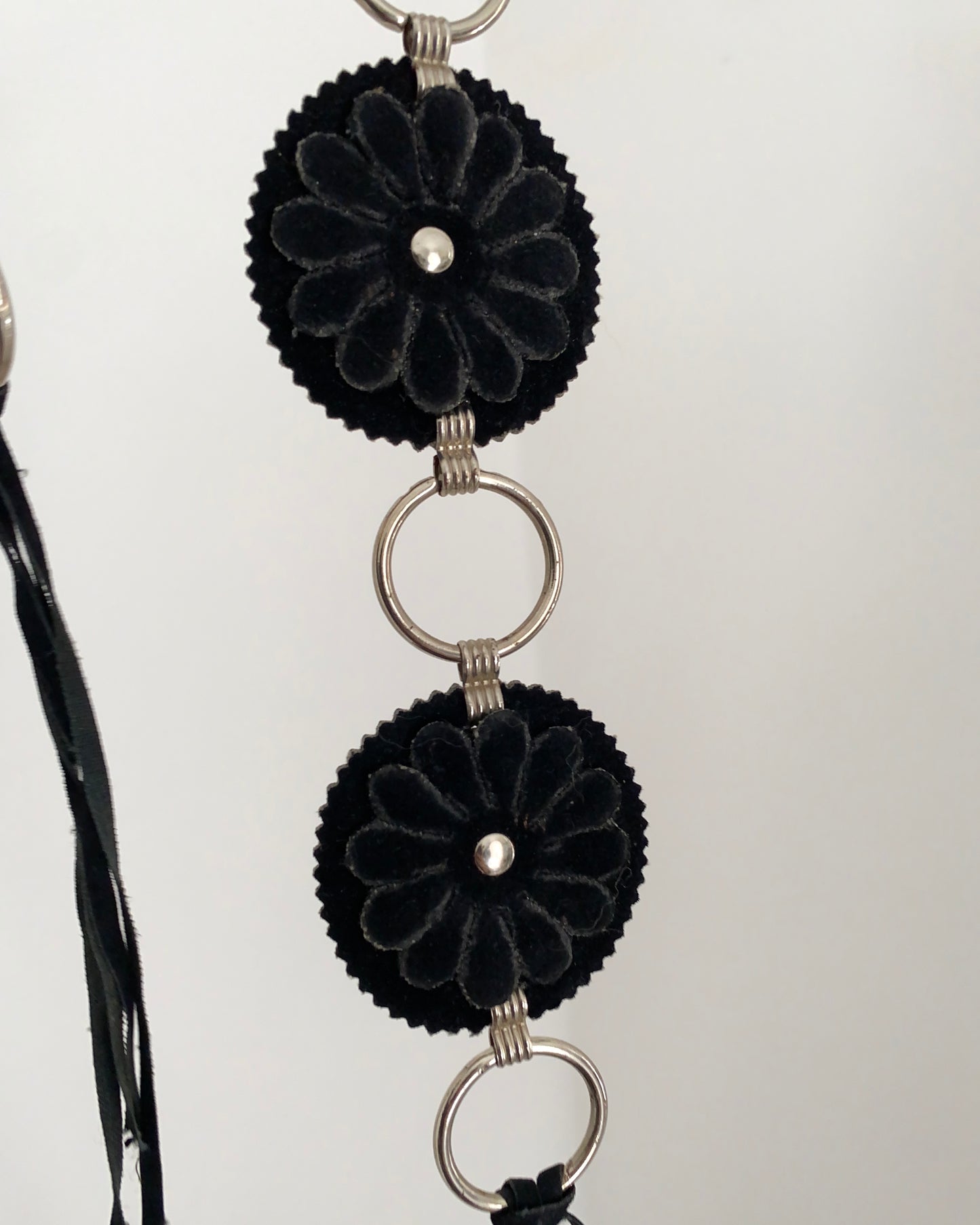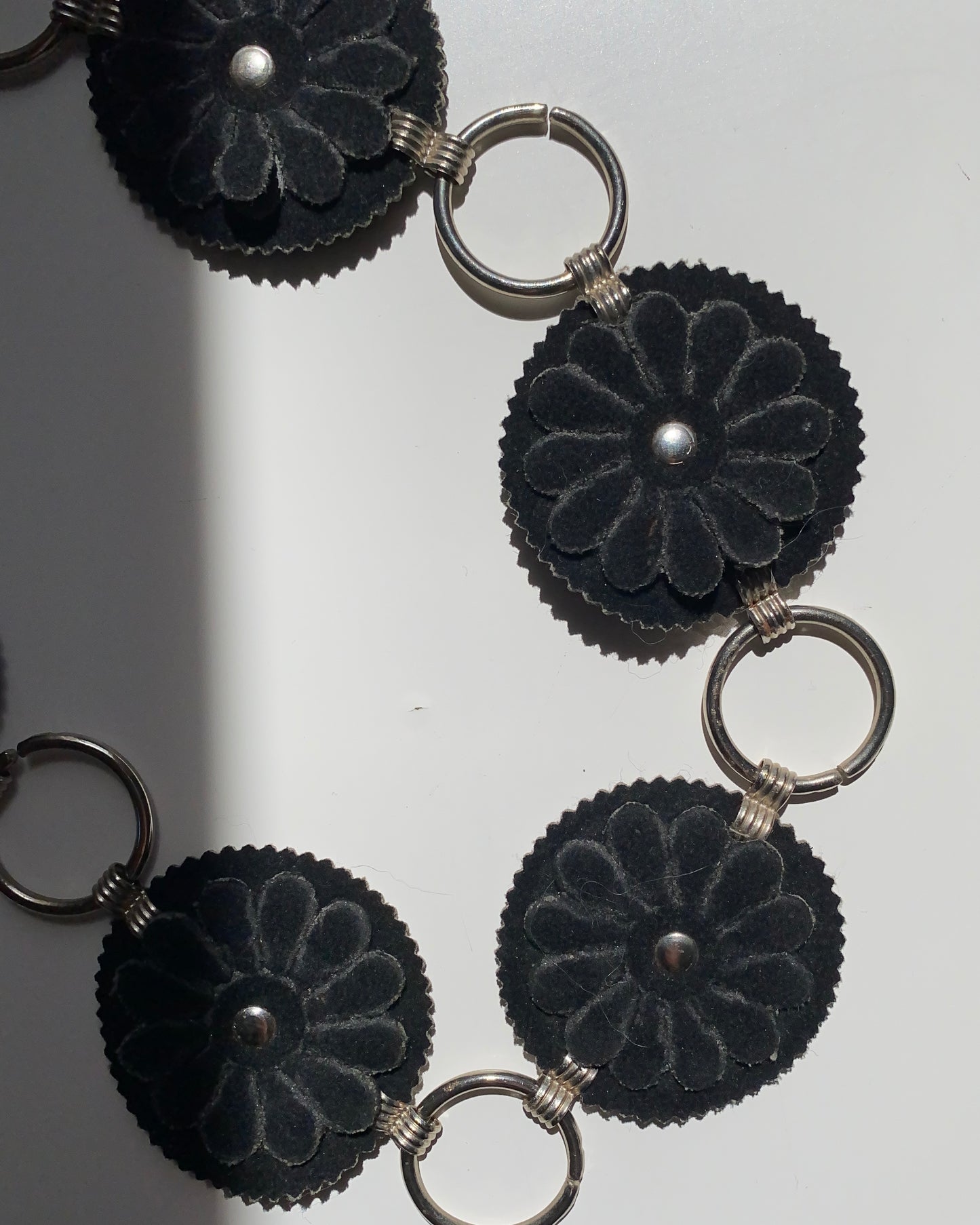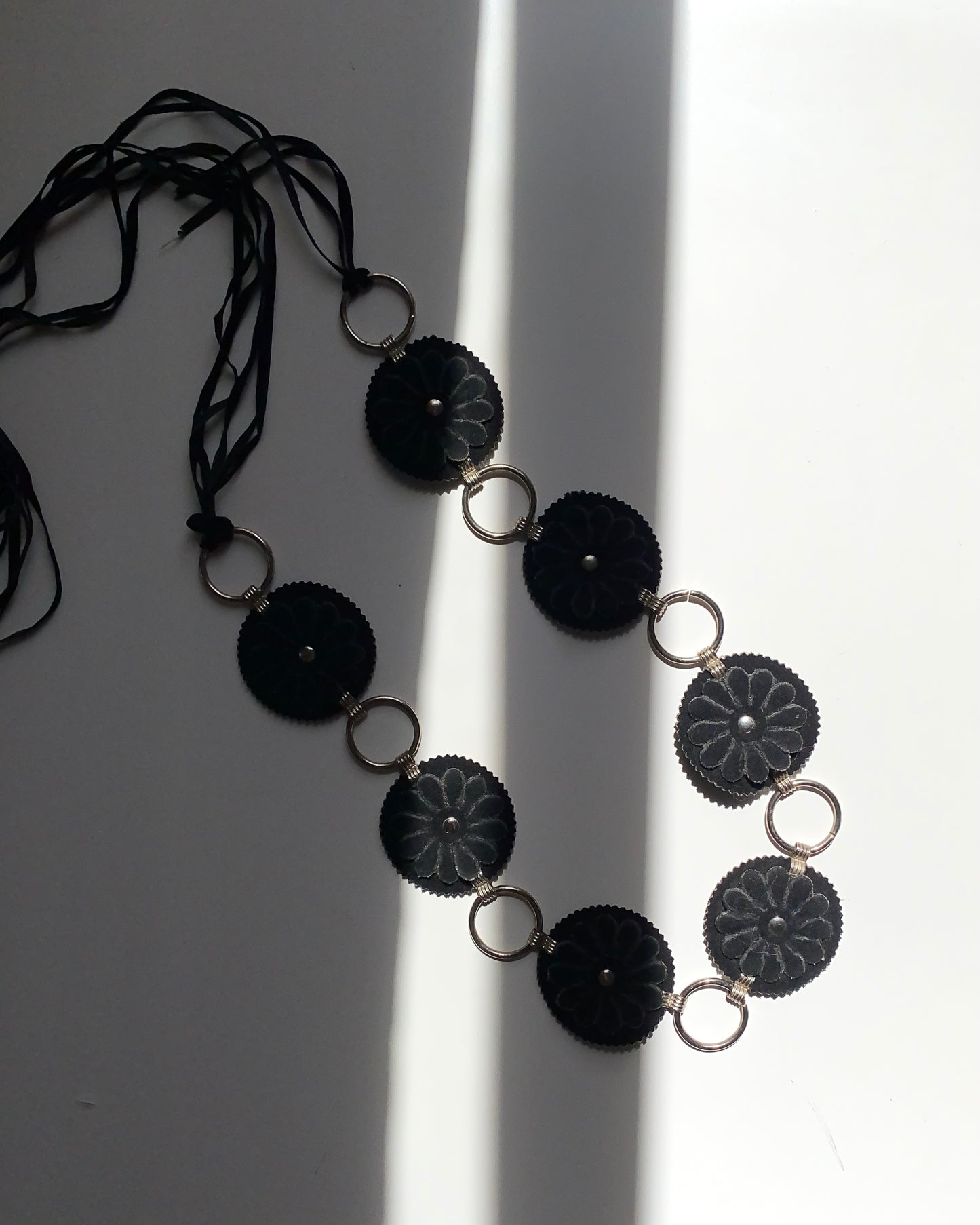 Meravigliosa cintura anni 2000 con medaglioni in simil-pelle a fiori e anelli in metallo, totalmente regolabile tramite i laccetti finali.