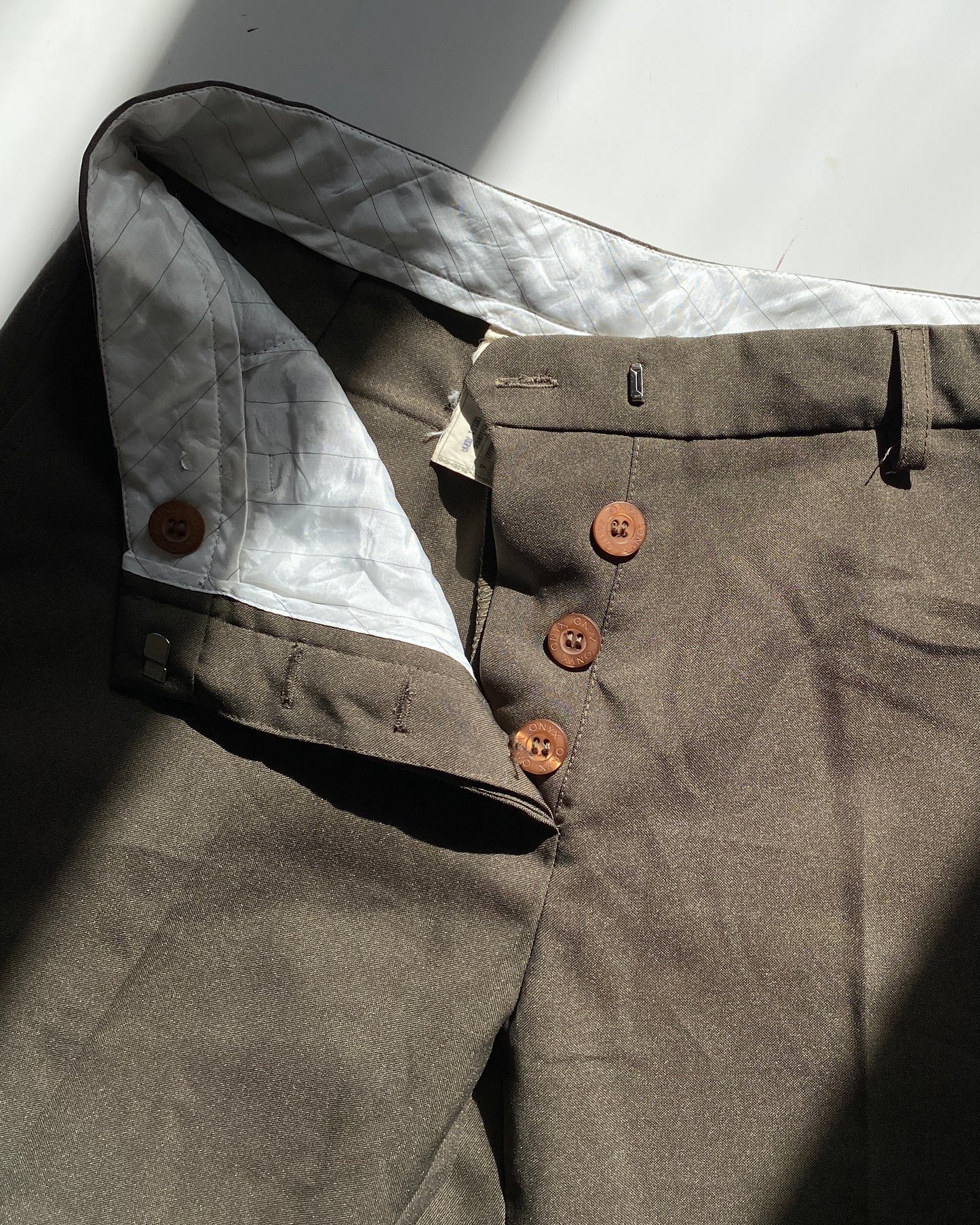 00s vintage khaki tailored straight leg trousers from the iconic y2k brand Onyx, mid-rise waist, 5buttons closure.