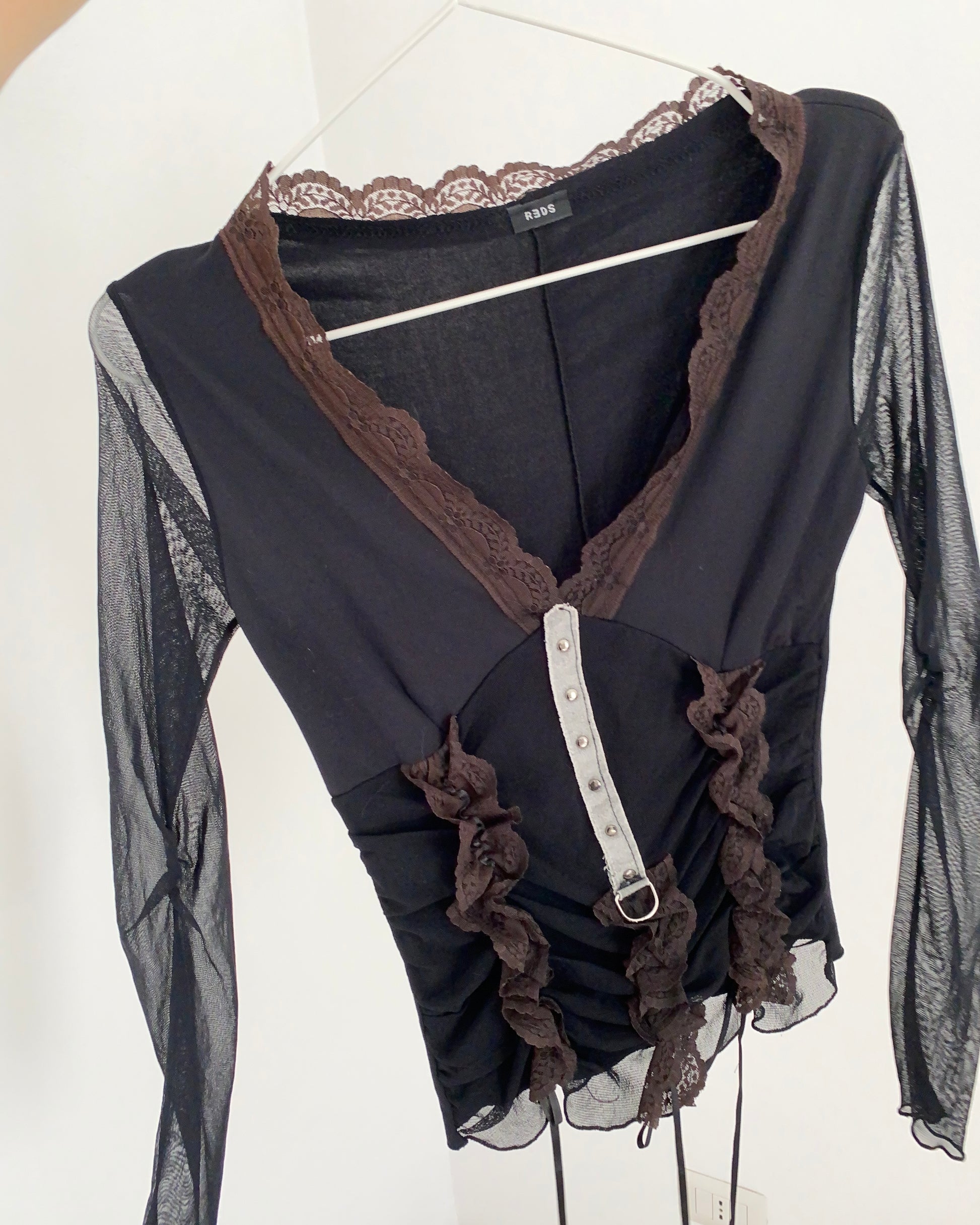the dreamiest top <3 Rare early 00s long sleeves top from the iconic brand REDS, double layered stretchy material, snug fit, micro tulle sleeves and lace details, deep plunge on the front. No size/composition label but would best fit size xs-s depending on the desired fit. Seen on a size S 1,68cm.