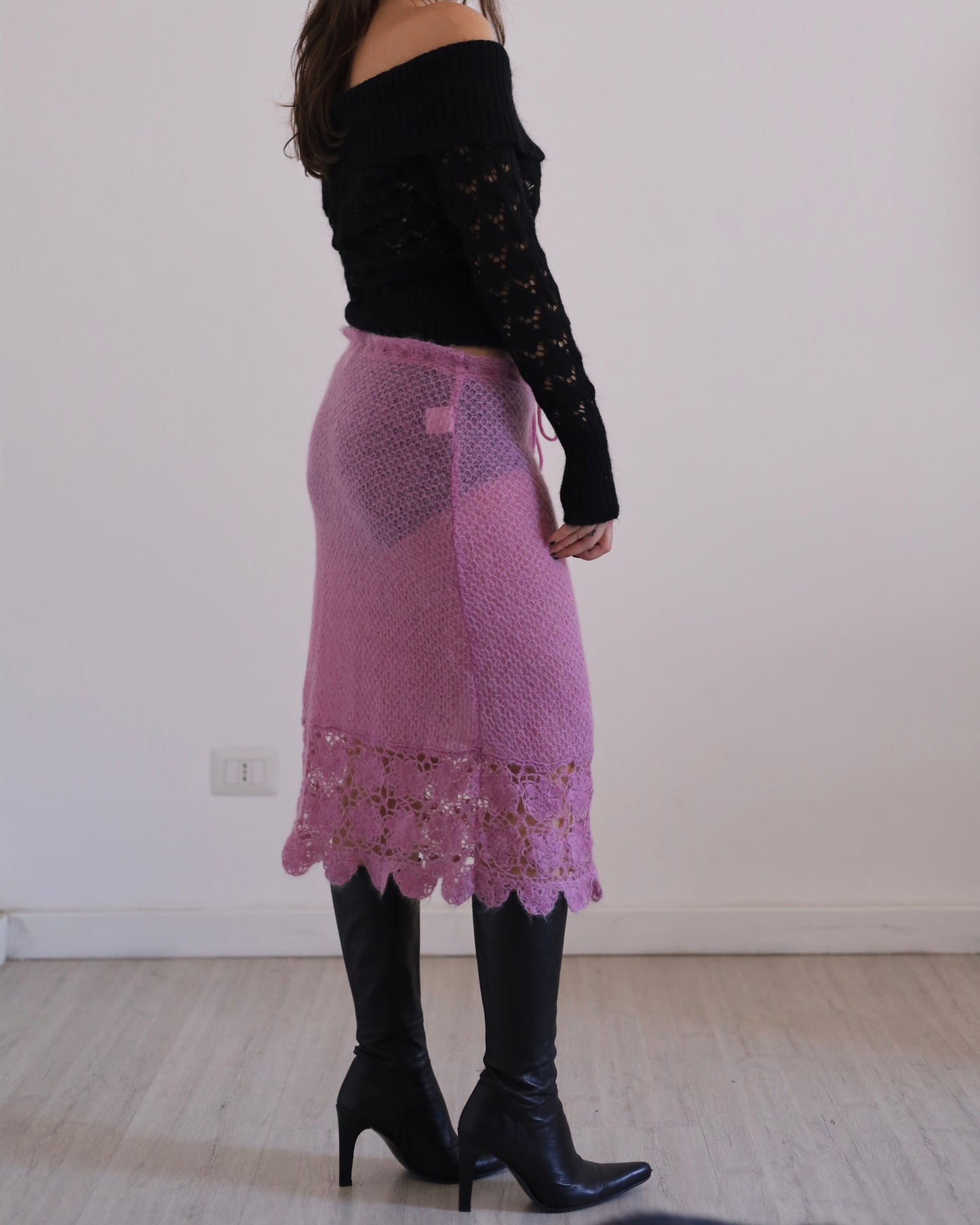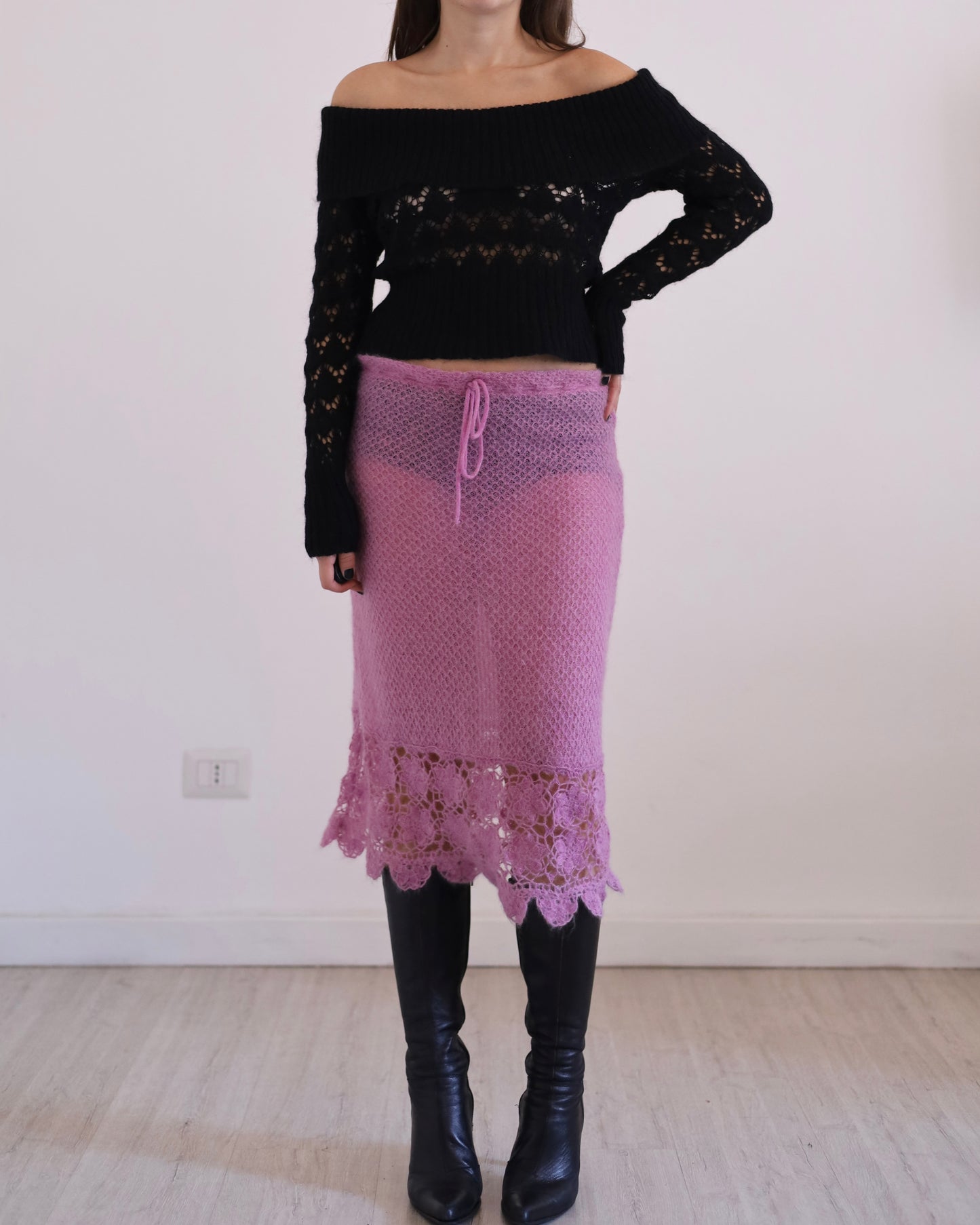 Adorable 00s vintage open-work off-the-shoulders knitted jumper. Care label is missing but it's definitely an acrylic/wool/nylon mix.
