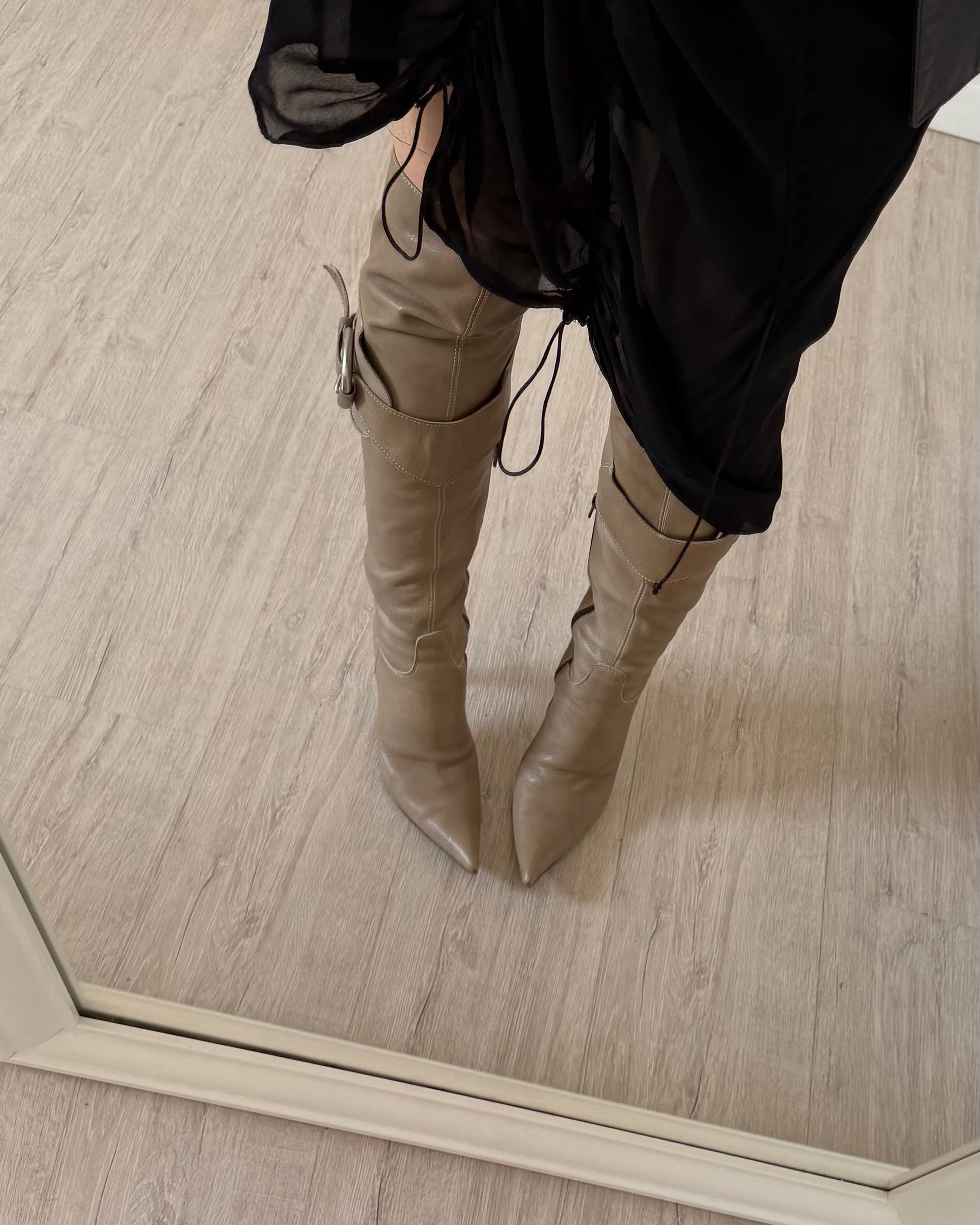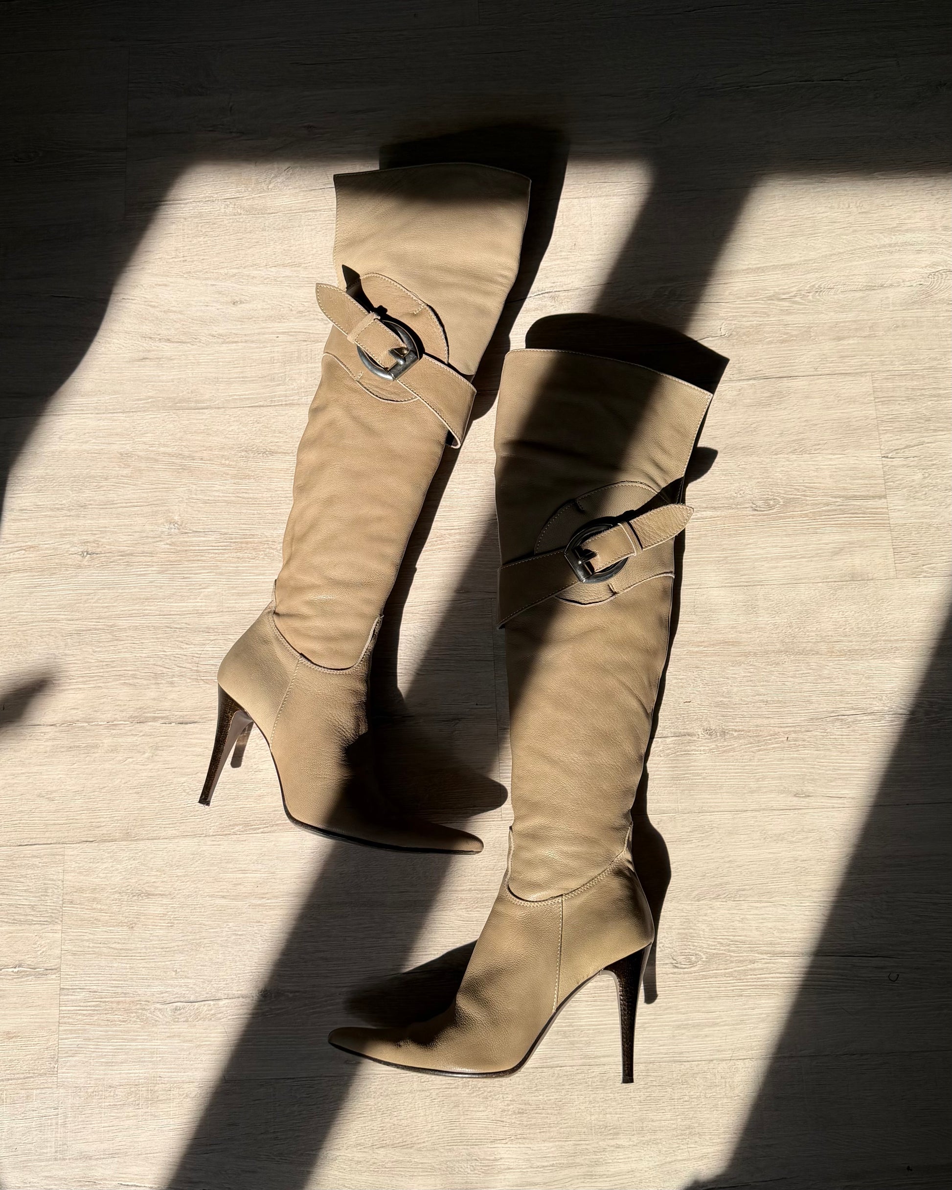 Meravigliosi stivali in pelle primi anni 2000 del designer Giancarlo Paoli, che realizzava calzature di lusso con pellami di altissima qualità. Stivale alto sopra al ginocchio che può essere indossato anche creando un risvolto sotto al ginocchio, chinghie laterali in metallo, punta affusolata, zip laterali.