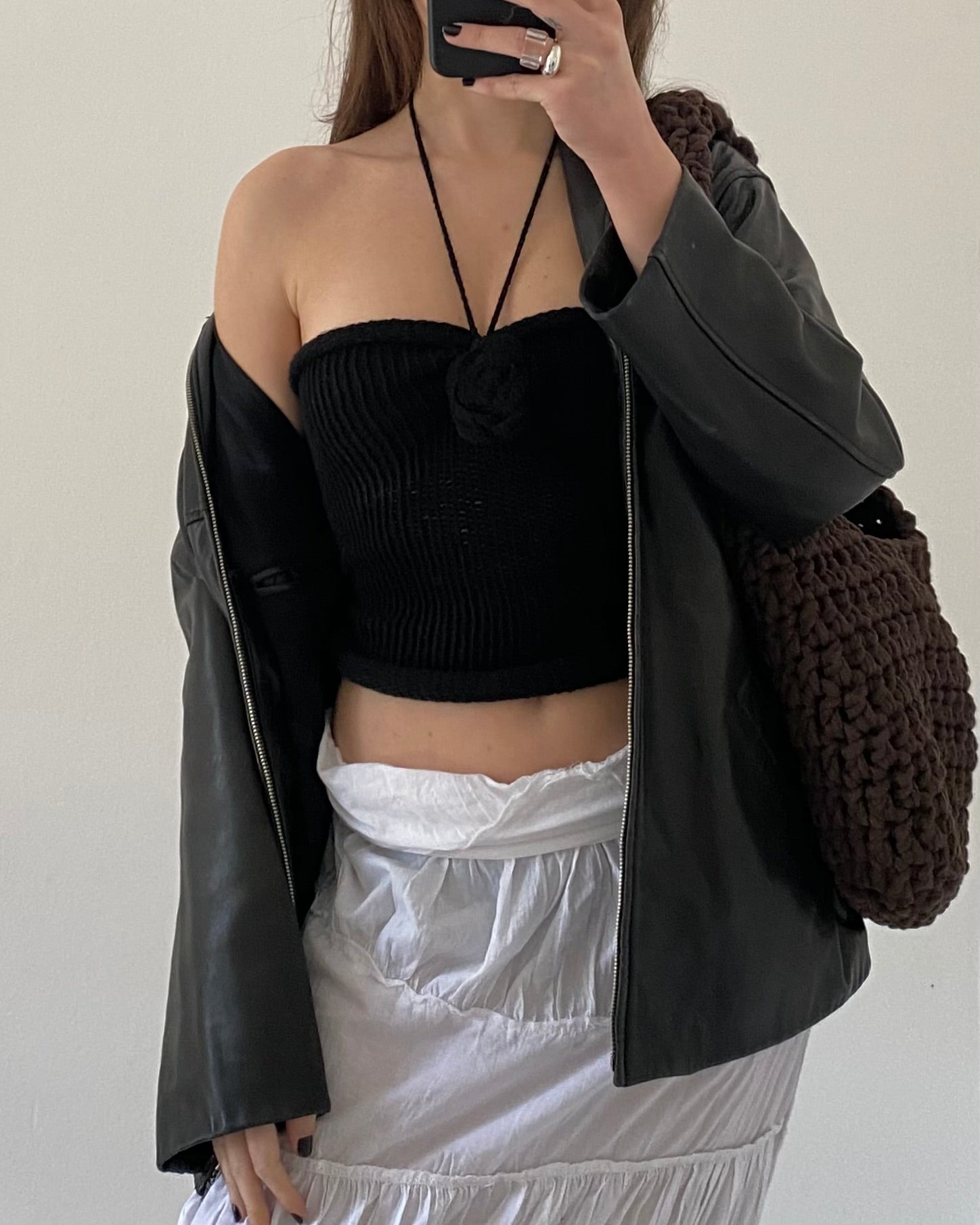 Meraviglioso top in maglia senza spalline con dettaglio fiore all'uncinetto e laccetti ultra sottili da indossare in modi diversi.