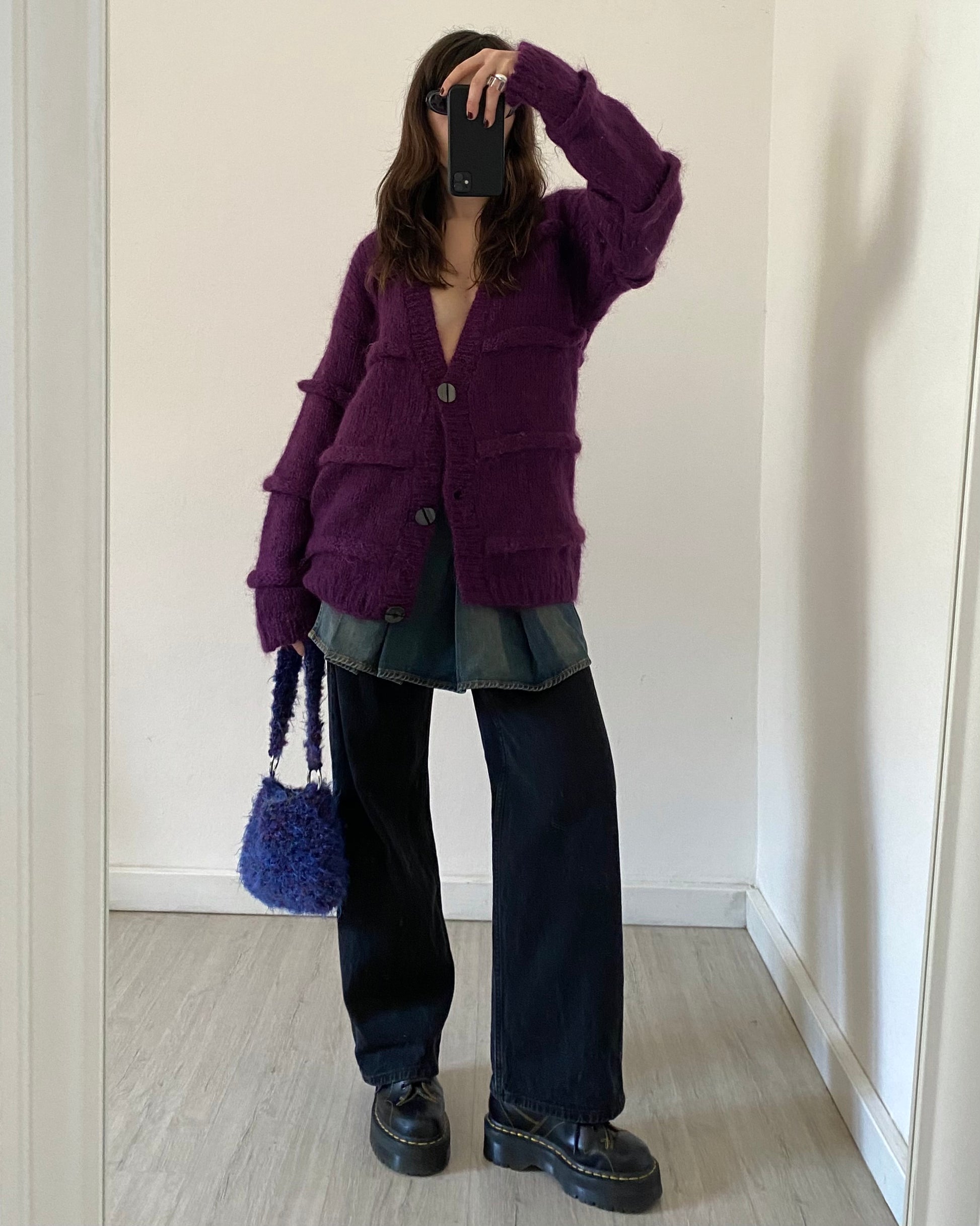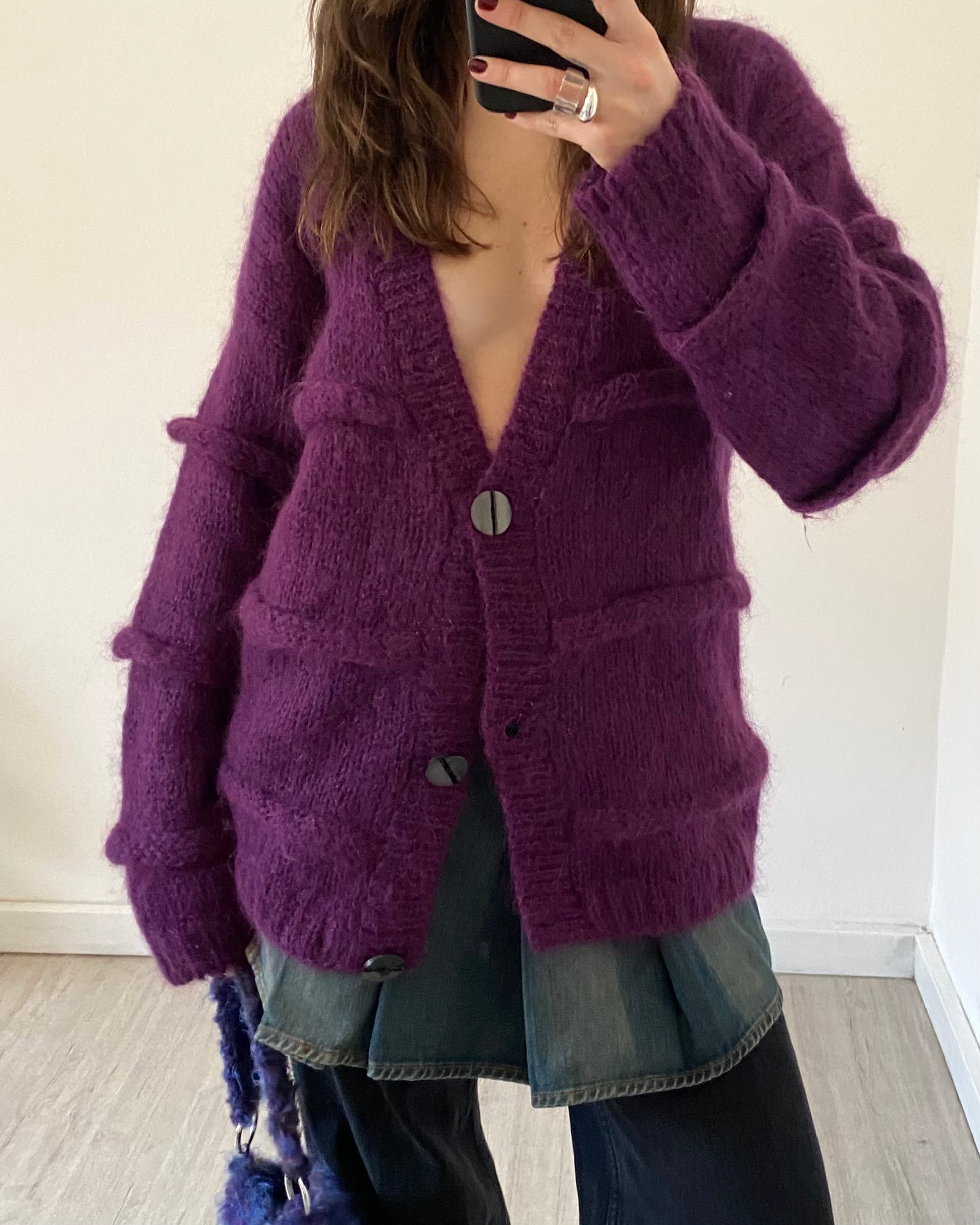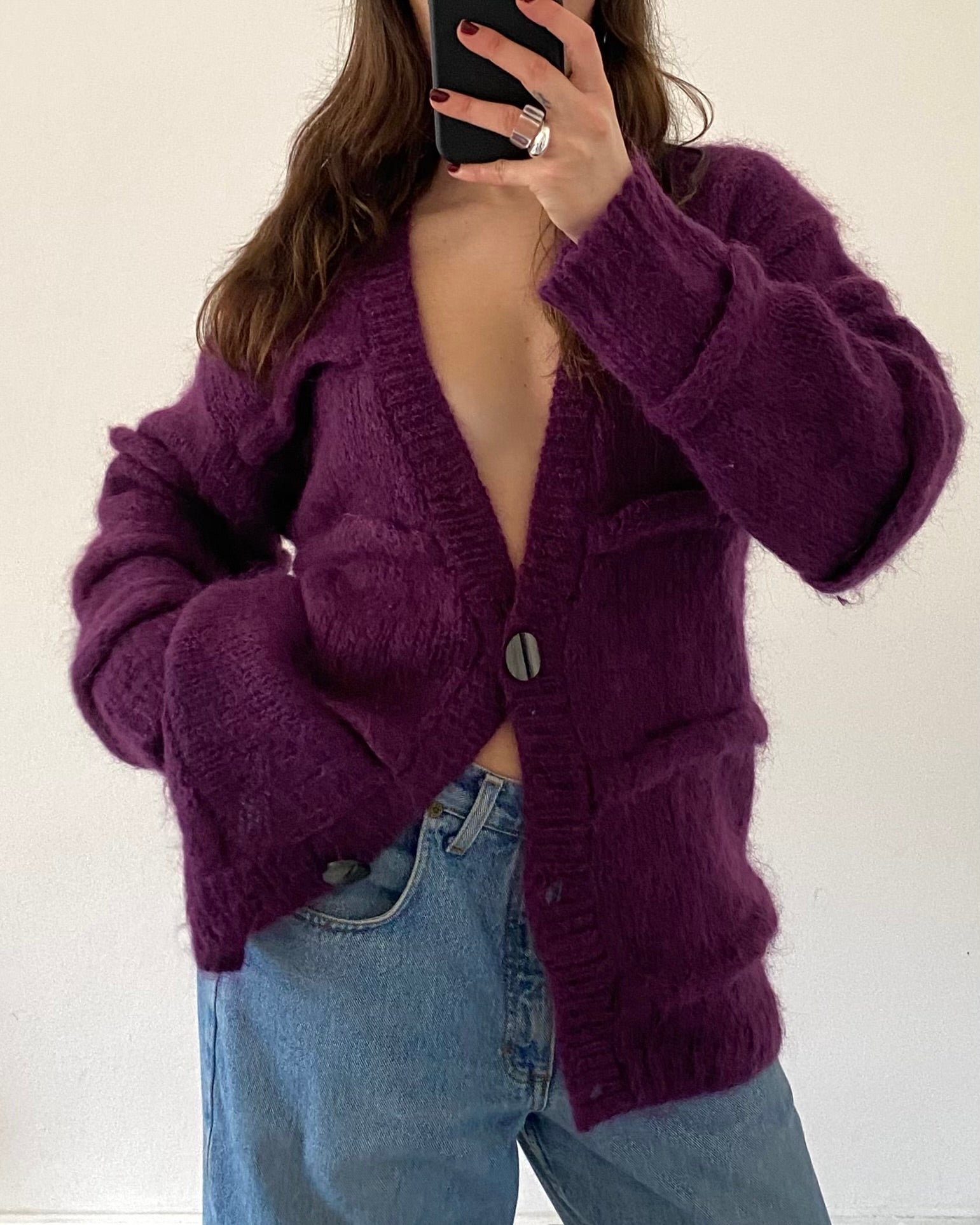 Meraviglioso cardigan in lana chunky, scollo a V, intreccio spesso, si tratta di un misto lana e lana mohair che lo rende super caldo, qualità eccezionale.