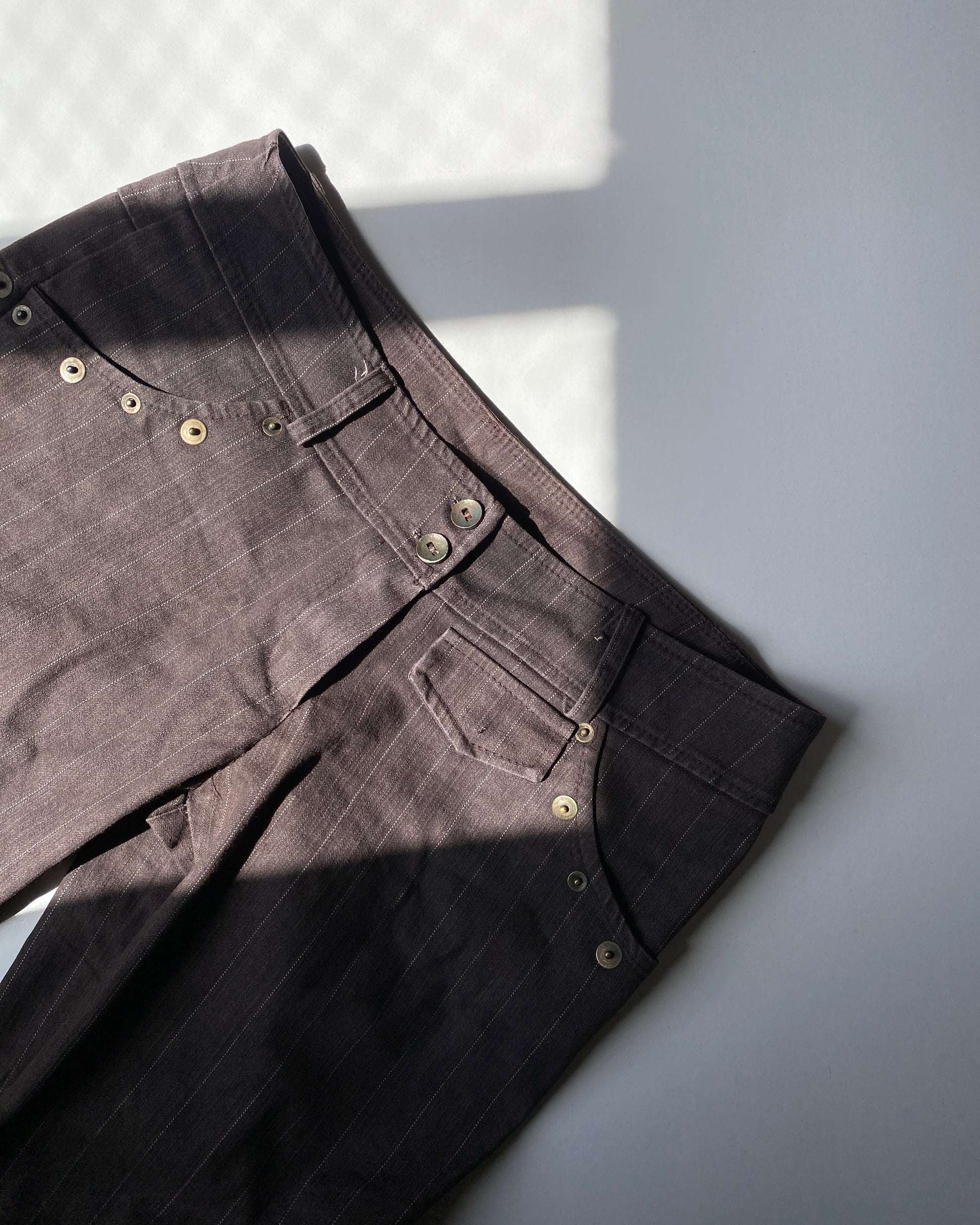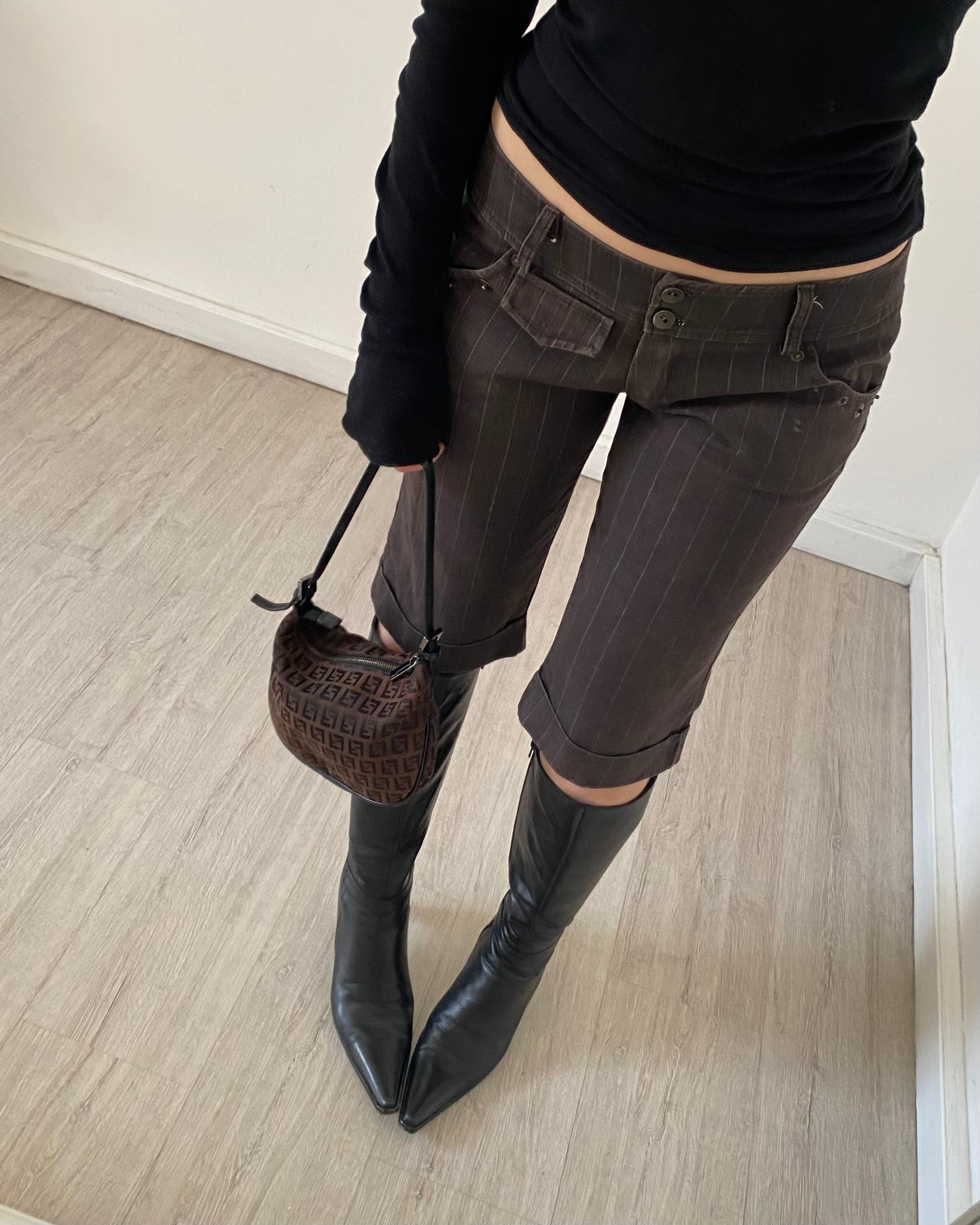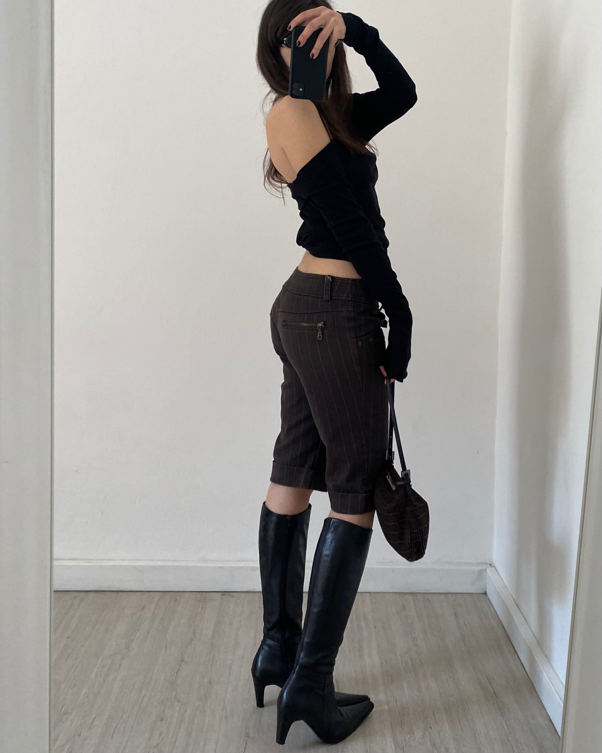 Meravigliosi bermuda anni 2000, denim morbido ed elasticizzato, vita medio-bassa, motivo gessato.