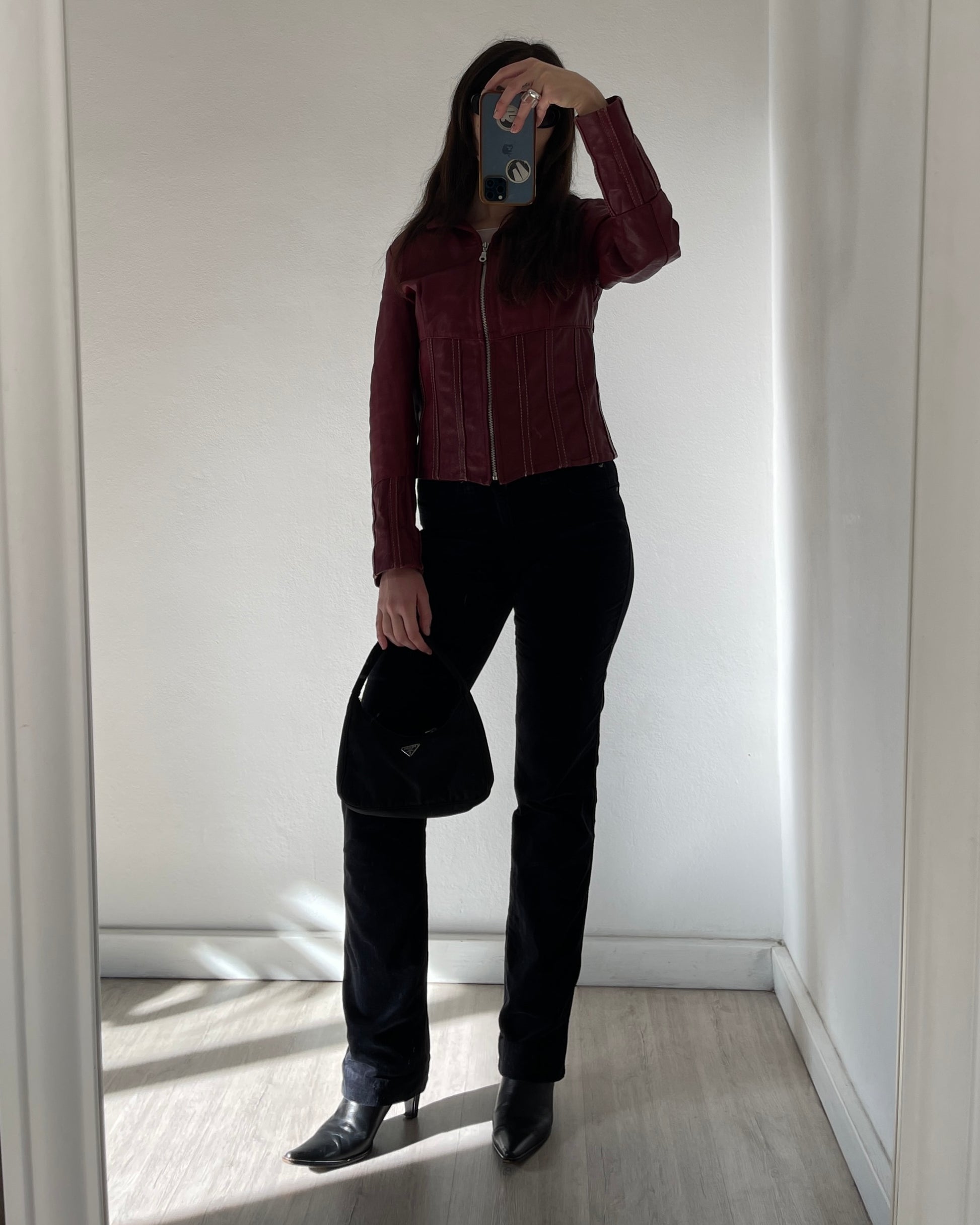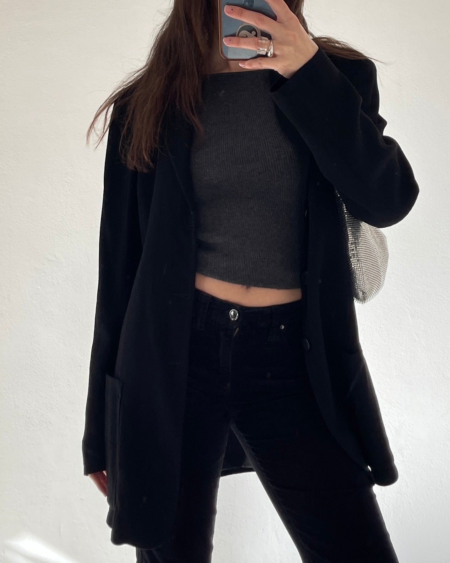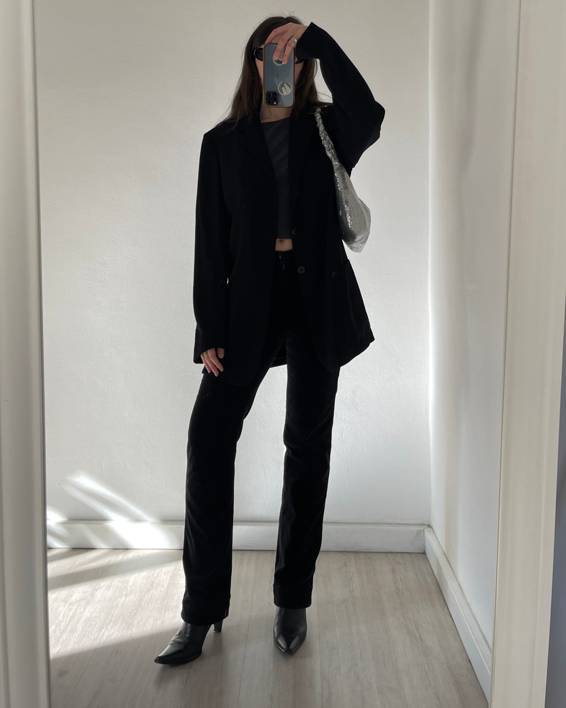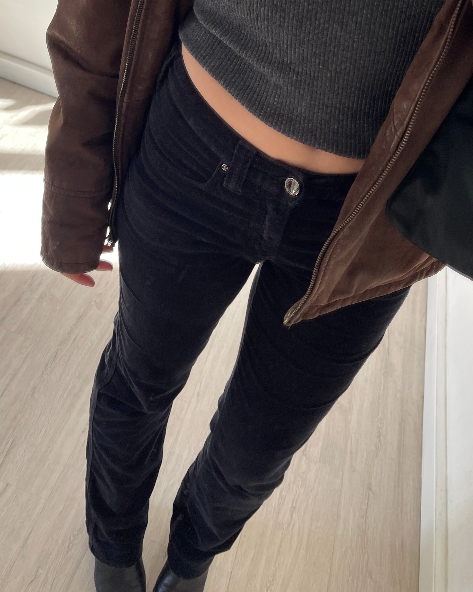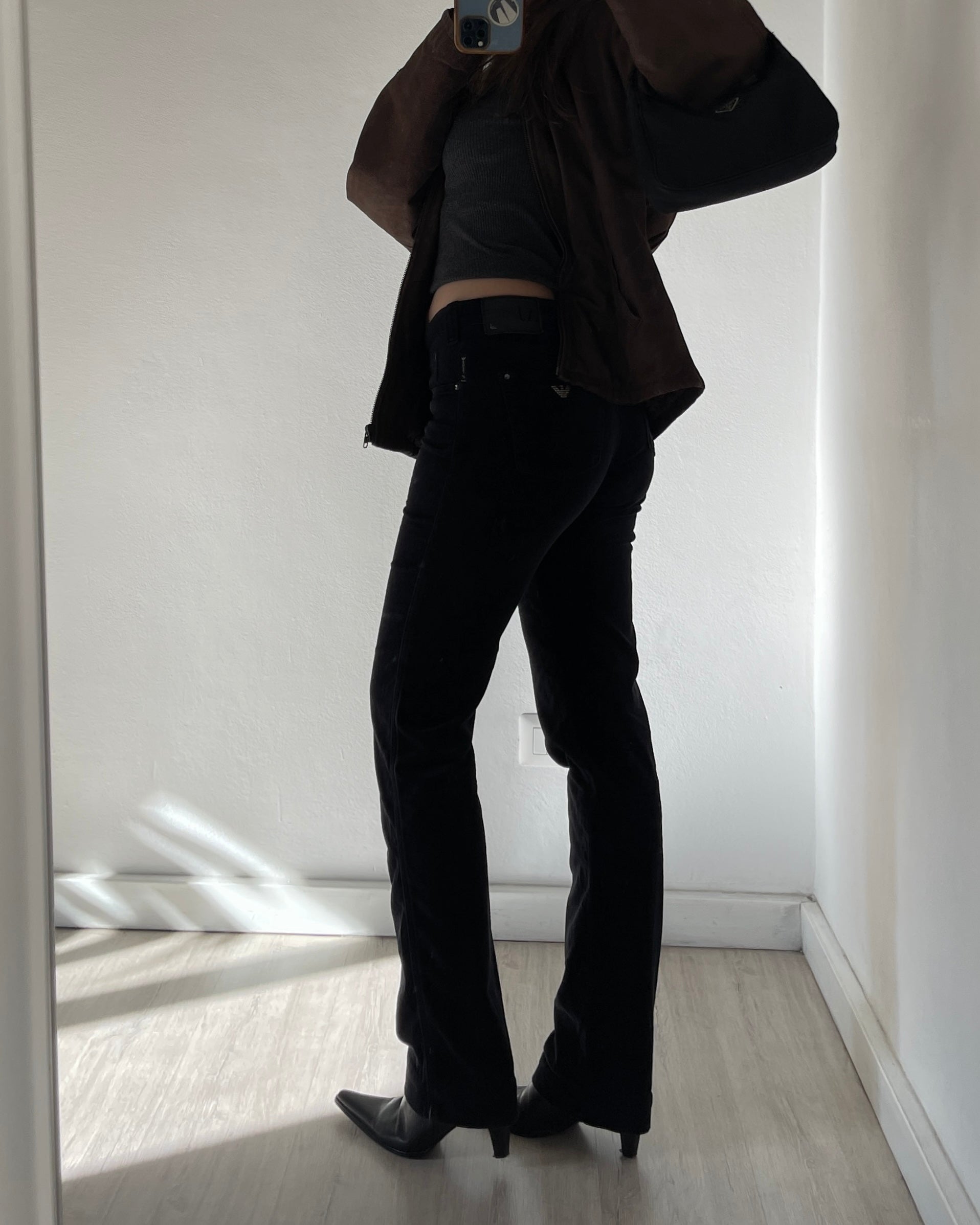 Pantaloni Armani jeans in velluto nero, vita medio-bassa, taglio bootcut dritto leggermente svasato sulla caviglia, logo Armani sul retro e sul taschino, fit avvolgente ma confortevole.