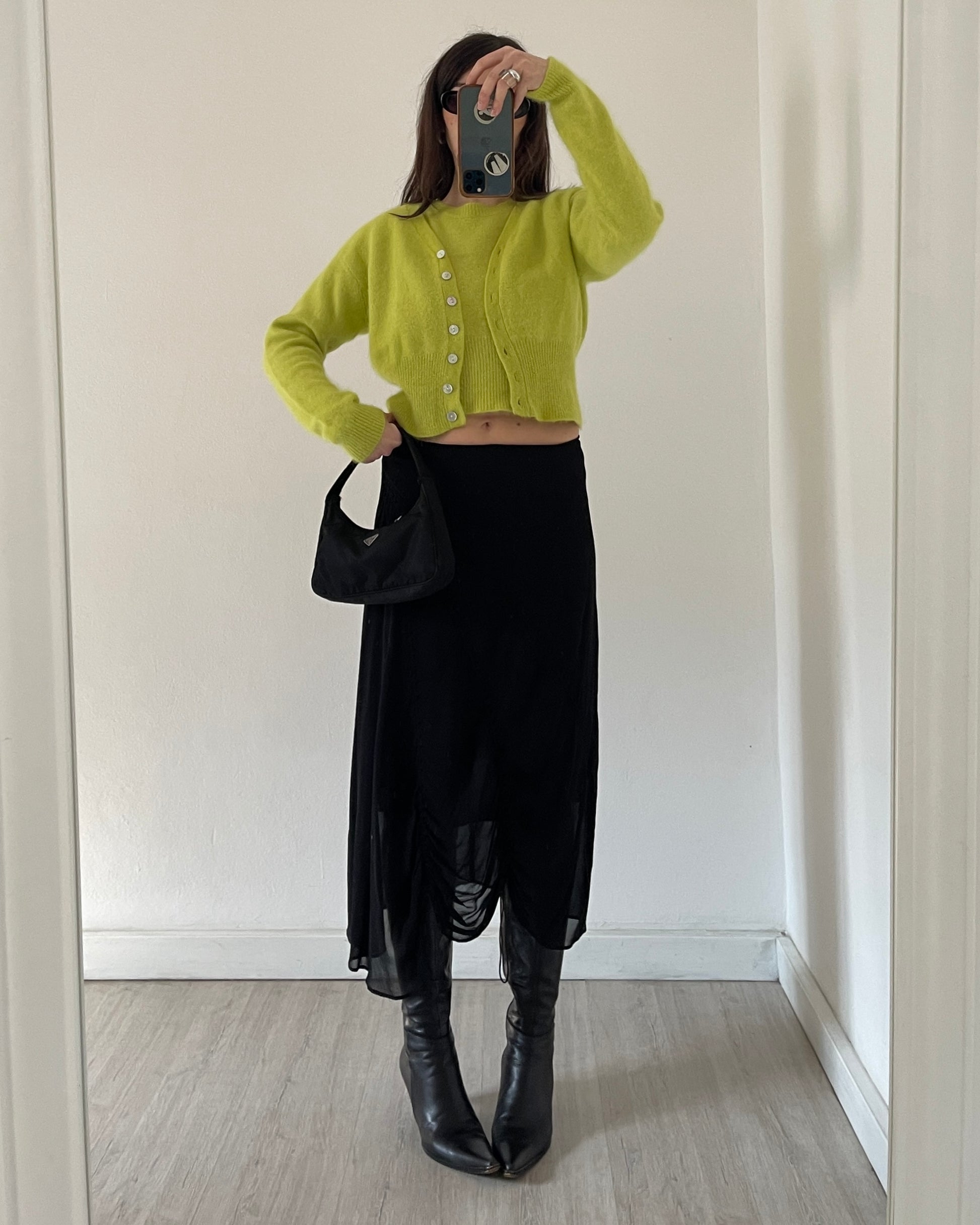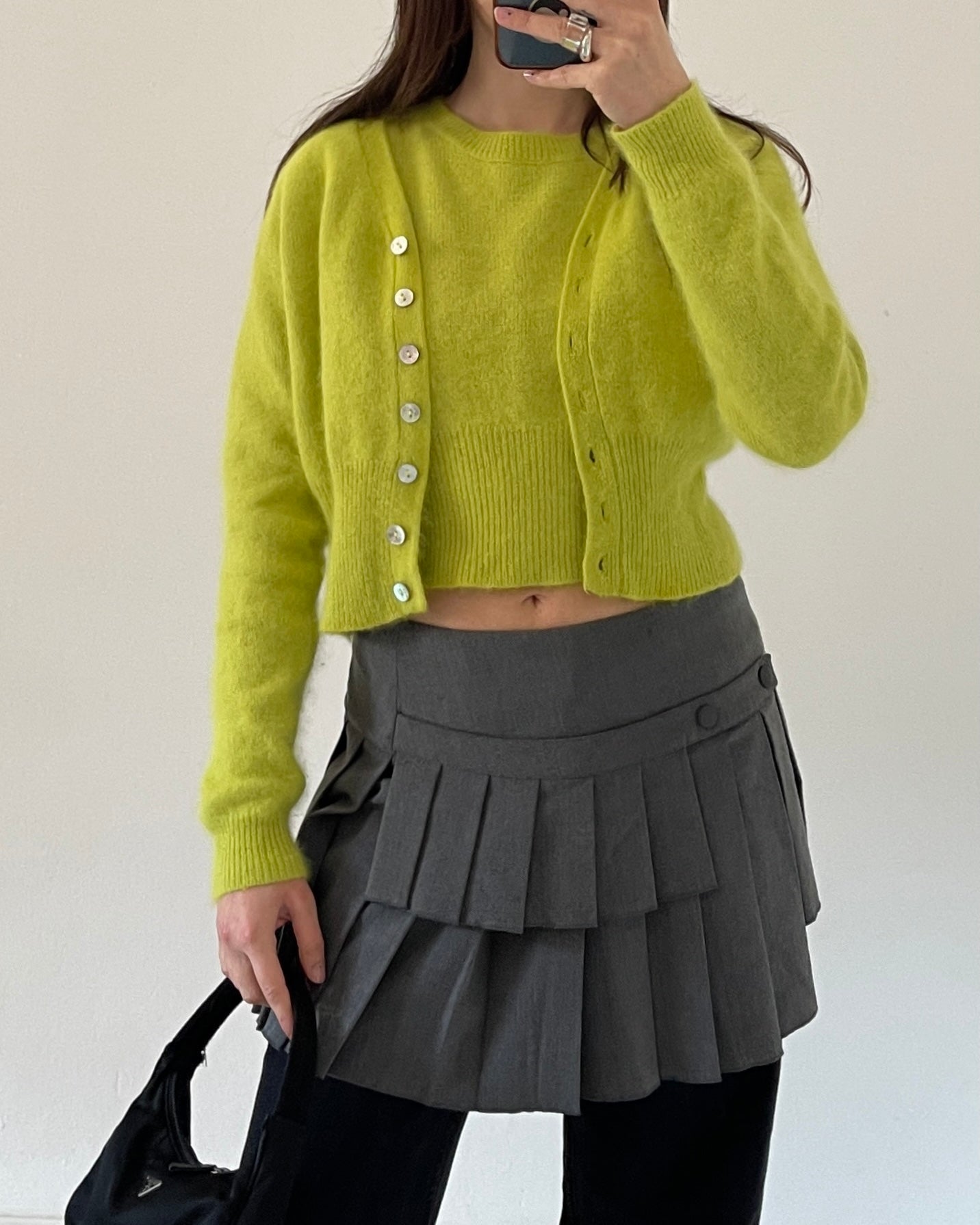 Meraviglioso twin-set vintage primi anni 90 in angora composto da top manica corta e cardigan coordinato, perfetti da indossare anche separatamente. Pregiata lana angora, morbida come una nuvola e caldissima. Gemma rara degli anni 90, qualità altissima (si riflette nel prezzo).