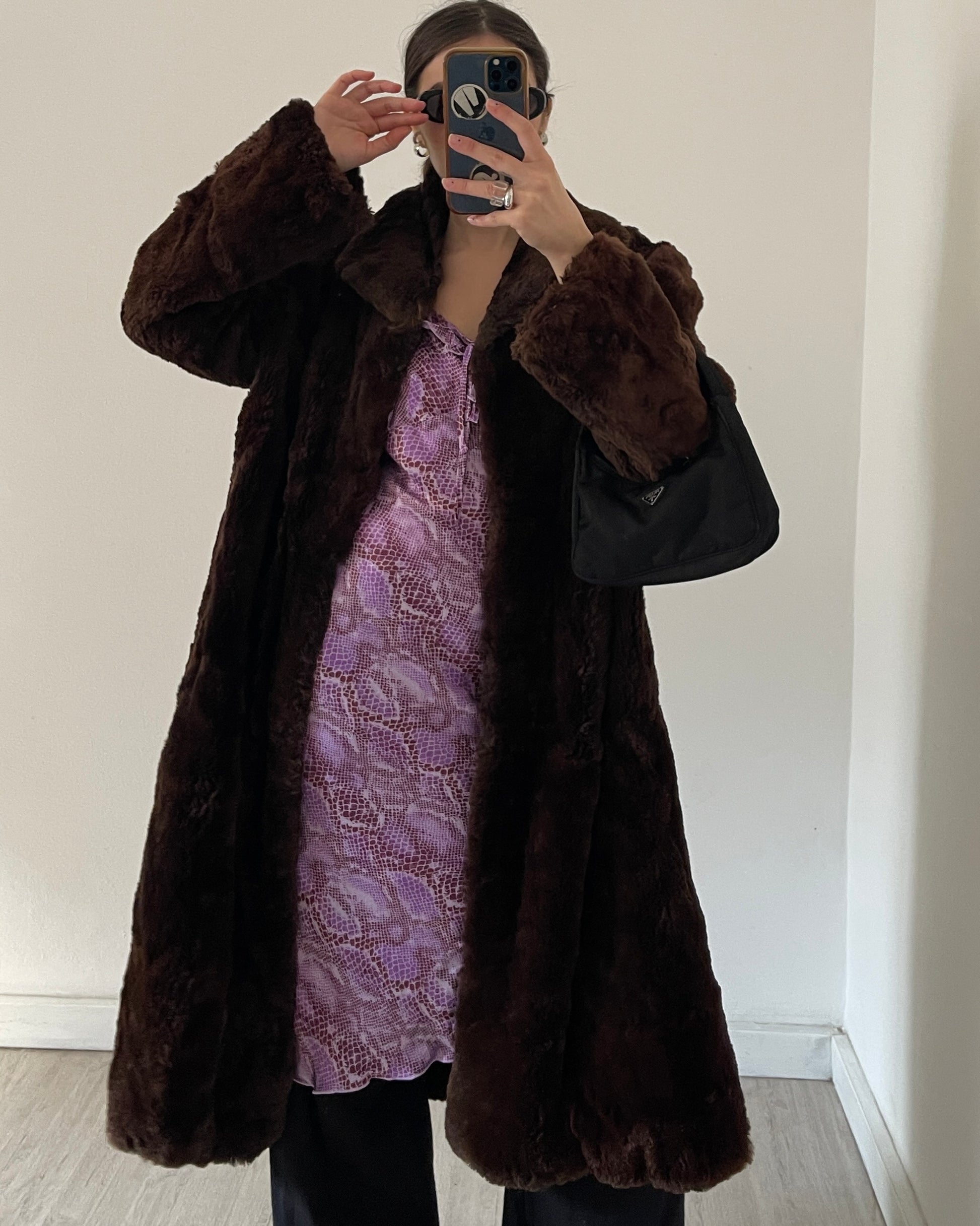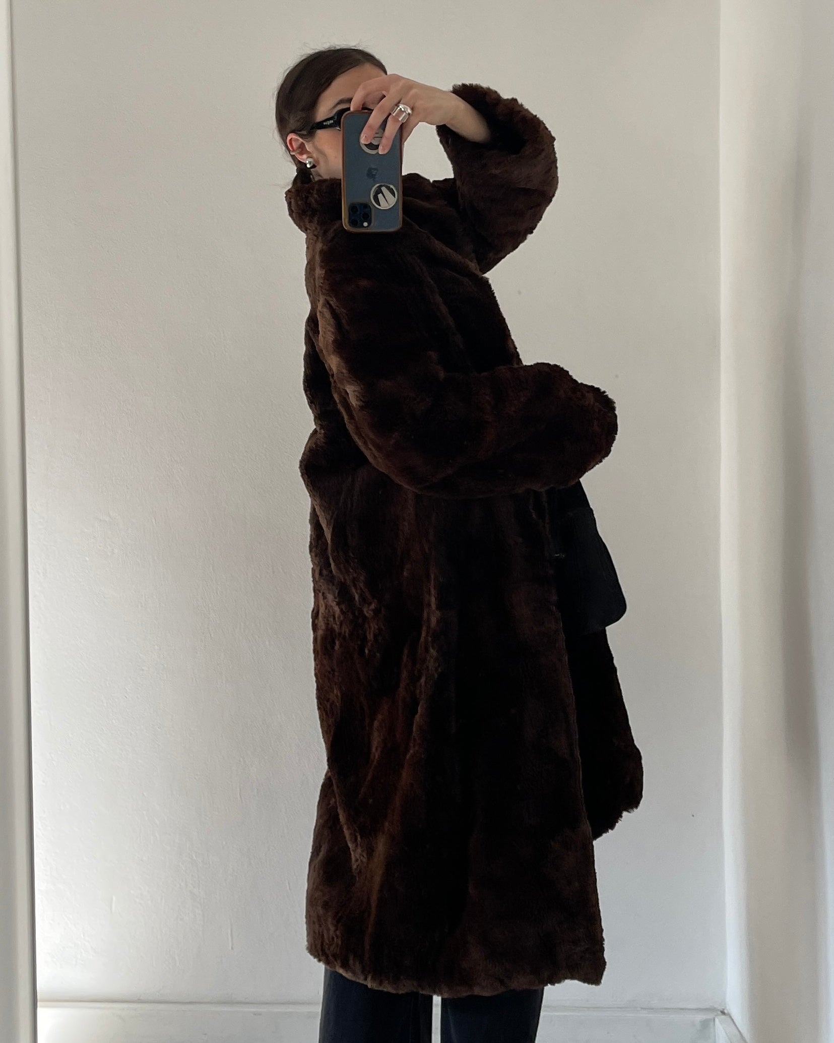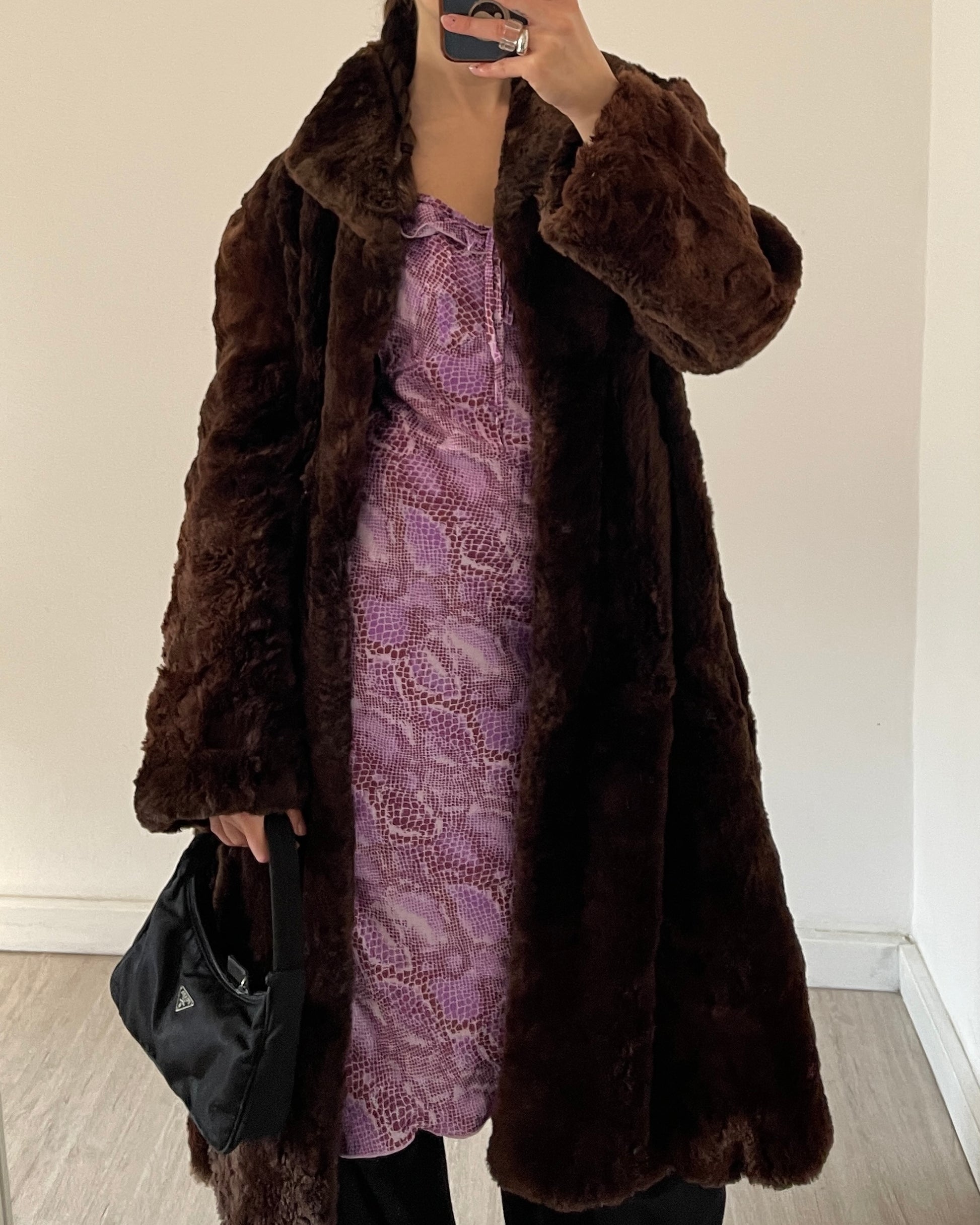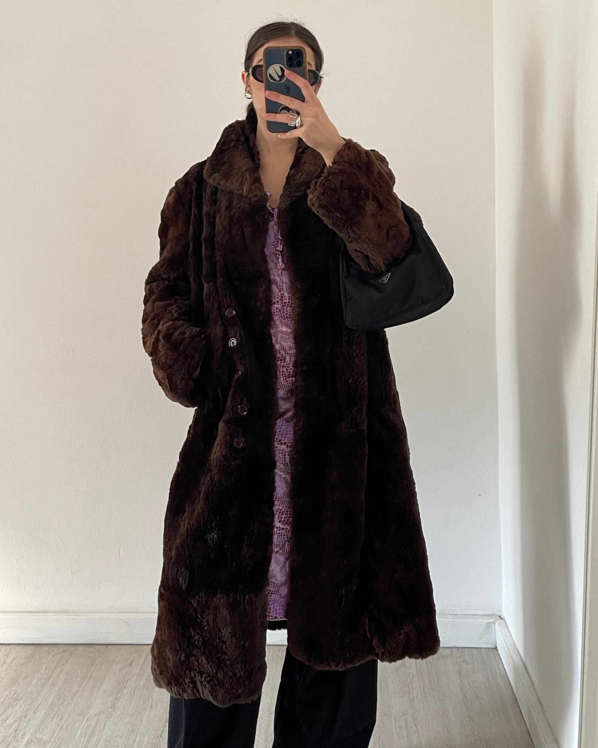 Meravigliosa eco pelliccia vintage anni 90, fodera interna, taglio dritto leggermente svasato sul fondo, chiusura con bottoni, lunghezza al polpaccio. Colore: marrone scuro.