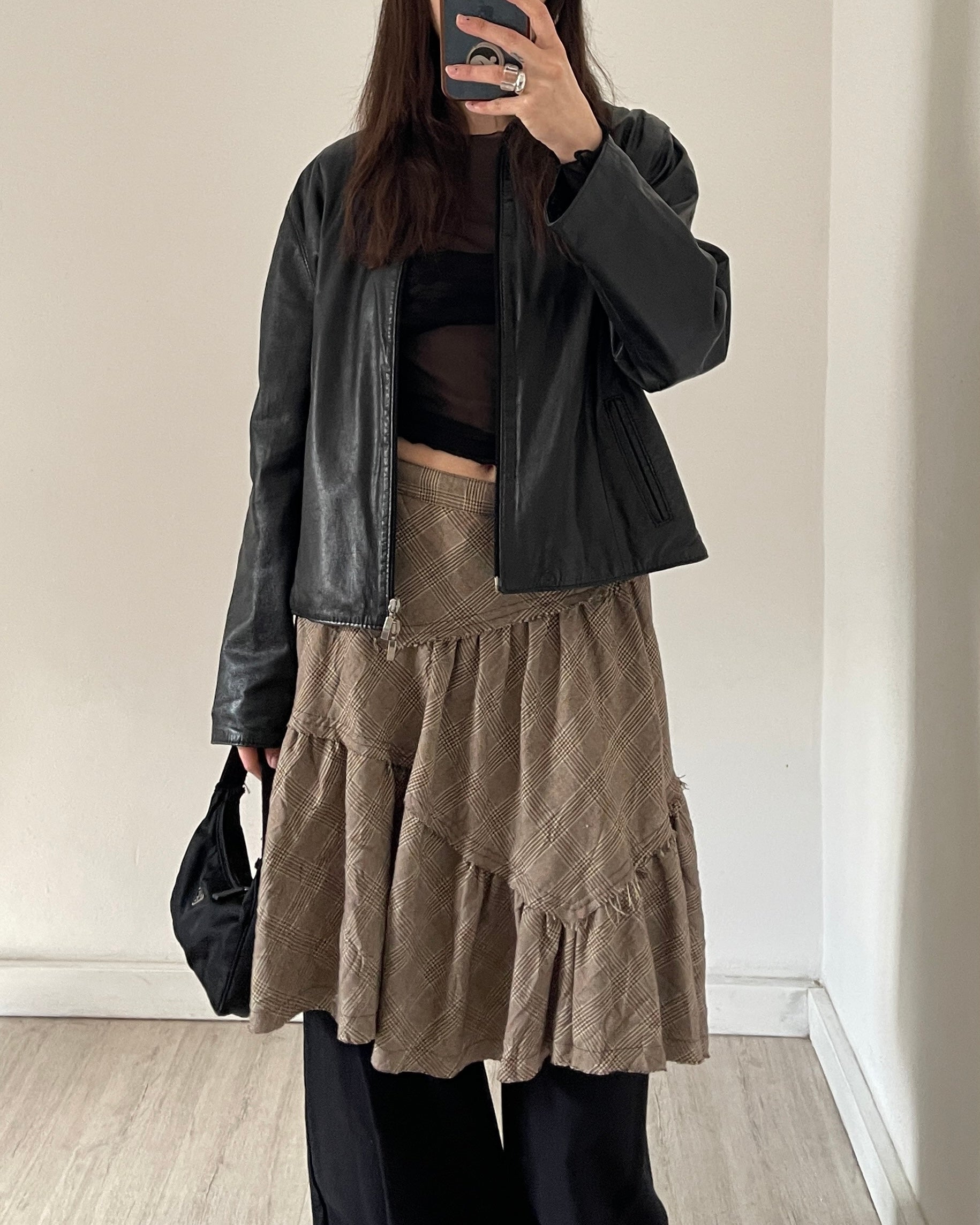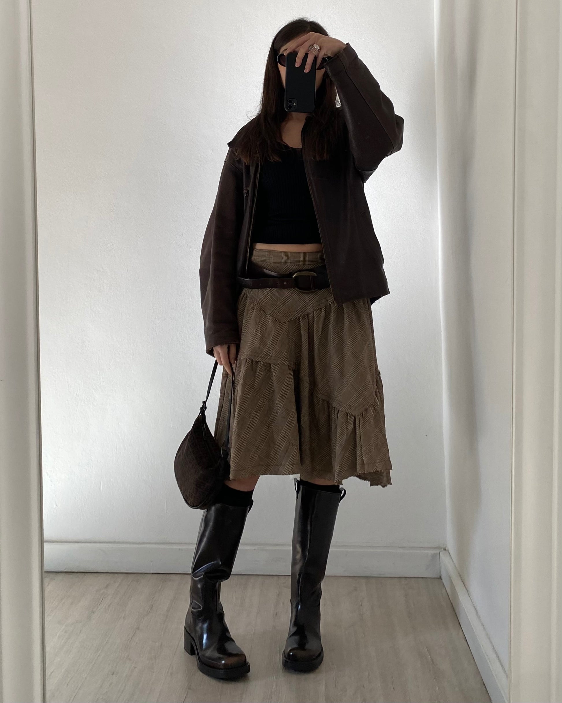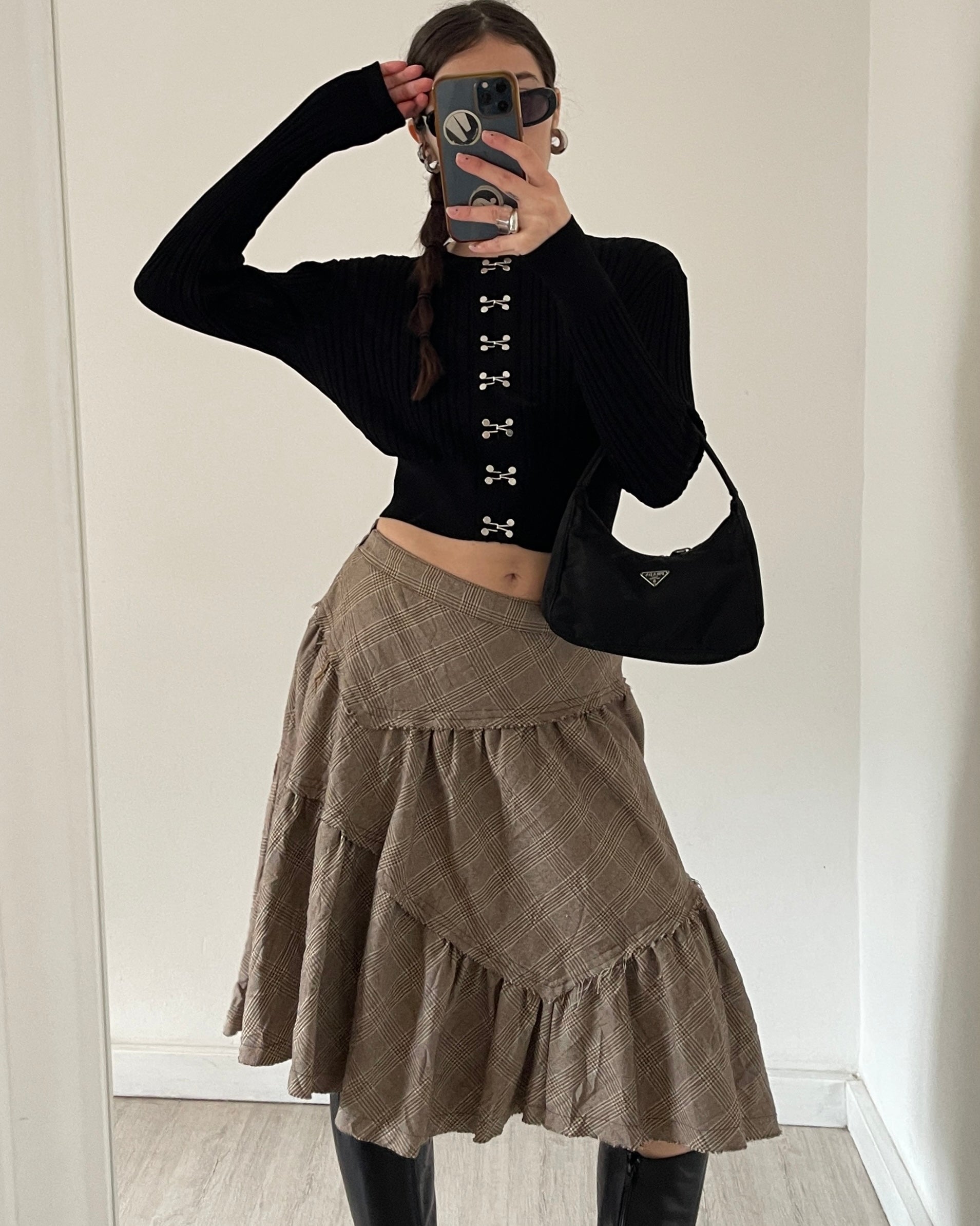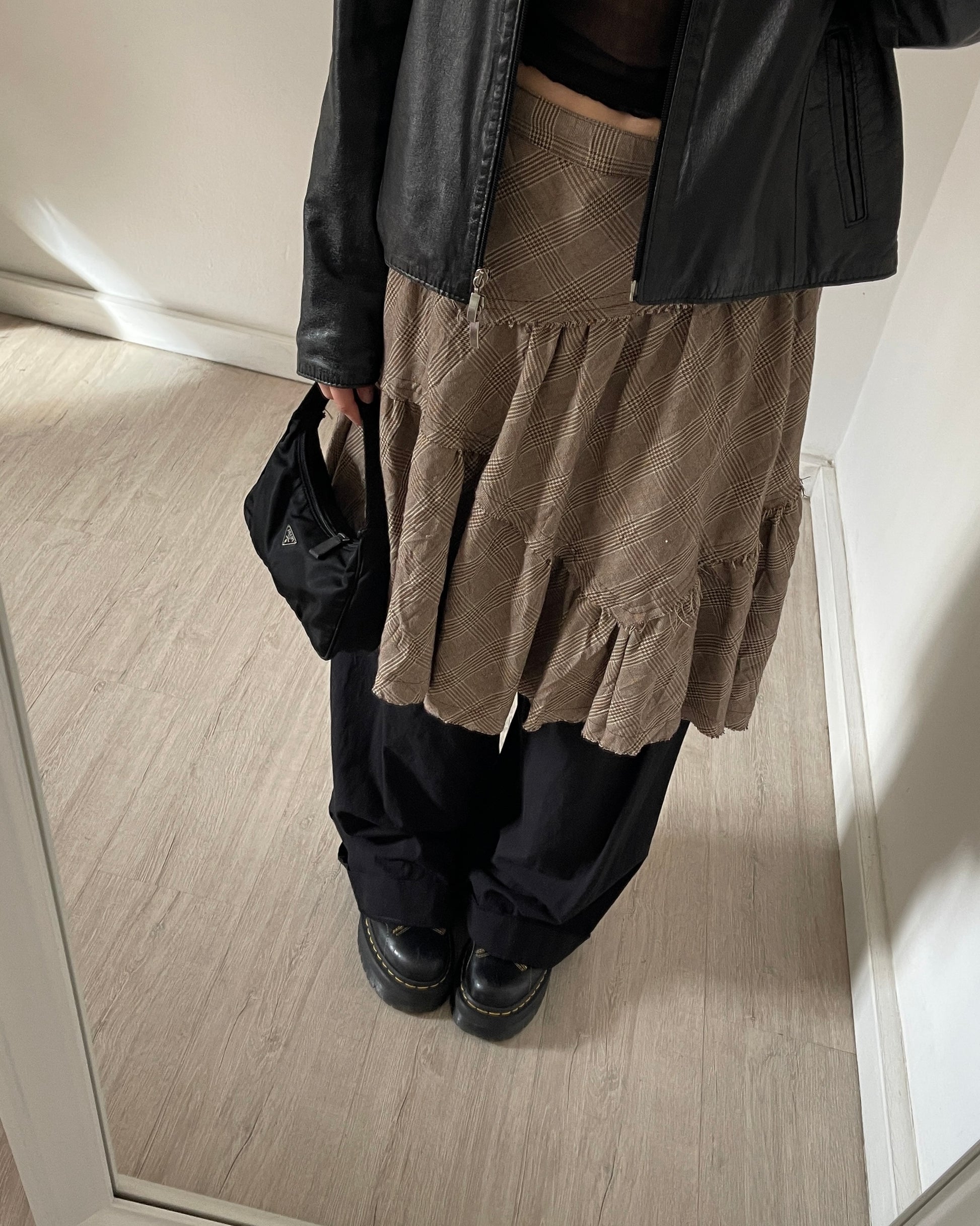 Meravigliosa gonna anni 2000 a balze con motivo tartan/quadrettato, vita media, chiusura con zip, taglio ampio.
