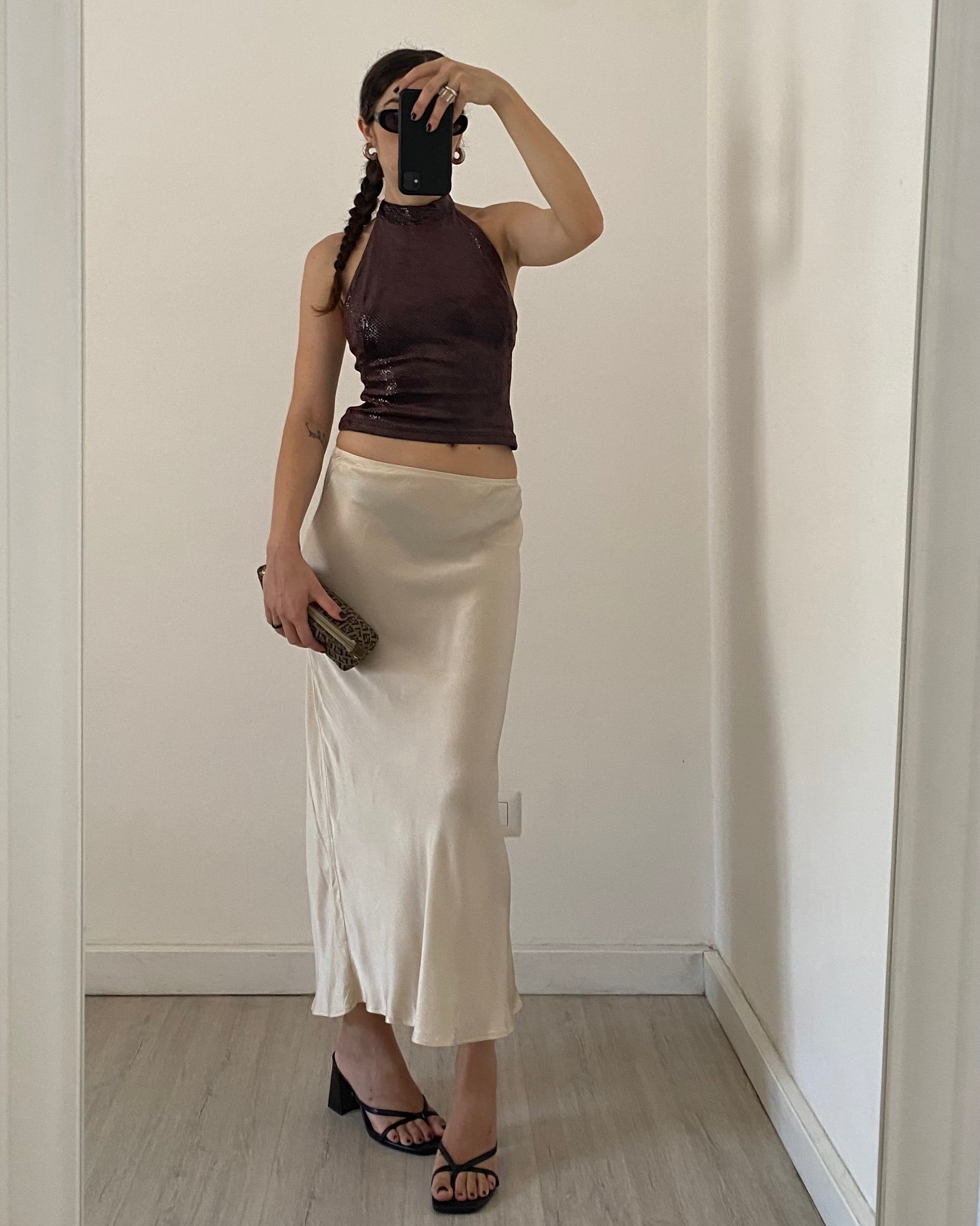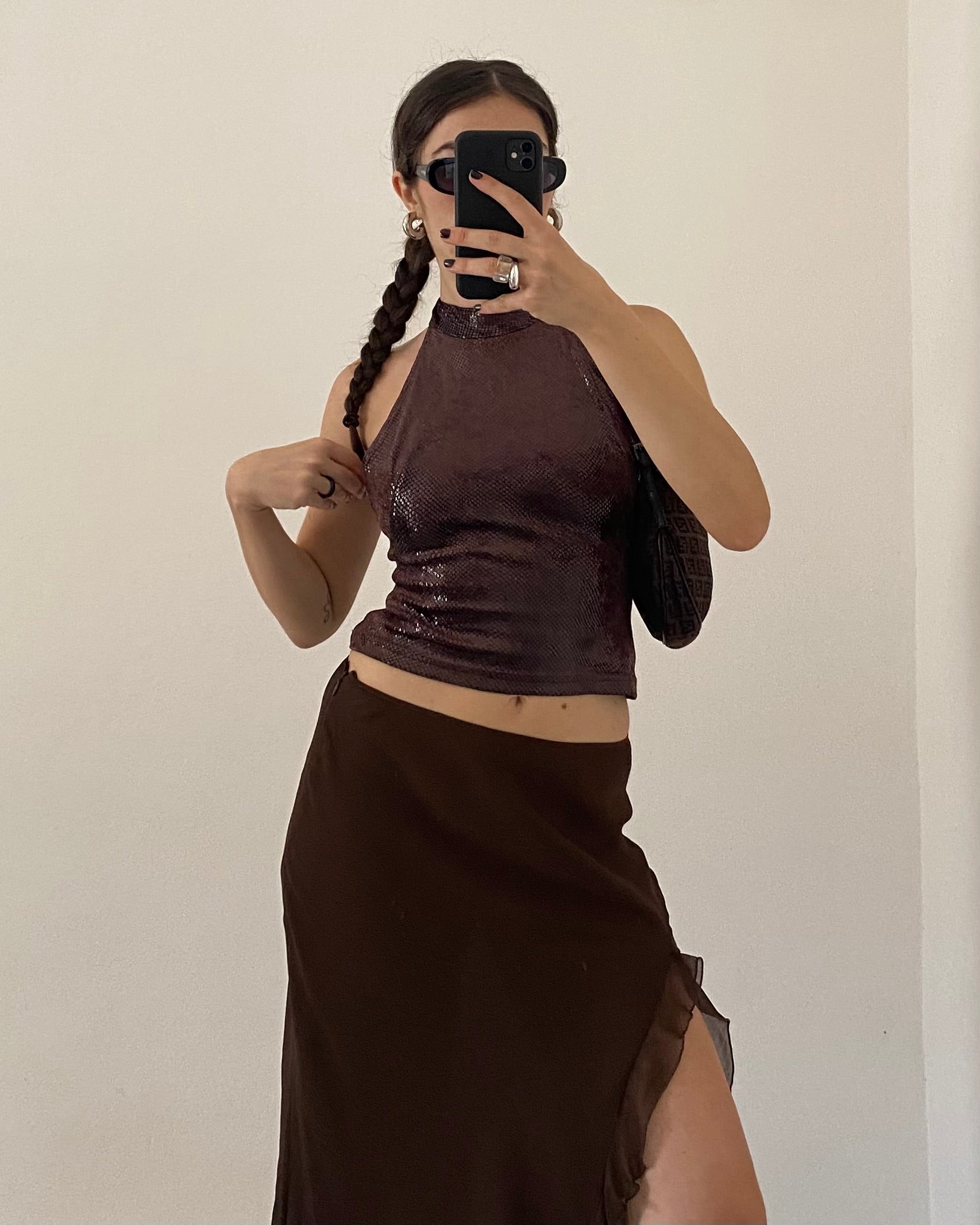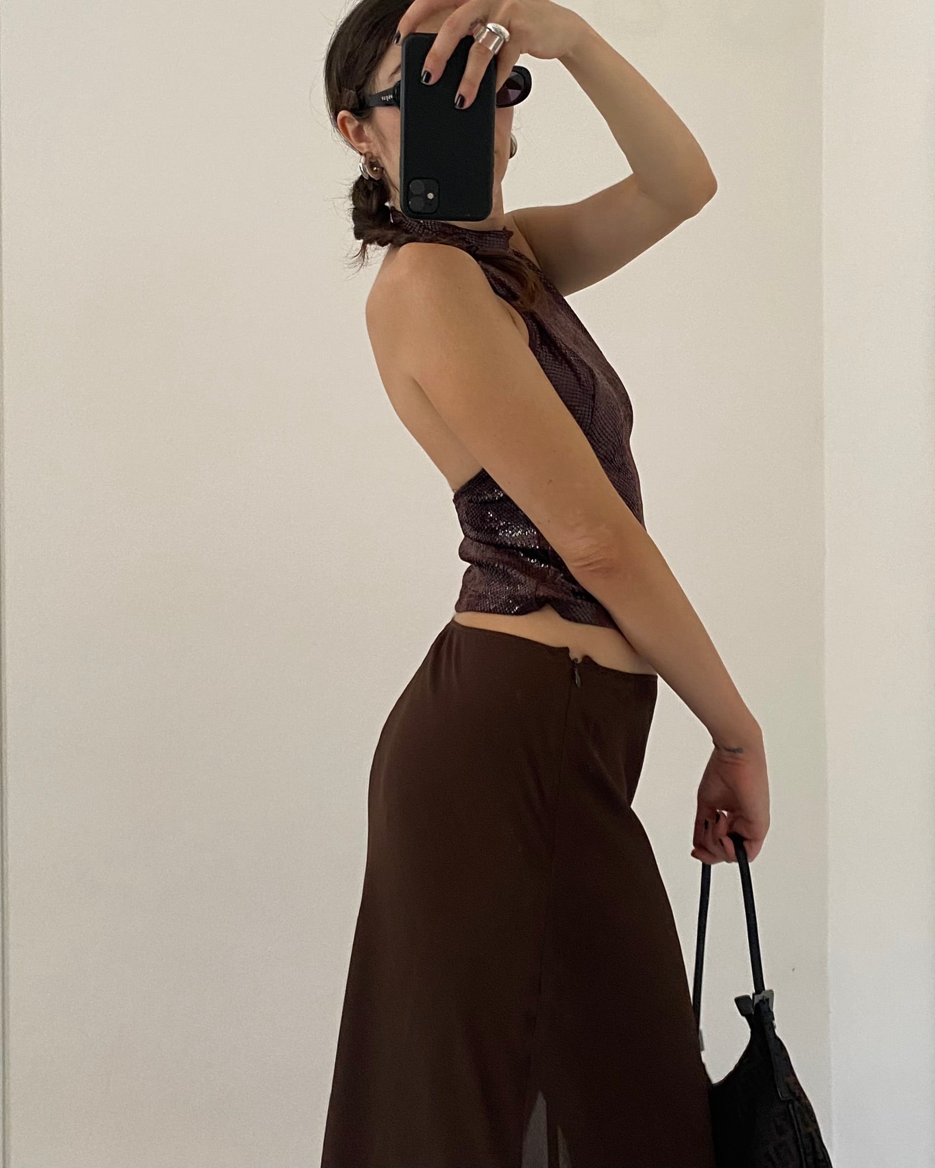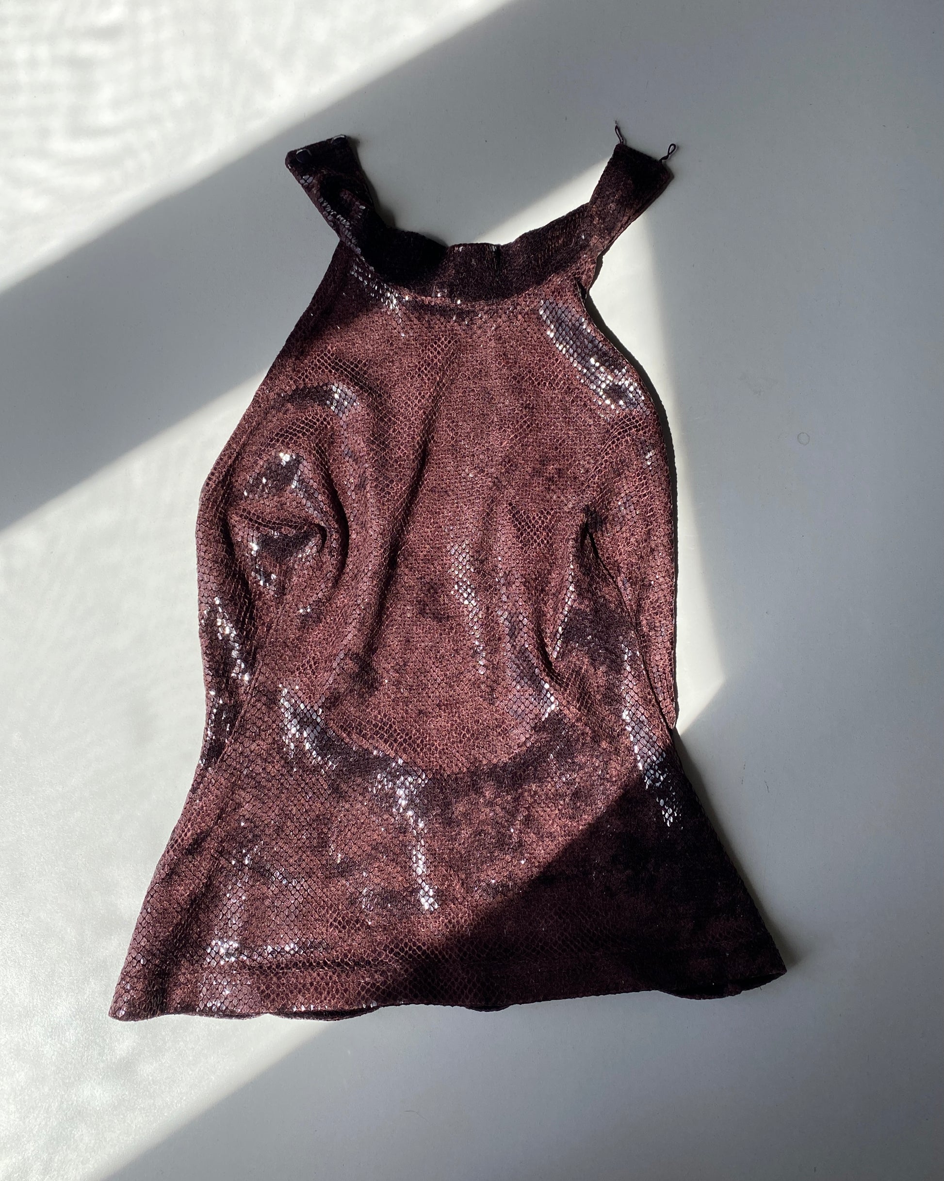 Meraviglioso top primi anni 200 con collo halter, schiena scoperta, tessuto effetto pitonato semi lucido, chiusura dietro il collo con gancetti, vesibilità fantastica. Pazzesko, lo amo.