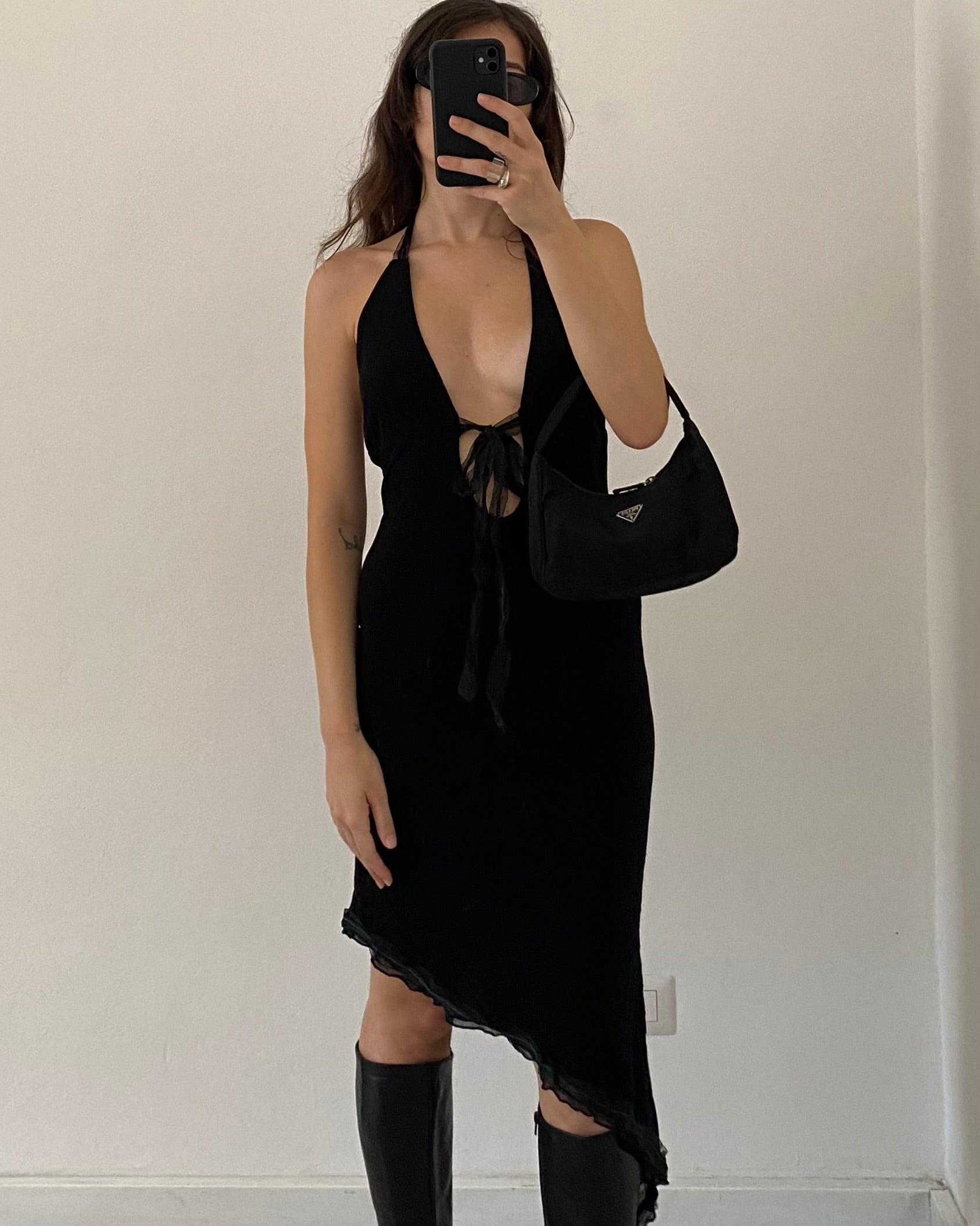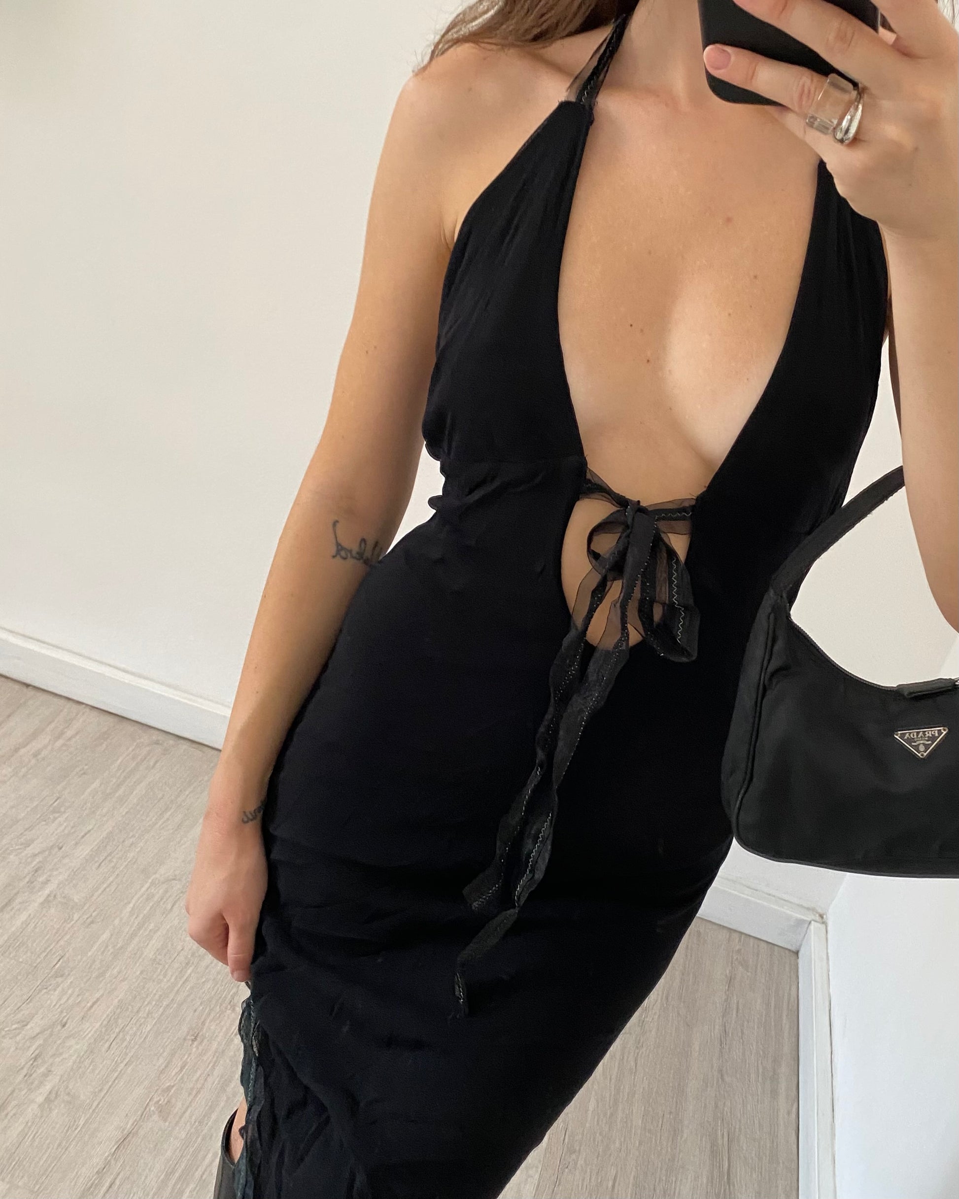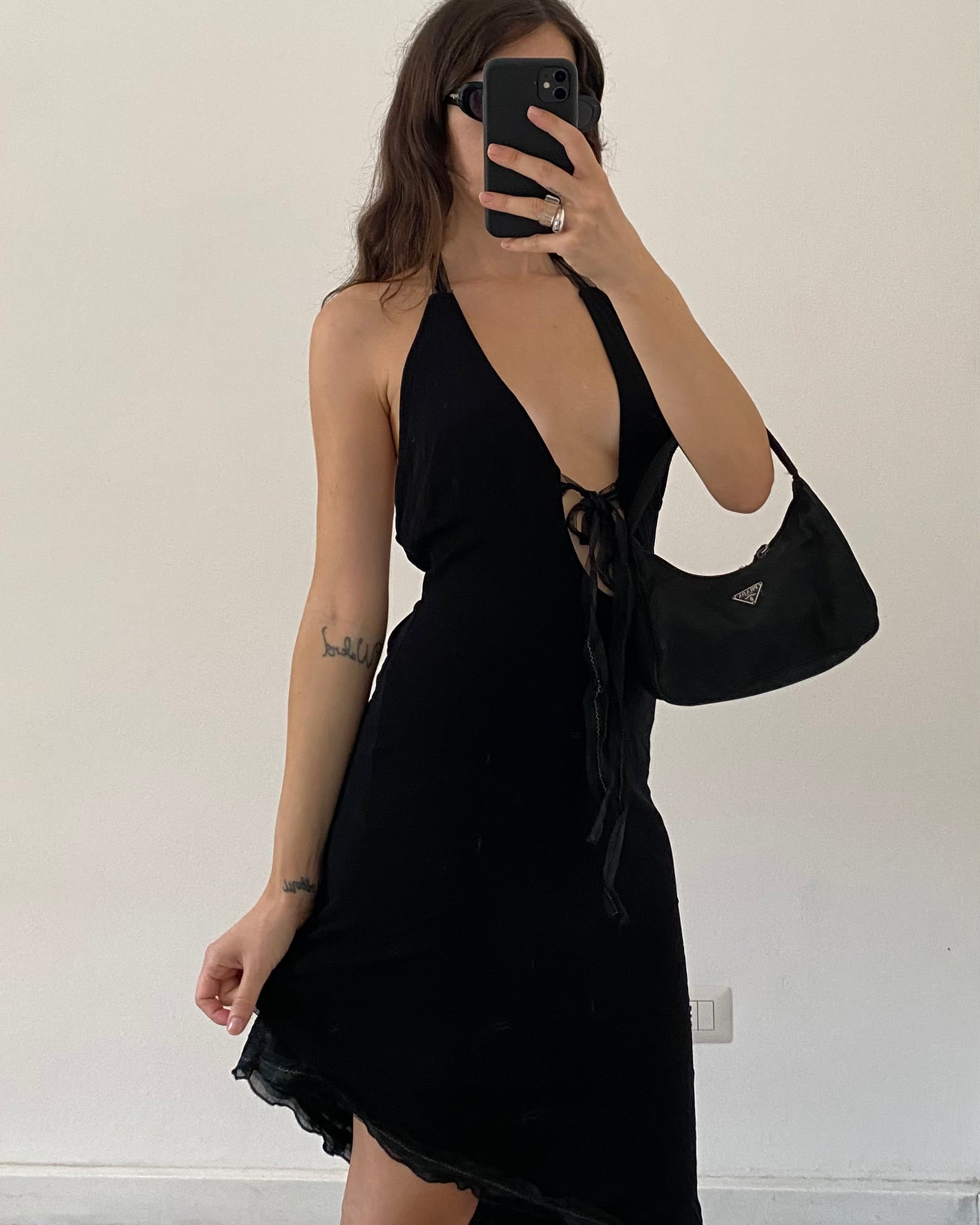 Meraviglioso abito anni 2000 in micro tulle doppio strato con profonda scollatura a V e laccetti regolabili in micro tulle, orlo asimmetrico, fodera interna.
