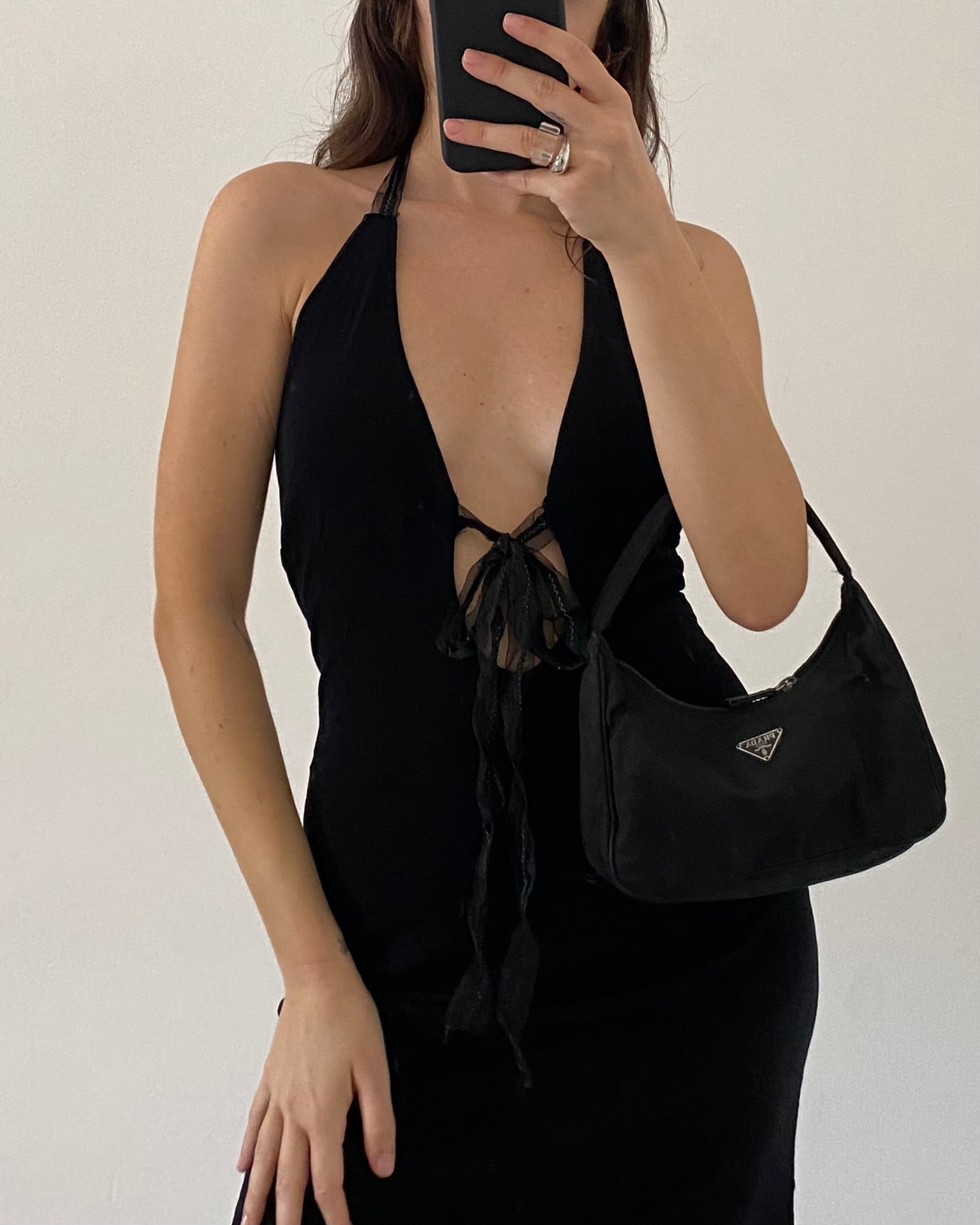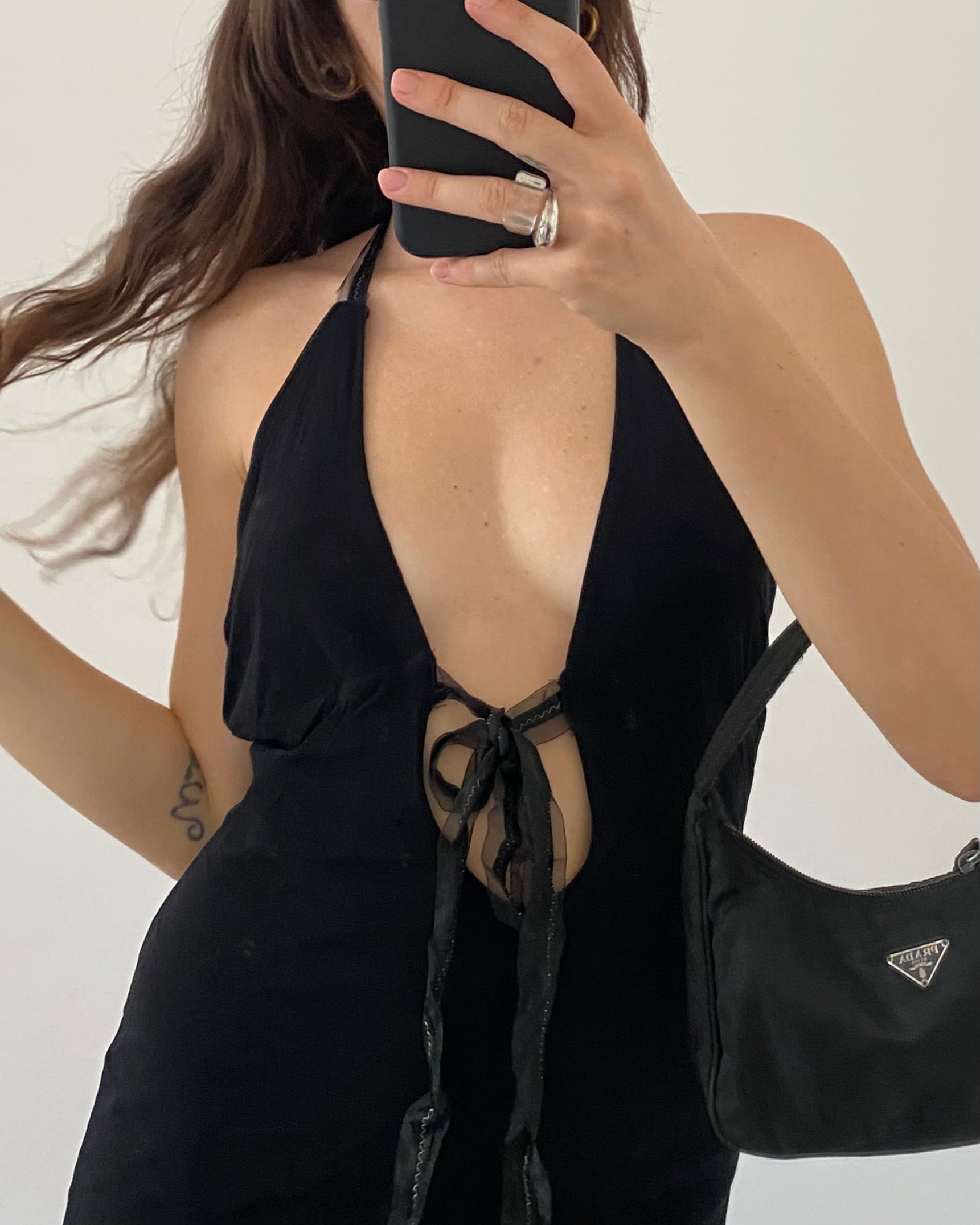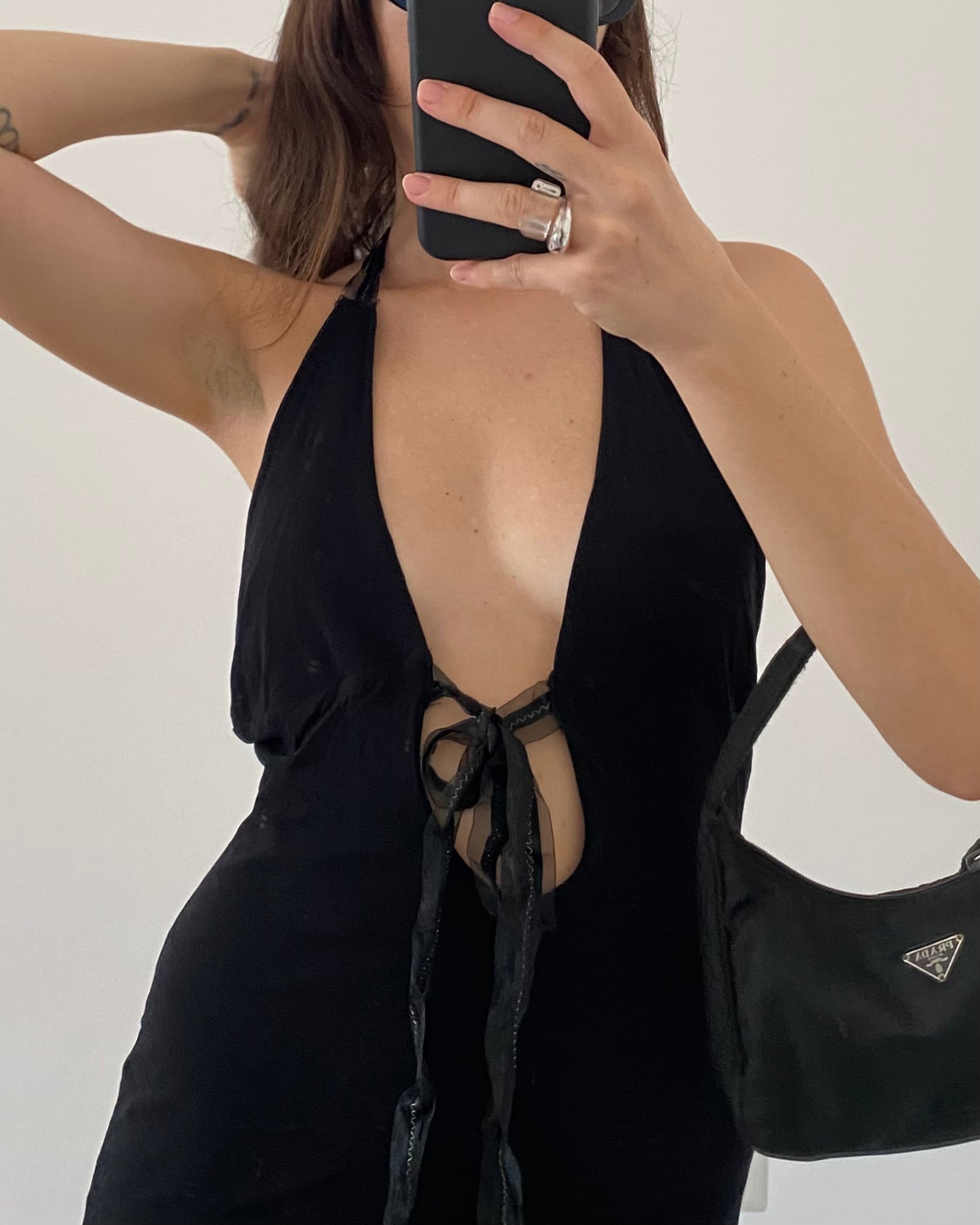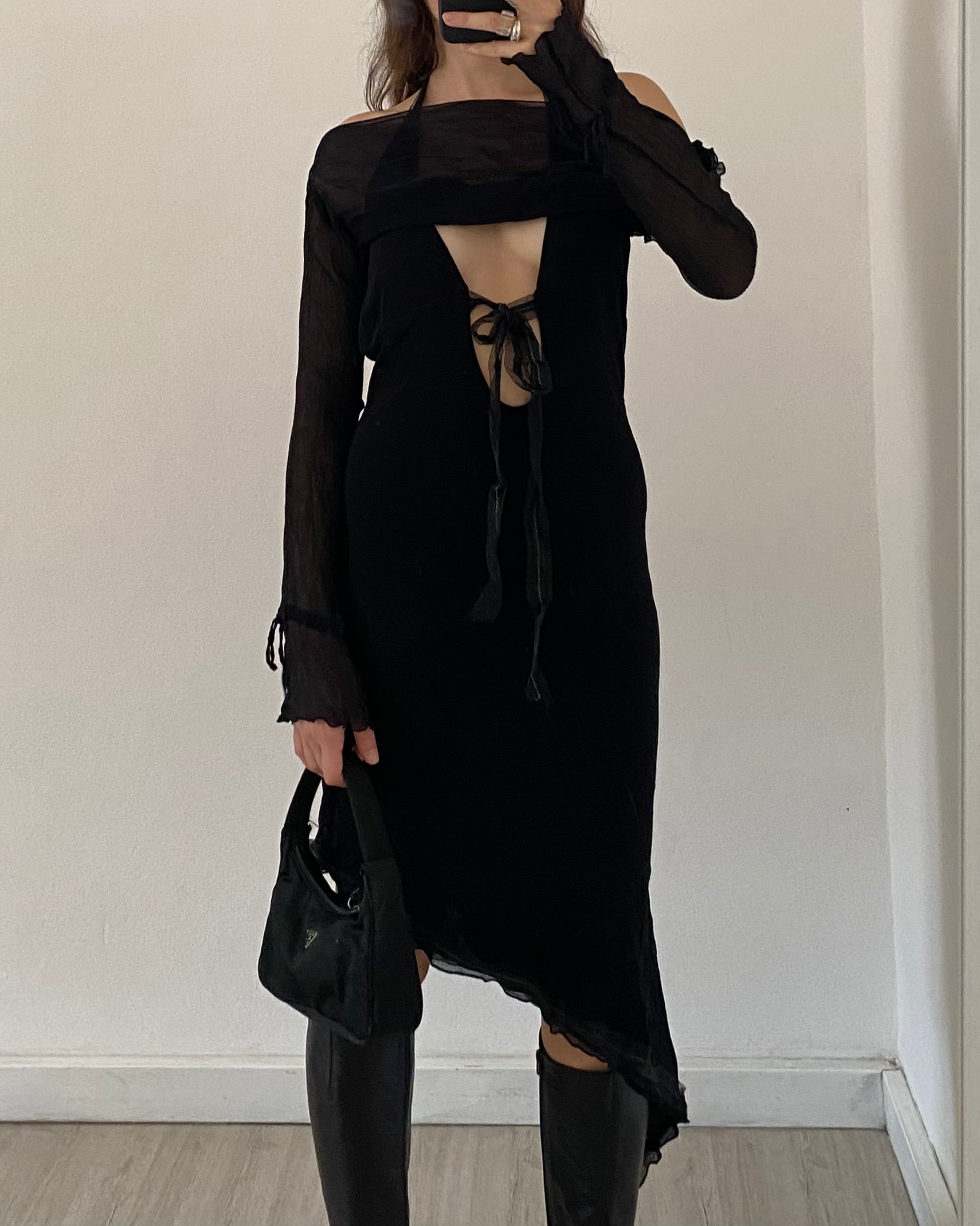 Meraviglioso abito anni 2000 in micro tulle doppio strato con profonda scollatura a V e laccetti regolabili in micro tulle, orlo asimmetrico, fodera interna.