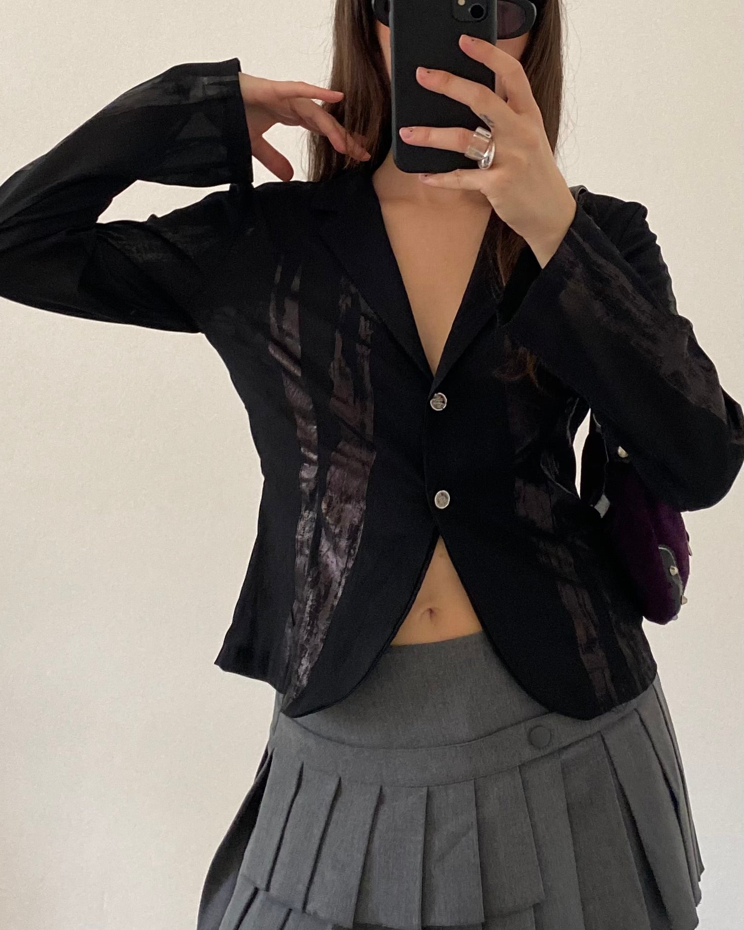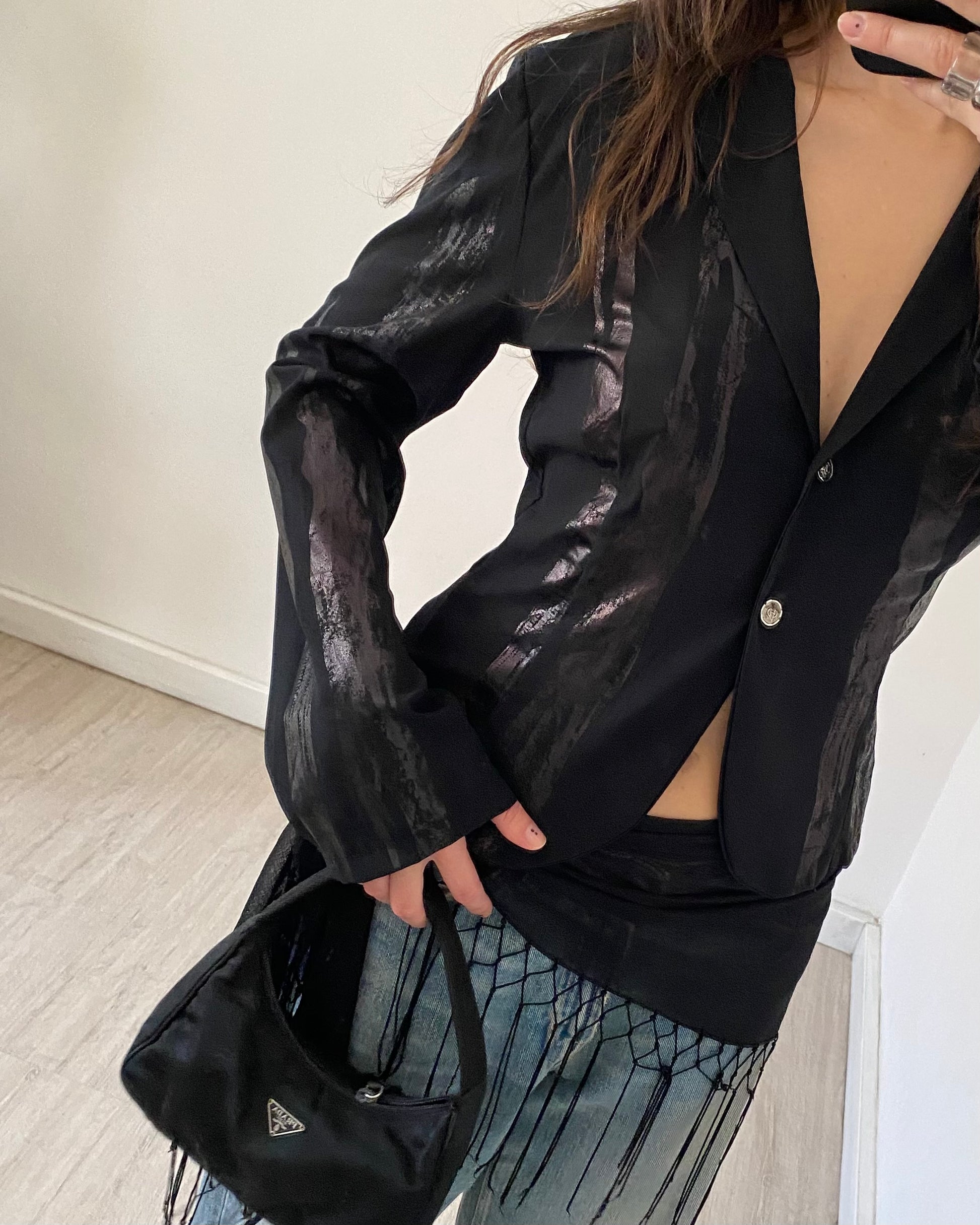 Deliziosa giacca blazer primi anni 2000 in chiffon trasparente con "pennellate" metalliche, fit avvitato, bellissima da indossare sia da sola come top particolare sia come giacca con un toppino sotto.