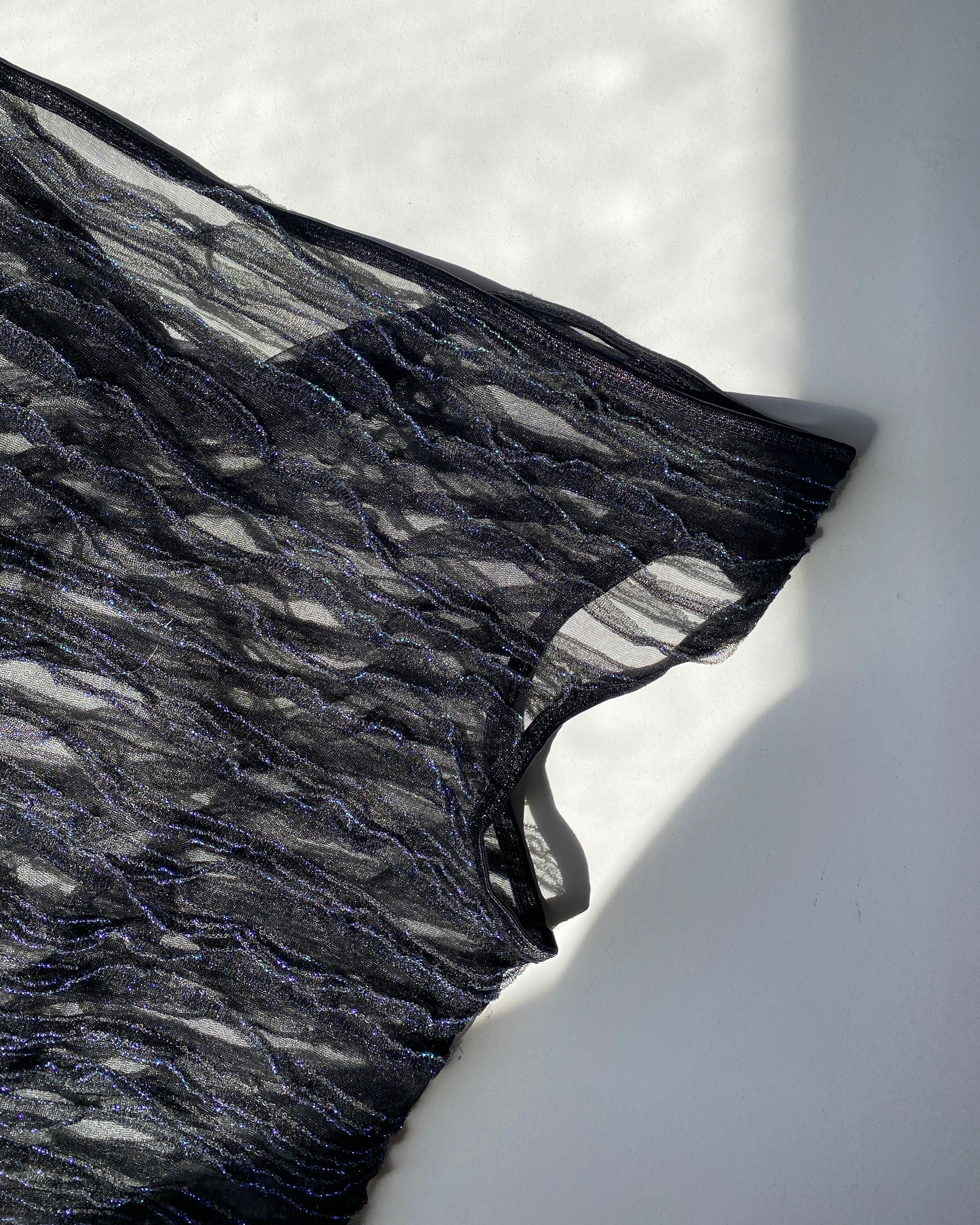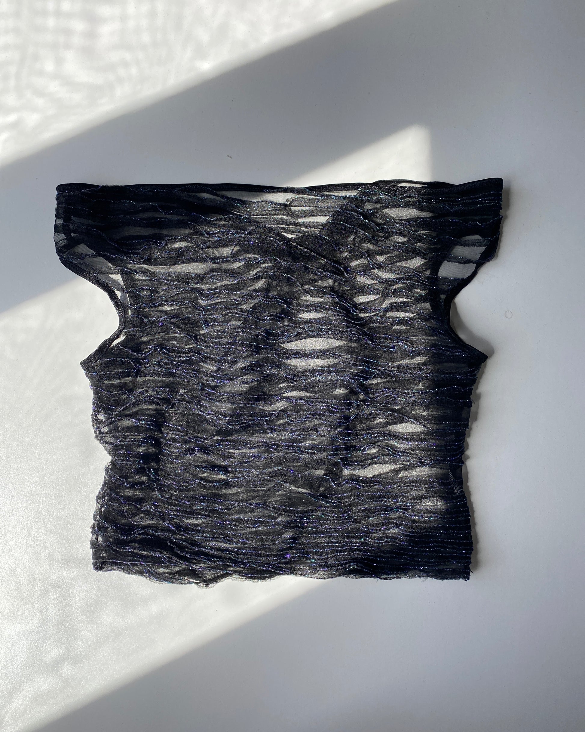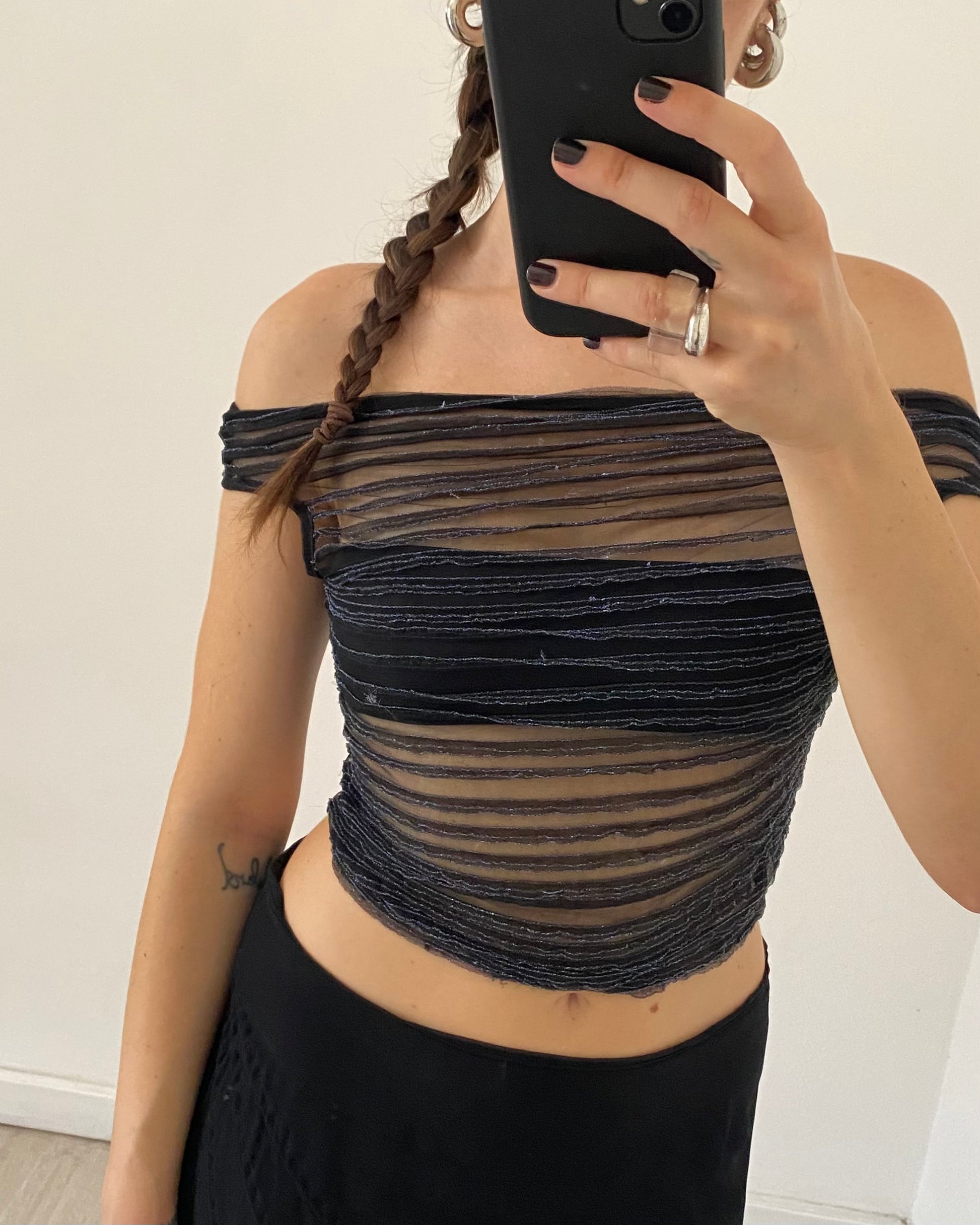 Meraviglioso top primi anni 2000 in micro tulle trasparente con micro arricciature e dettagli lamé (micro filini in lurex). Si può indossare con spalle scoperte o con scollatura a barchetta. Veramente stupendo.