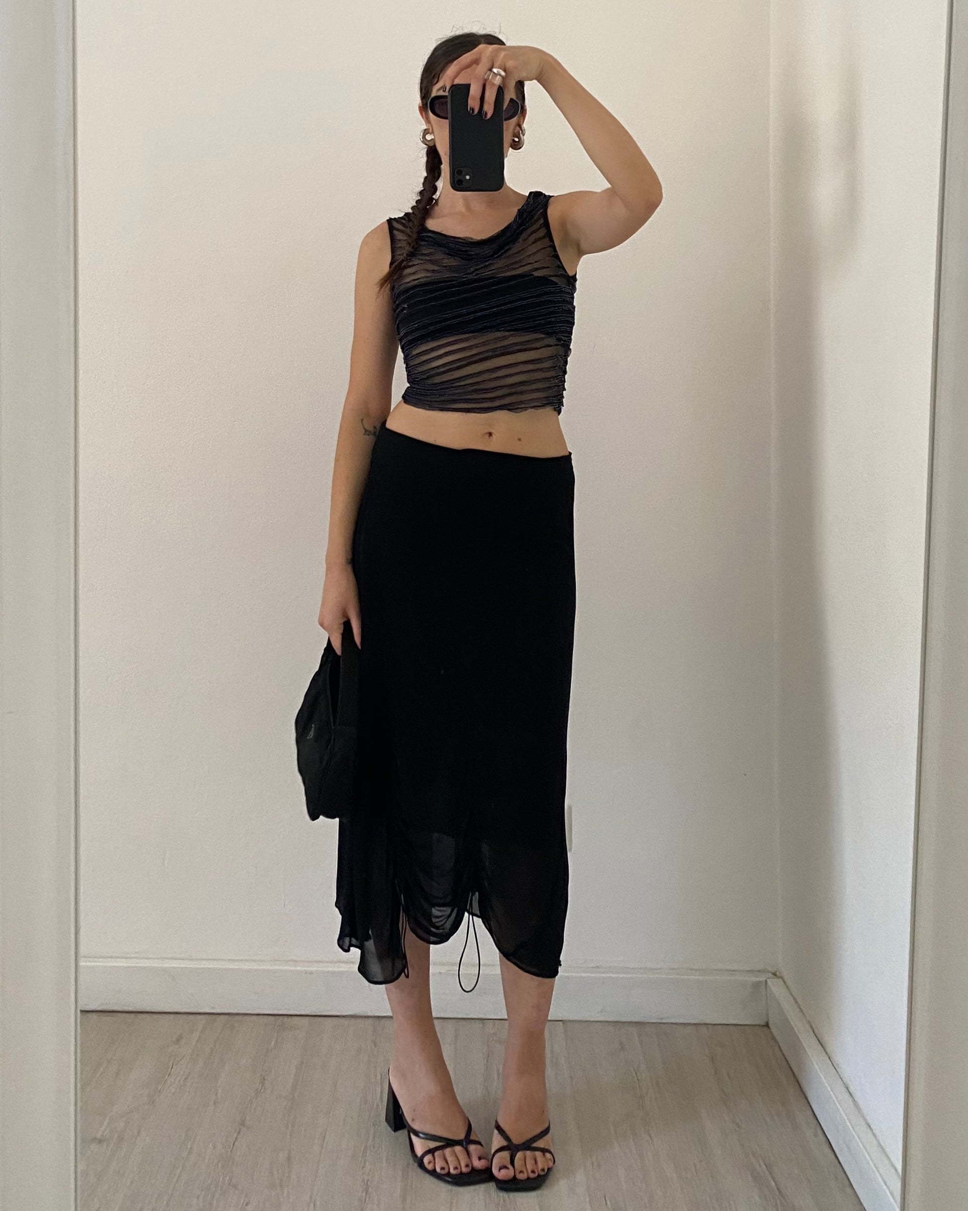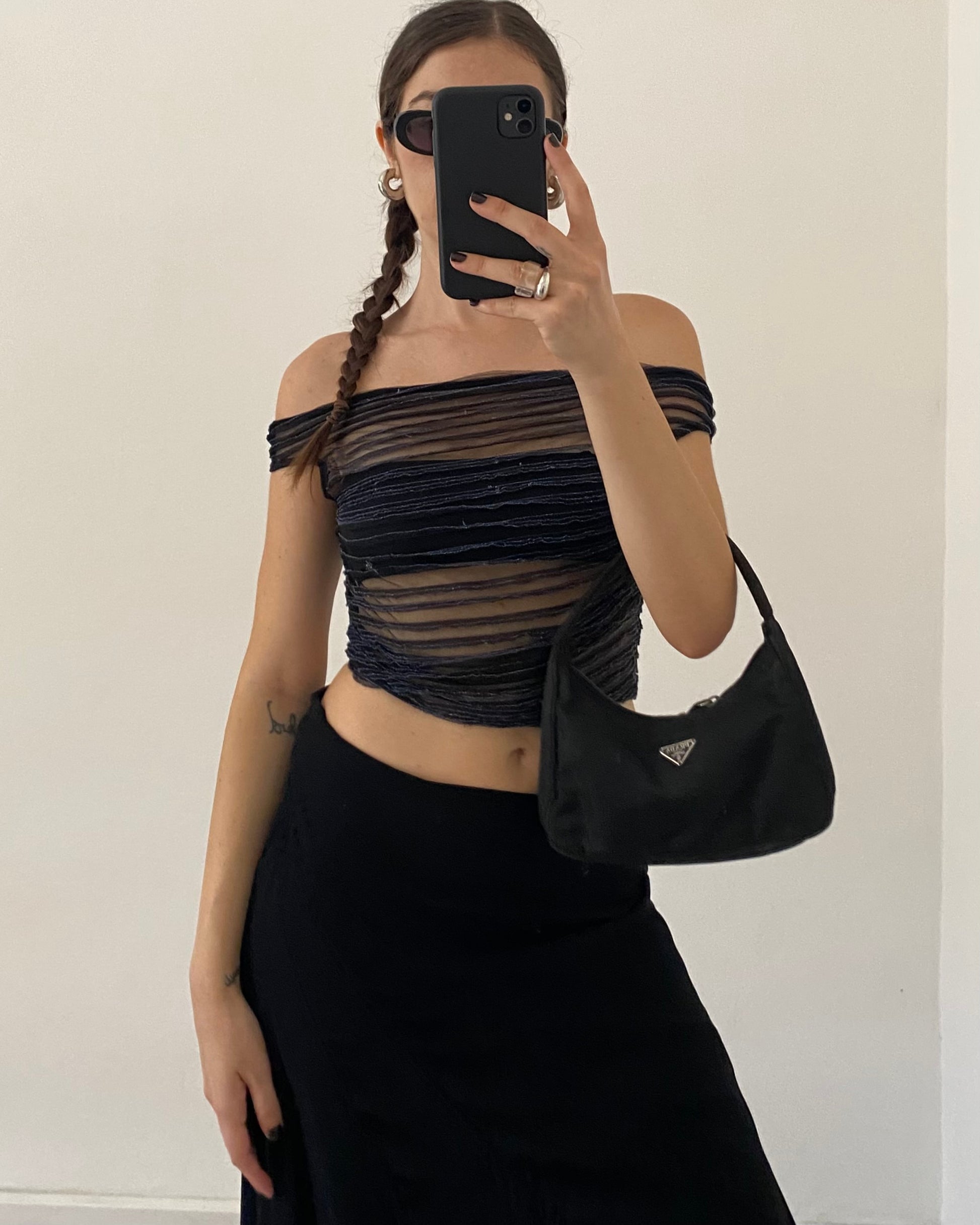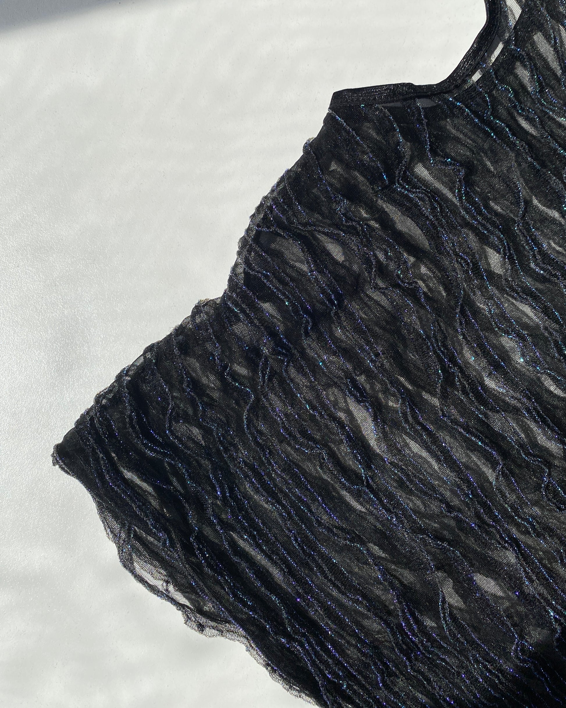 Meraviglioso top primi anni 2000 in micro tulle trasparente con micro arricciature e dettagli lamé (micro filini in lurex). Si può indossare con spalle scoperte o con scollatura a barchetta. Veramente stupendo.