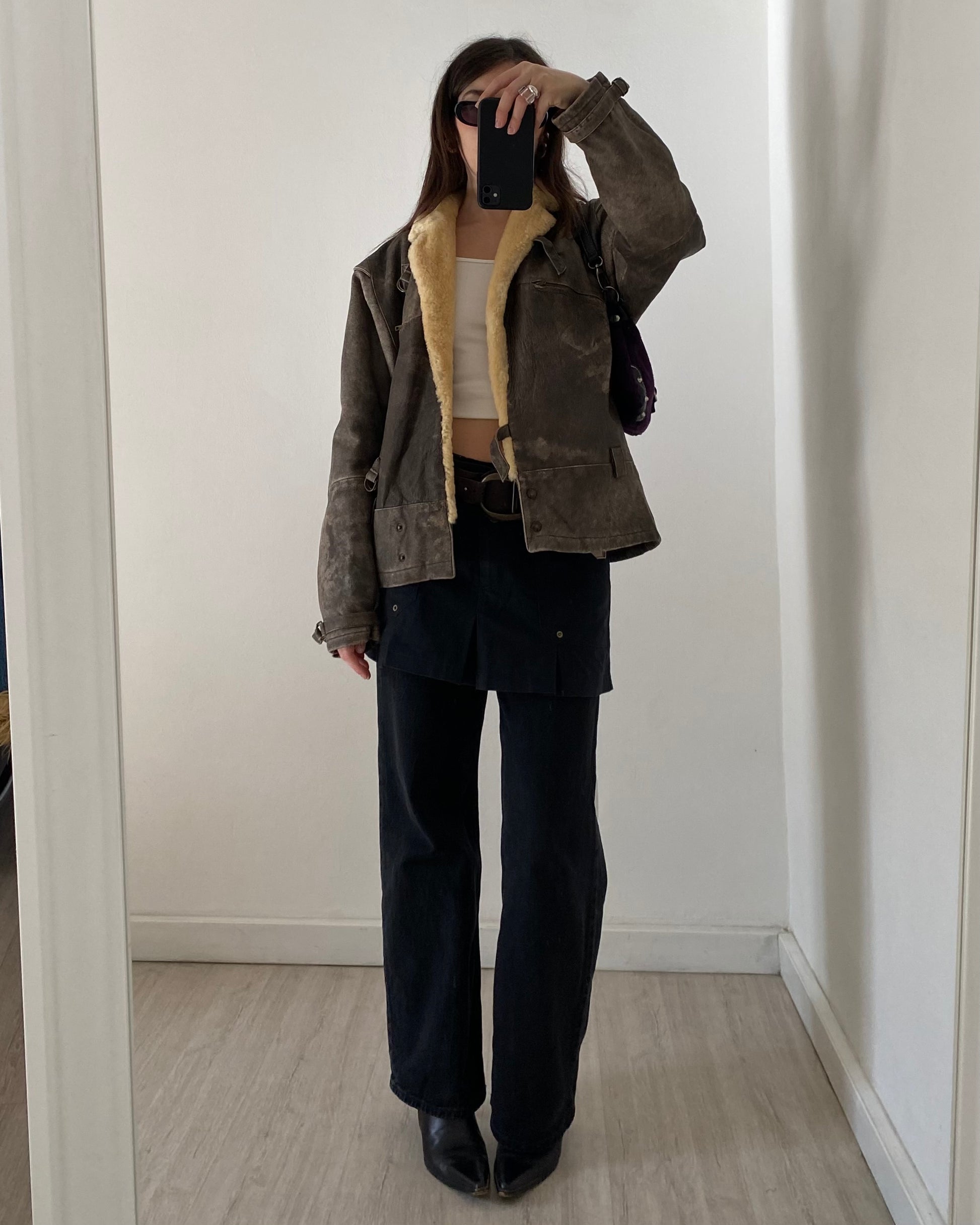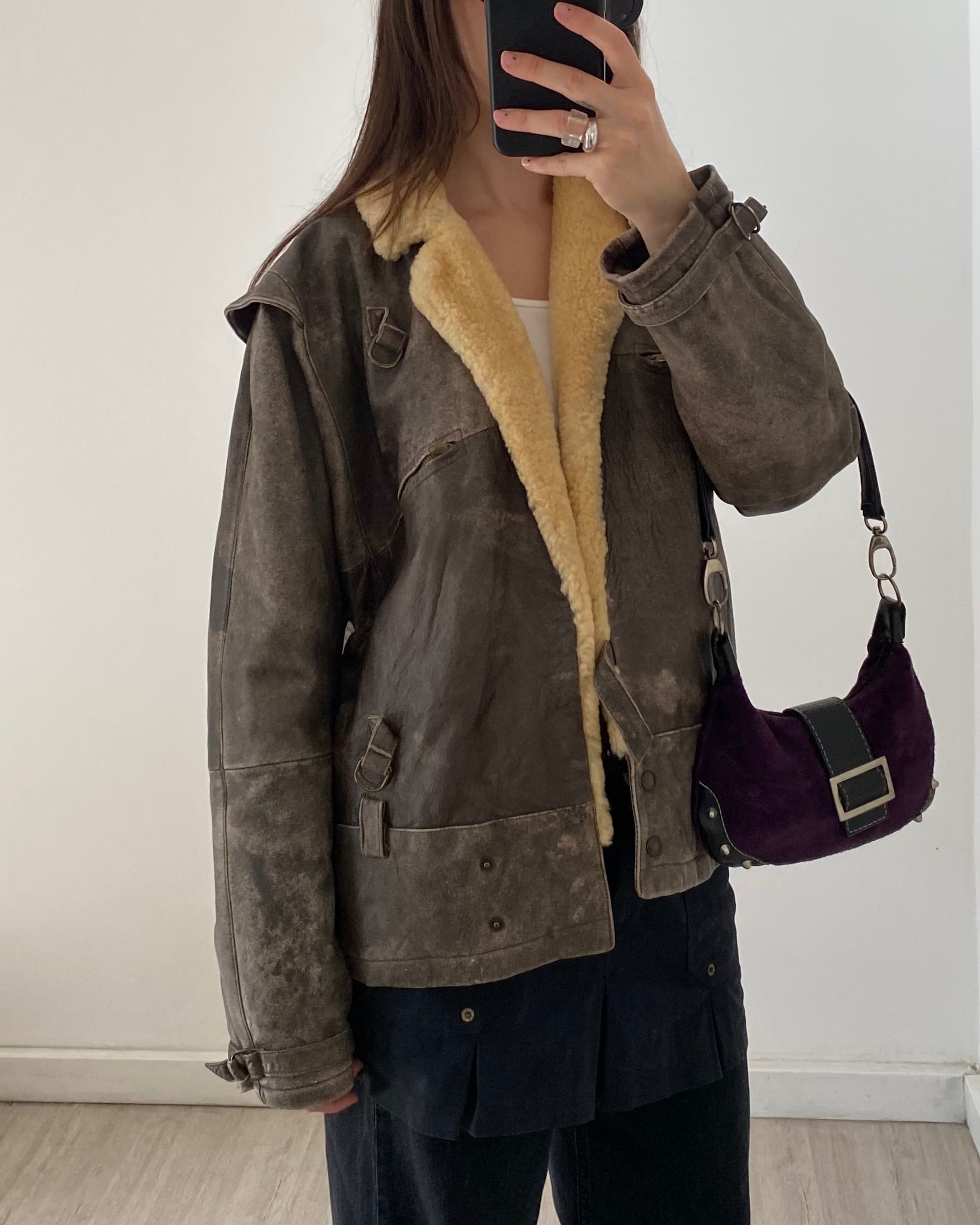 Meravigliosa giacca di pelle distressed con dettagli in pelliccetta, la pelle ha un effetto volutamente "usurato"con discromie e aree disomogene di colore, da non considerarsi come difetto ma come caratteristica unica del pellame. Cinghiette regolabili sui polsi e sul davanti per la chisusura, fodera interna (non imbottita). Fit morbido con spalle cadenti, non strutturata, comoda, e non risulta troppo pesante o ingombrante da portare in giro.