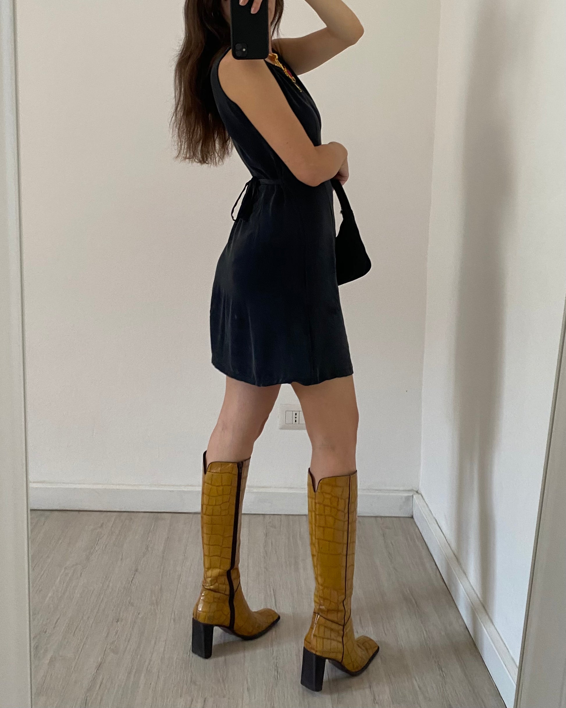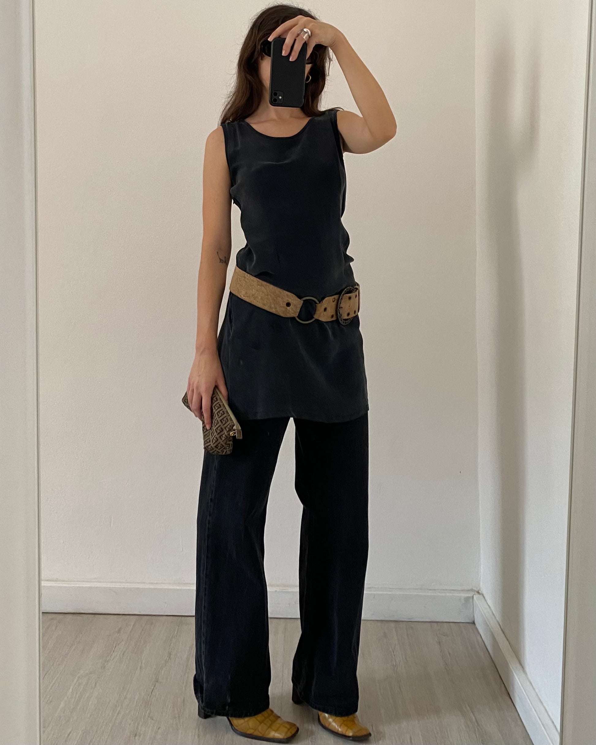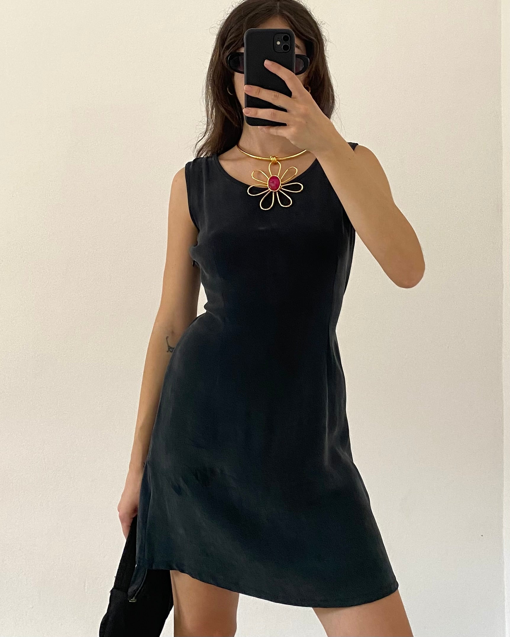 Abito vintage in seta lavata, chiusura con zip e cinturino da allacciare fronte o retro per regolare la vita. Il tessuto è volutamente opaco (caratteristica della seta lavata) e dal colore leggermente cangiante ( grigio antracite/nero bluastro).