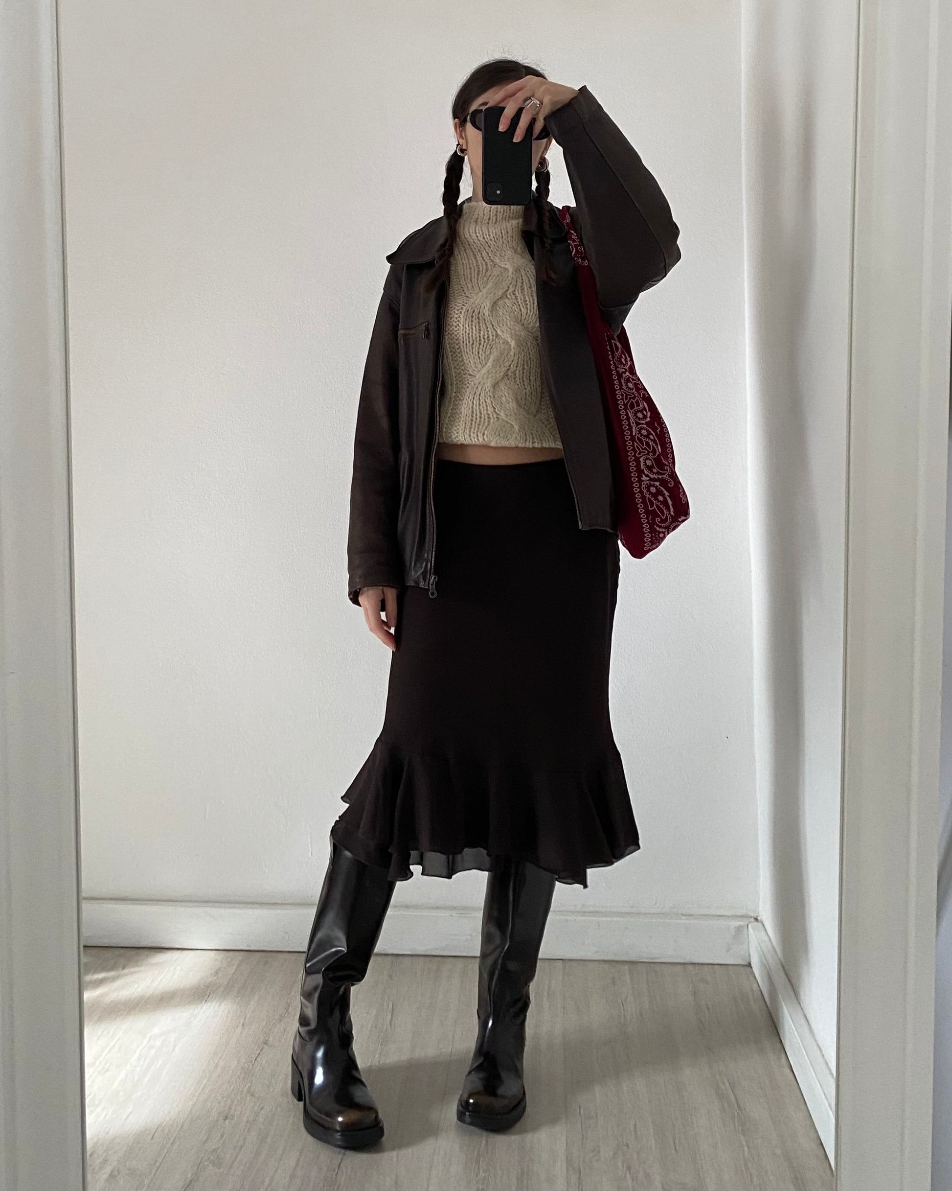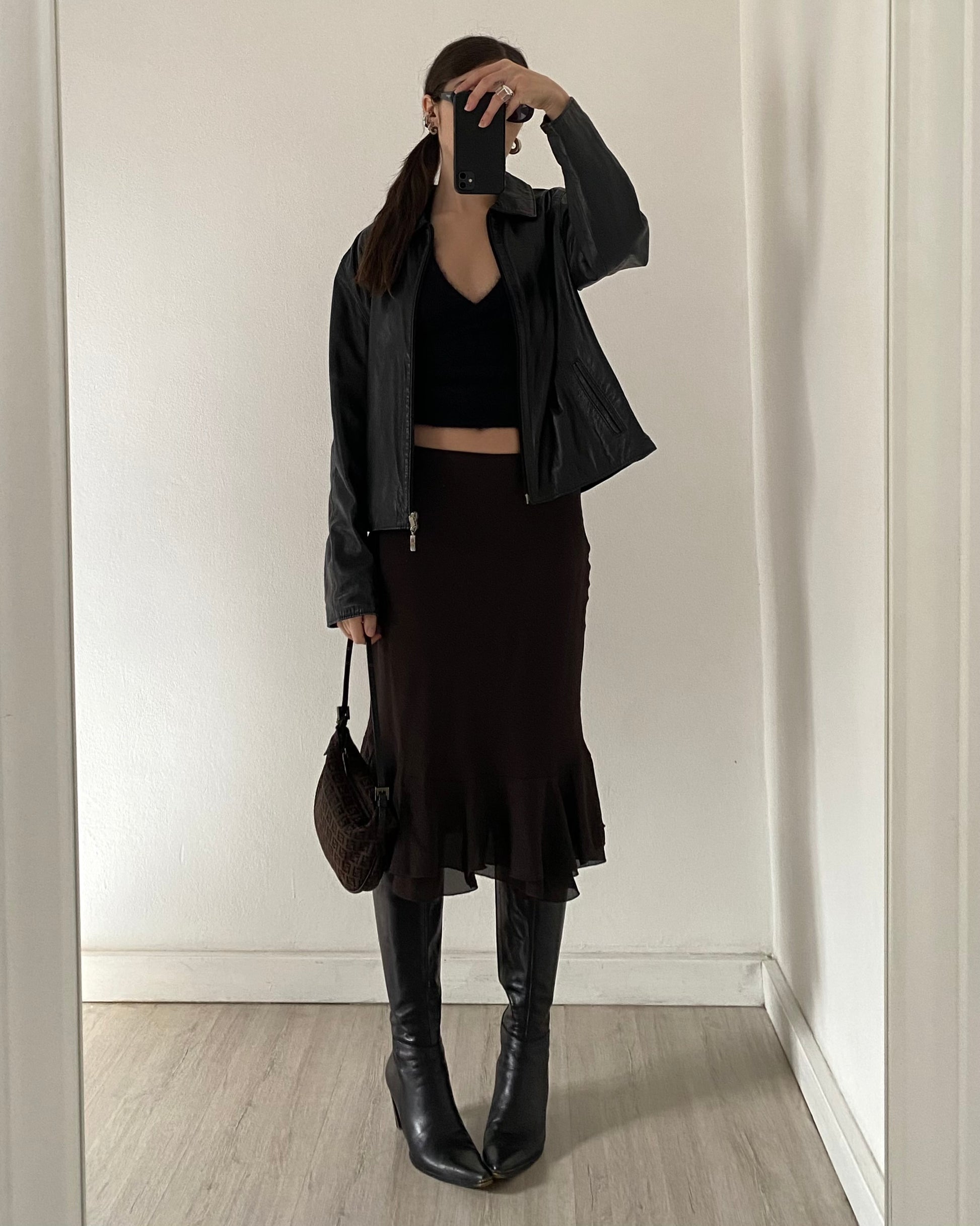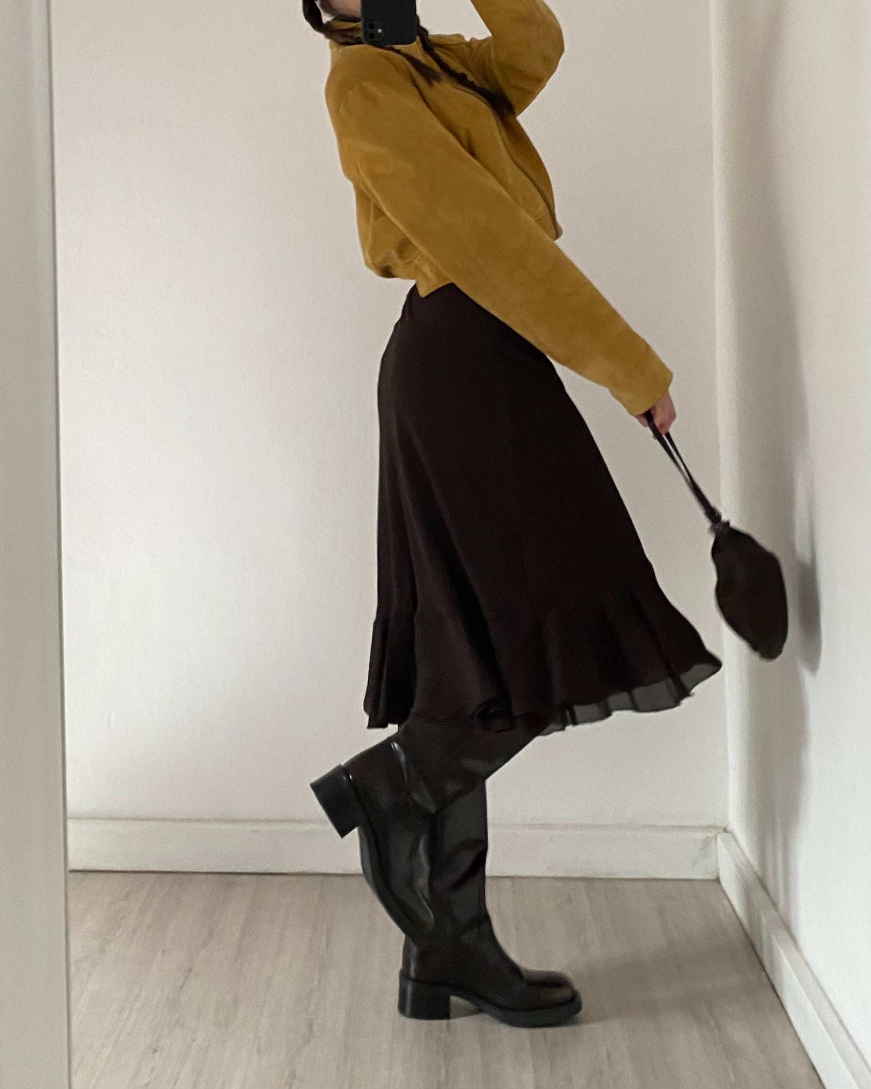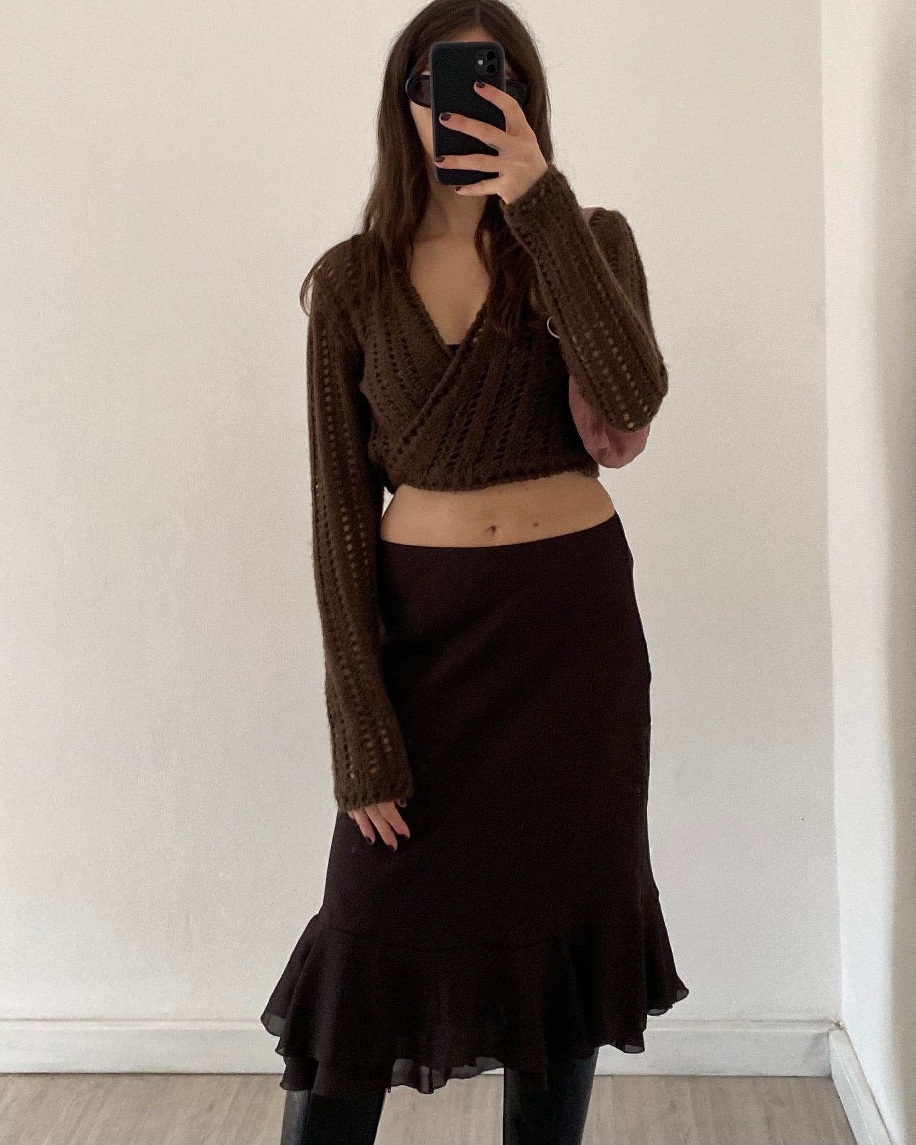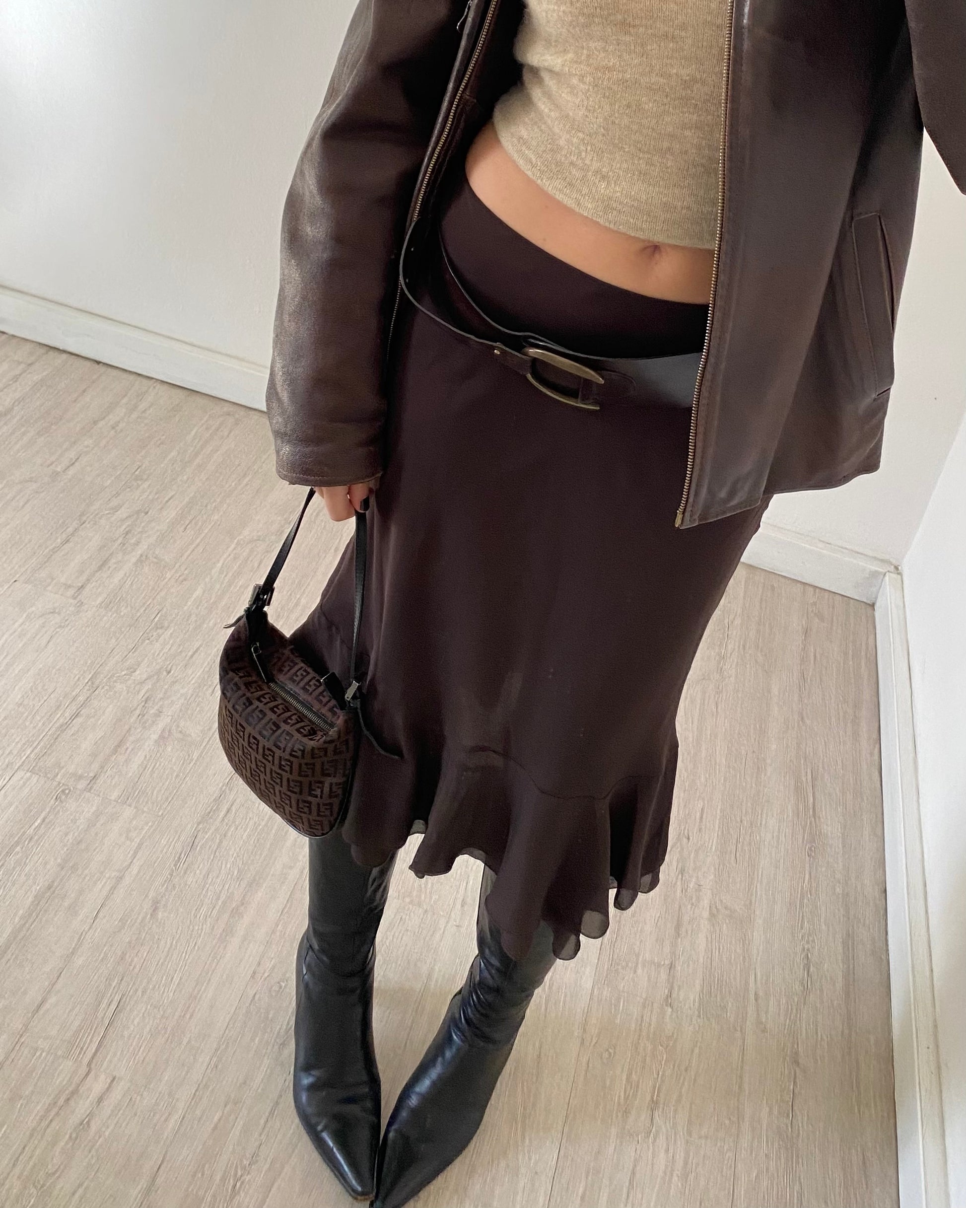 Meravigliosa gonna midi primi anni 2000 in viscosa, taglio dritto e leggermente svasato sul fondo con dei volants sobri, vita media elasticizzata, tessuto fluido che cade morbido, fodera interna. Colore: marrone cioccolato.