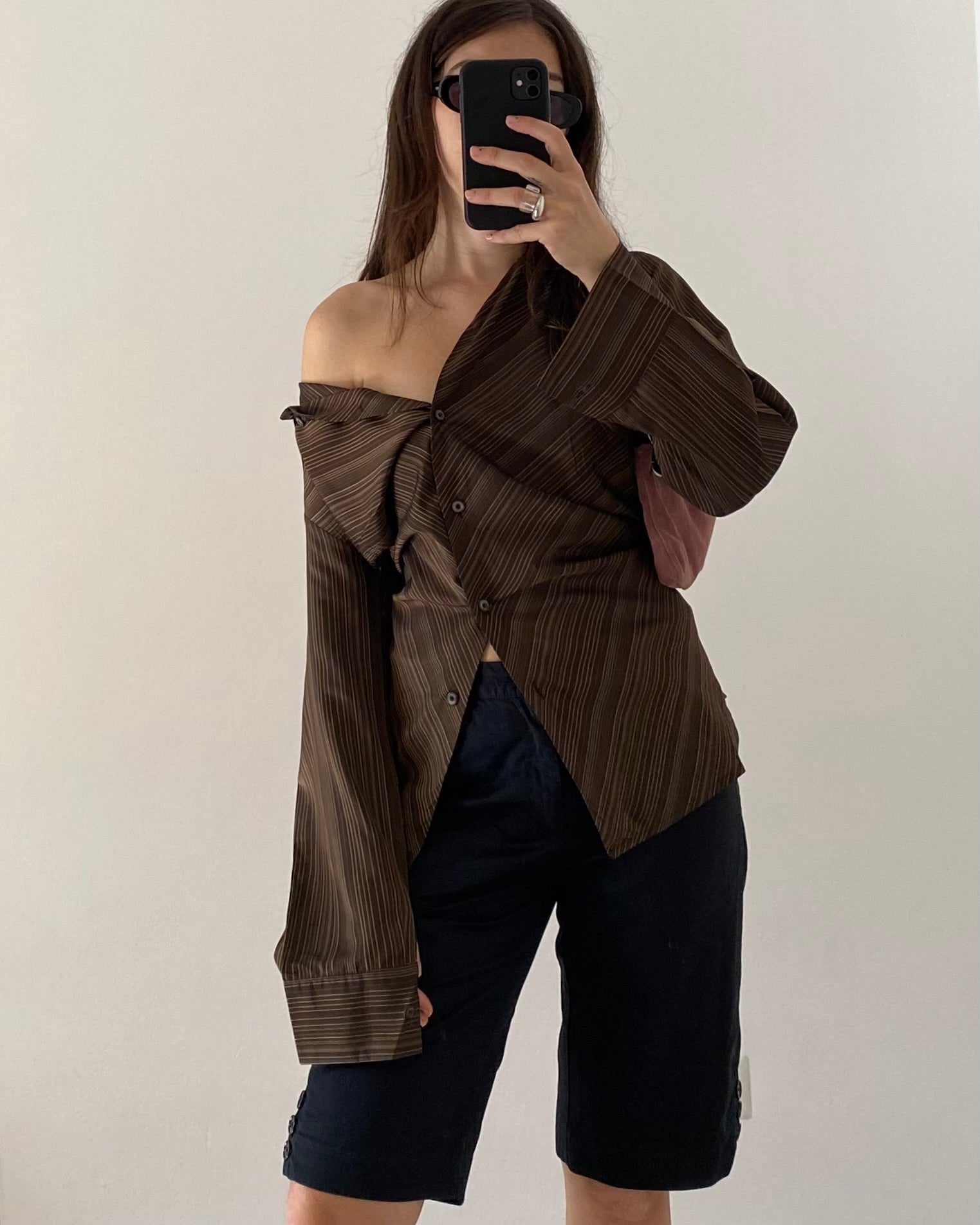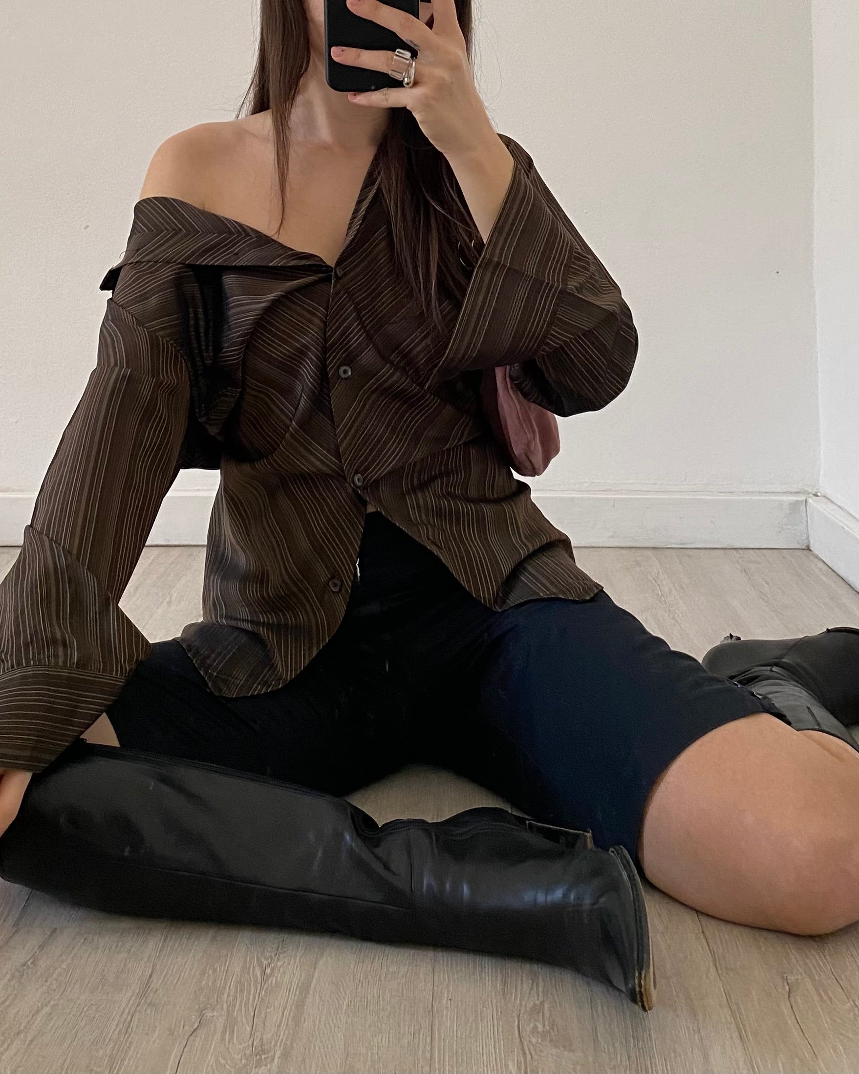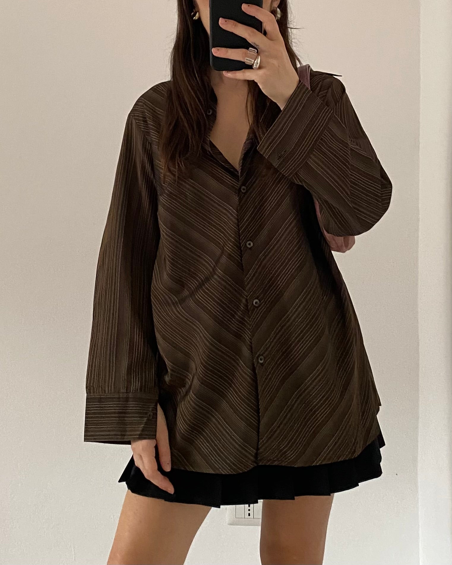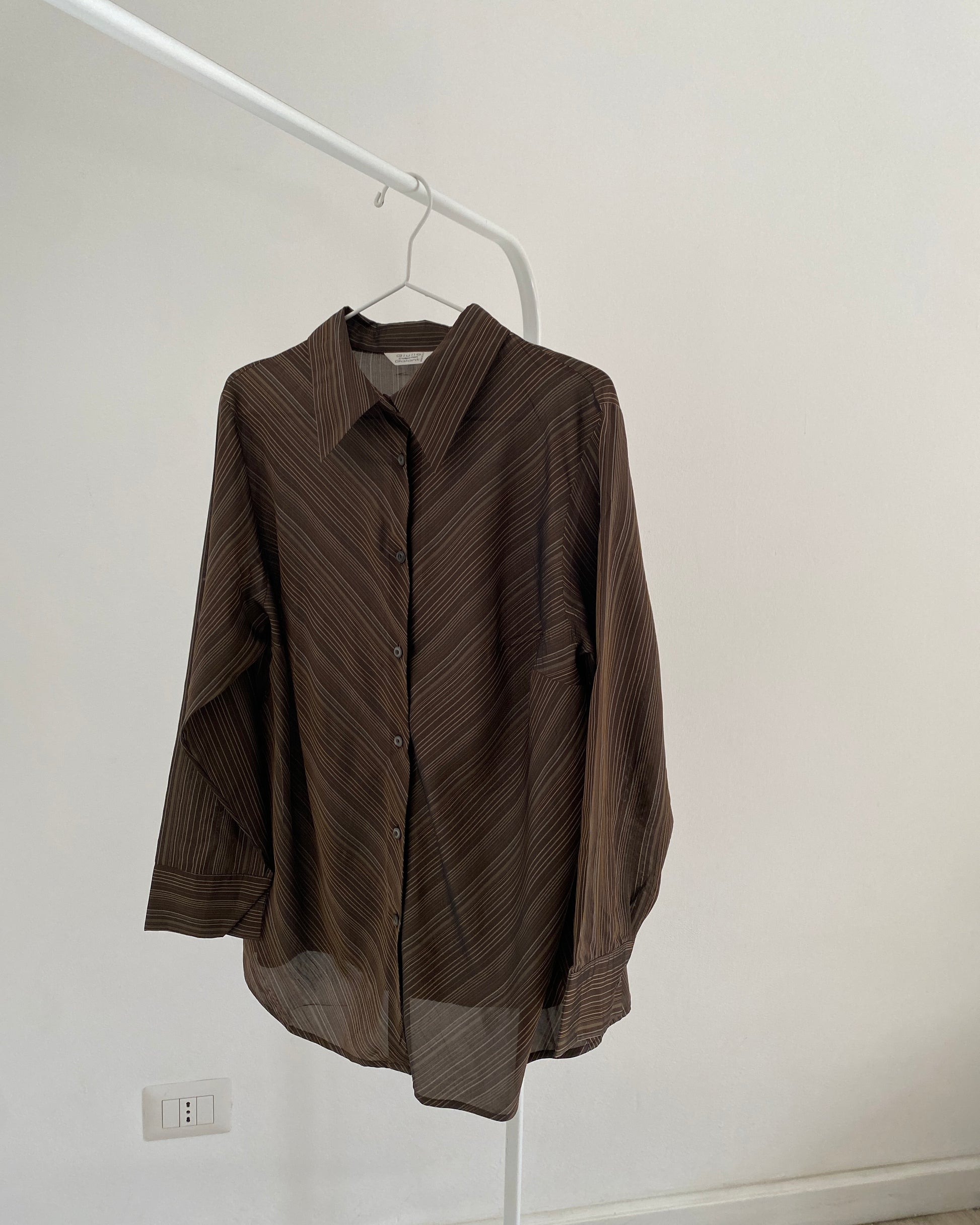 Deliziosa camicetta vintage gessata primissimi anni 2000, tessuto fluido, splendido marrone cioccolato, designer italiana, ottima fattura.