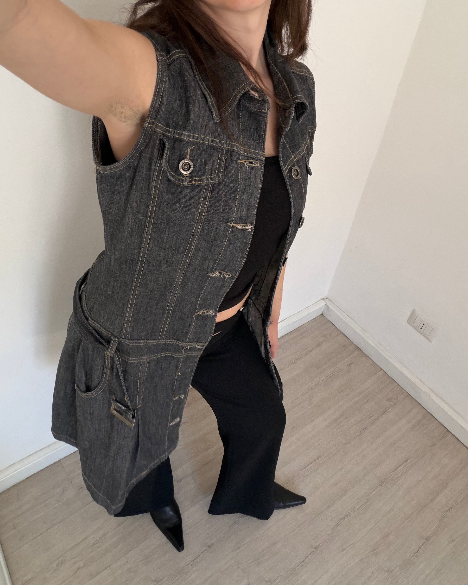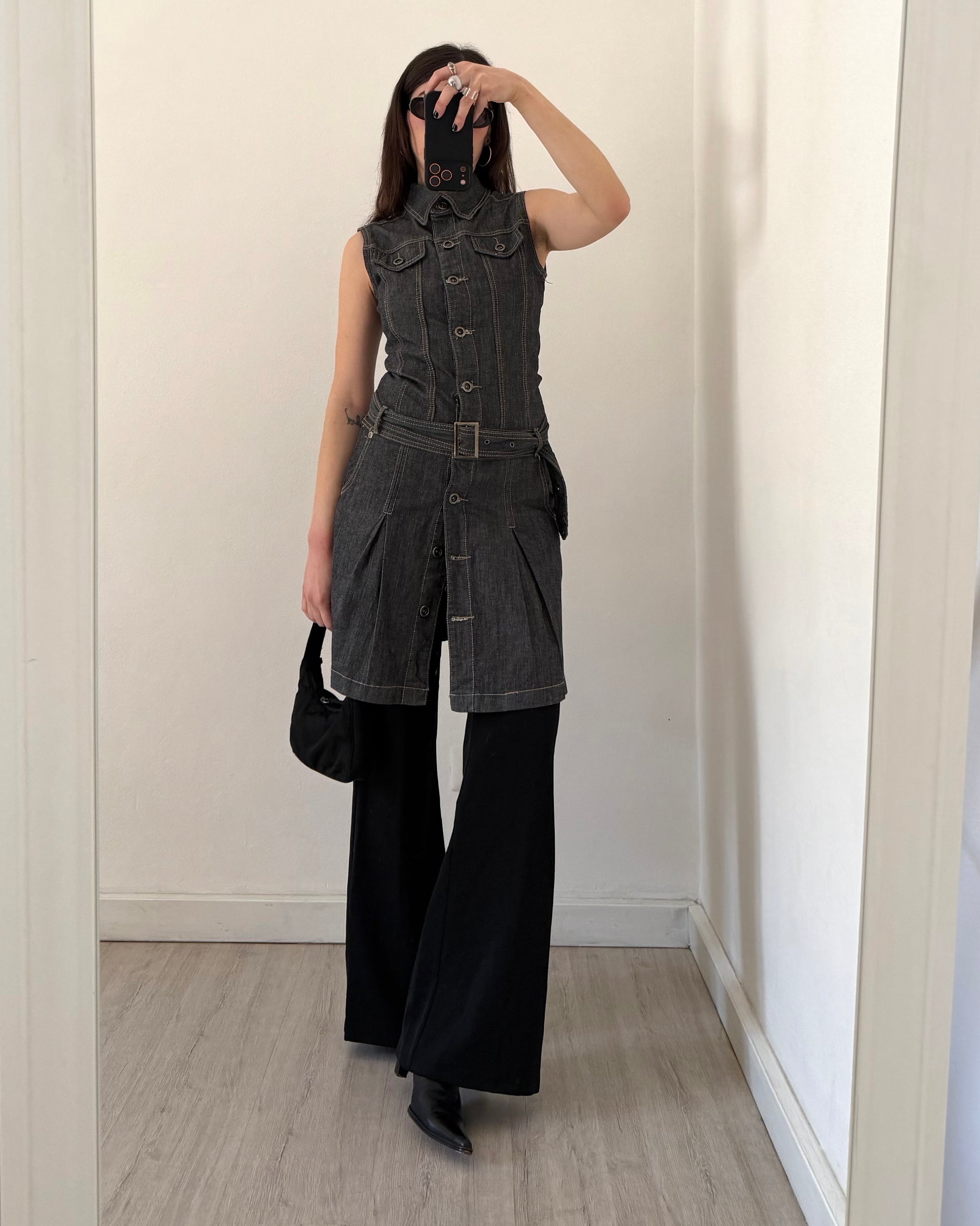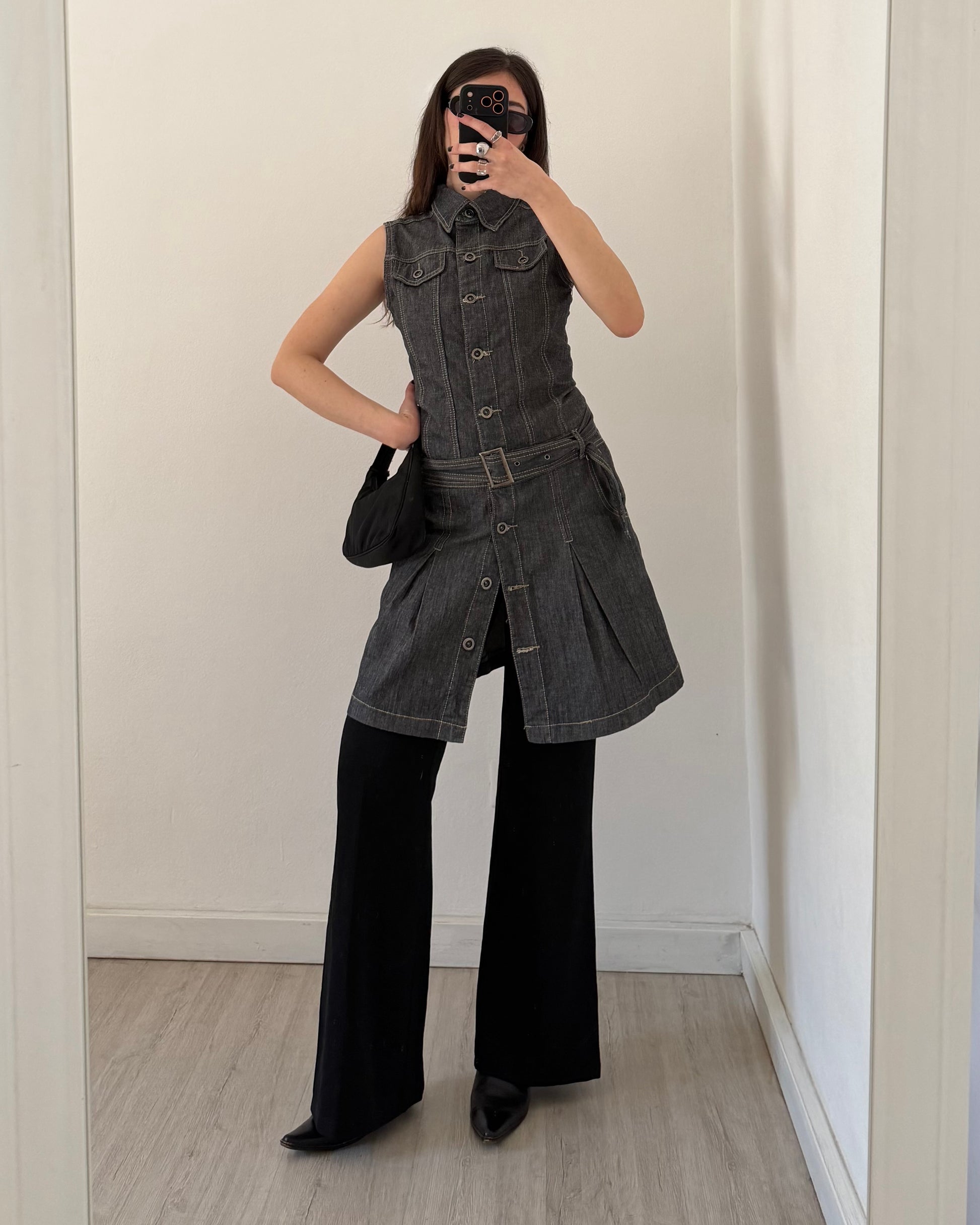 Meraviglioso abito anni 2000 in denim con minigonna a pieghe, cintura con fibbia in metallo removibile, bottoni frontali. Super versatile, da indossare mattina o sera, e perfetto da indossare in qualsiasi stagione.