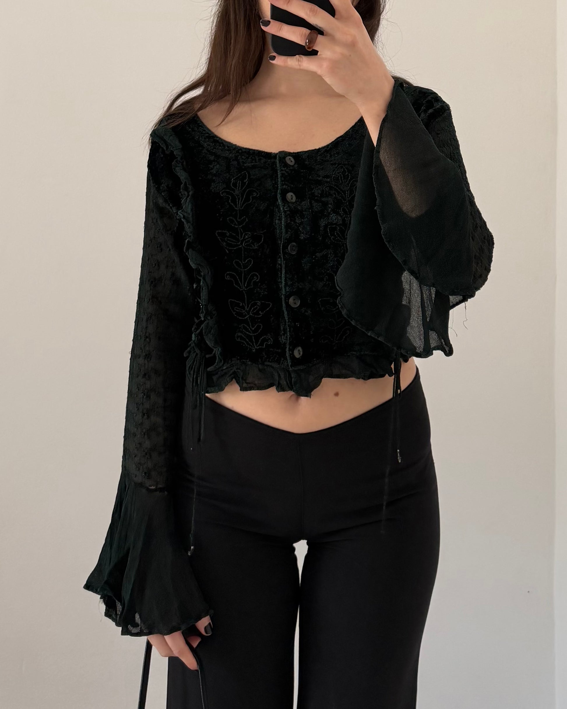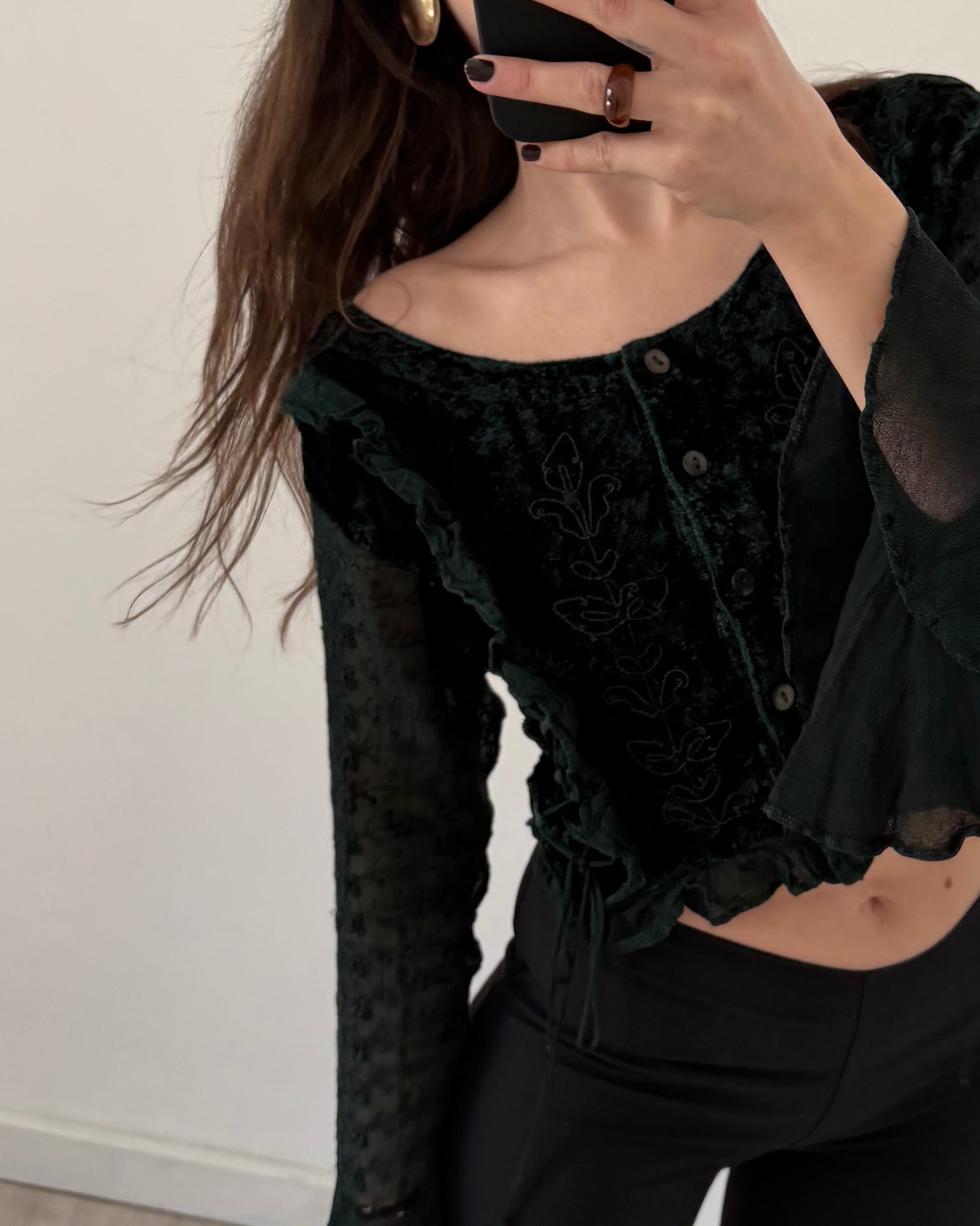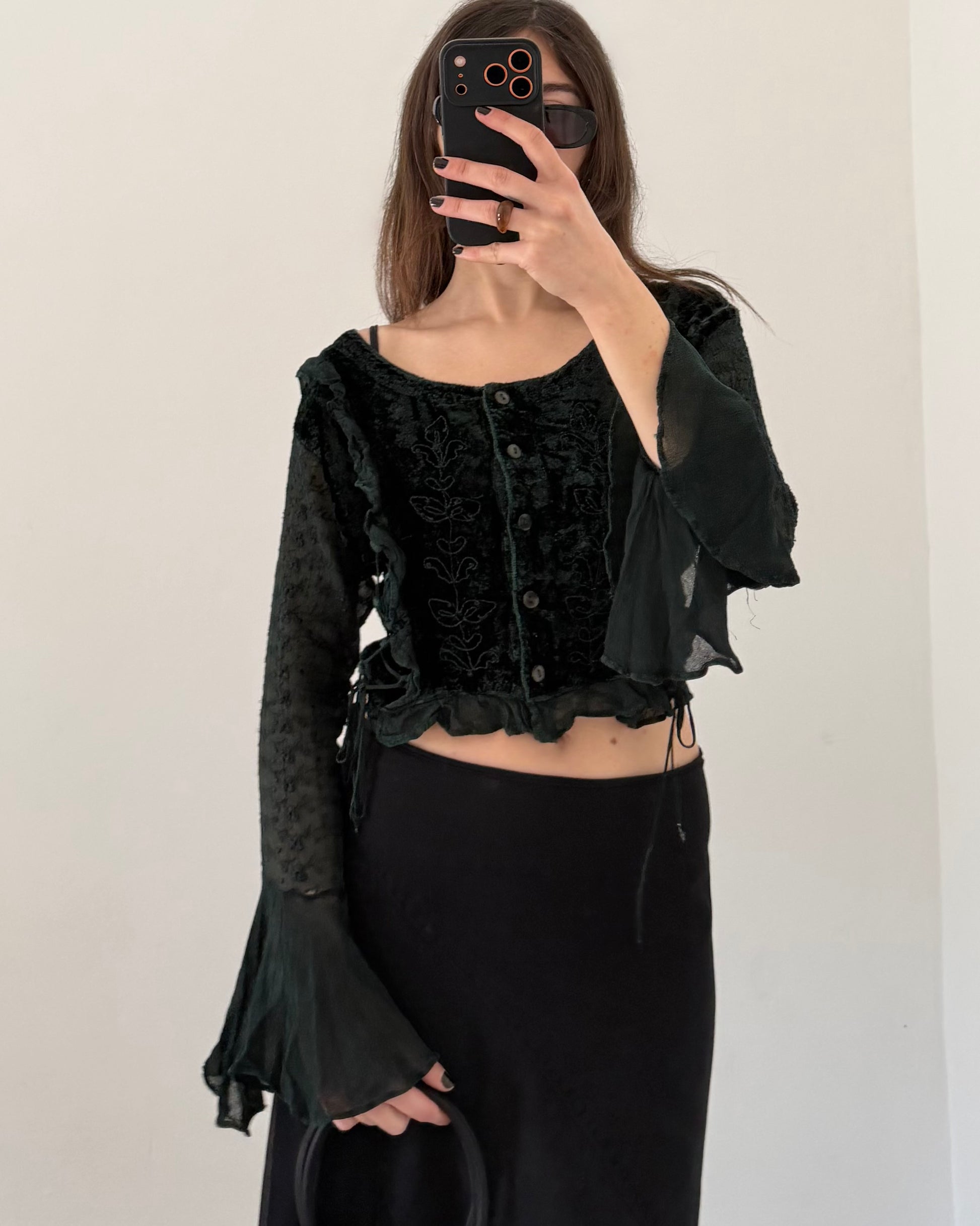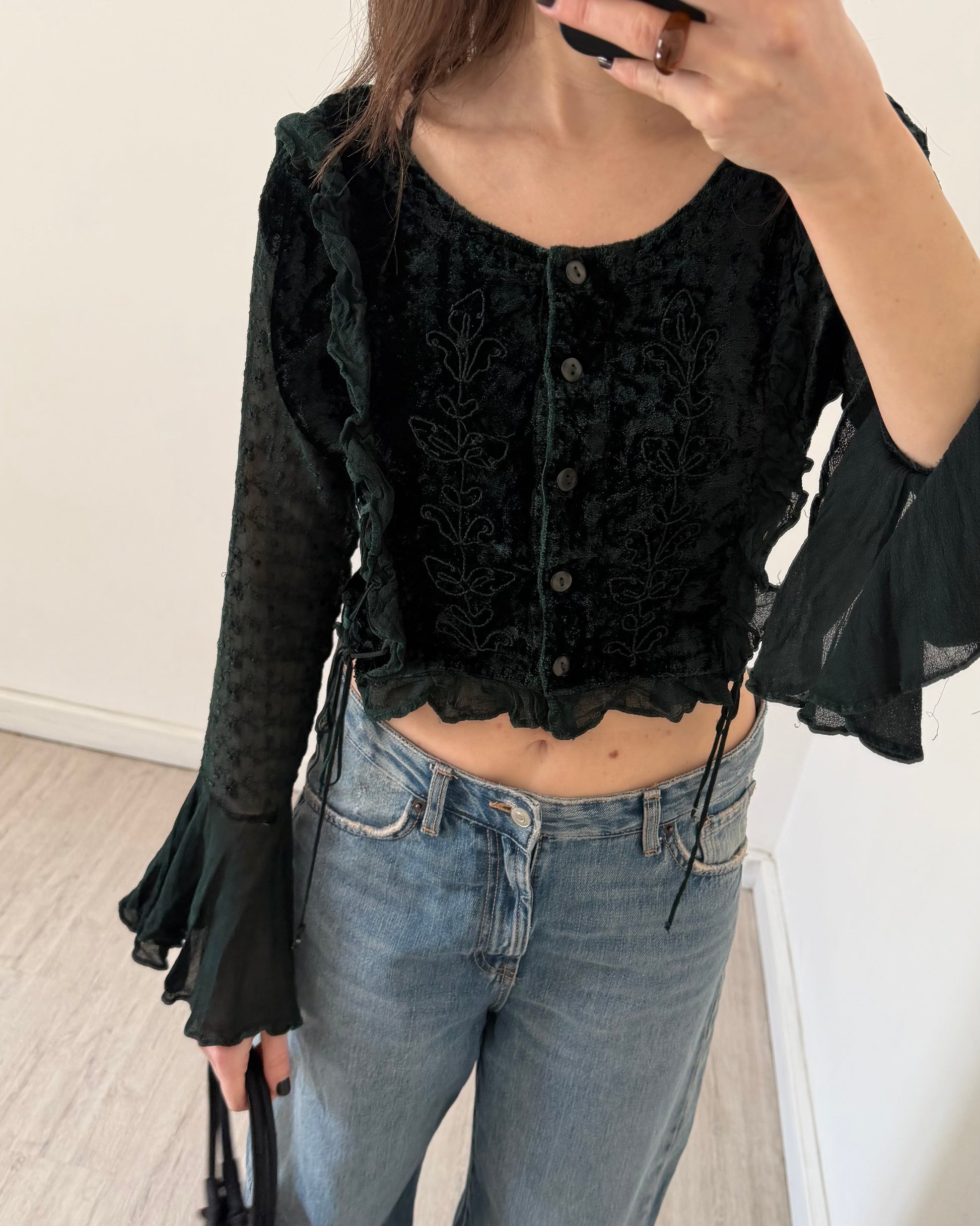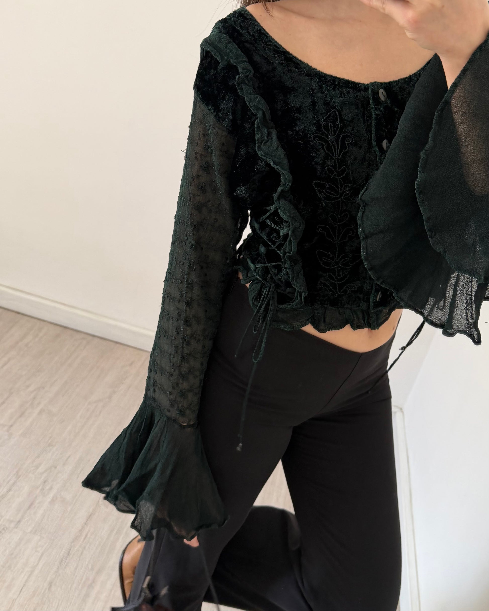 Meraviglioso top vintage anni 90 da fatina, modello morbido ma con taglio a corsetto:  laccetti laterali per regolare il fit sul davanti e lacci sul retro per regolare la vita, maniche svolazzanti e semi trasparenti, motivo con ricami e tessuto simile alla ciniglia e alla seta