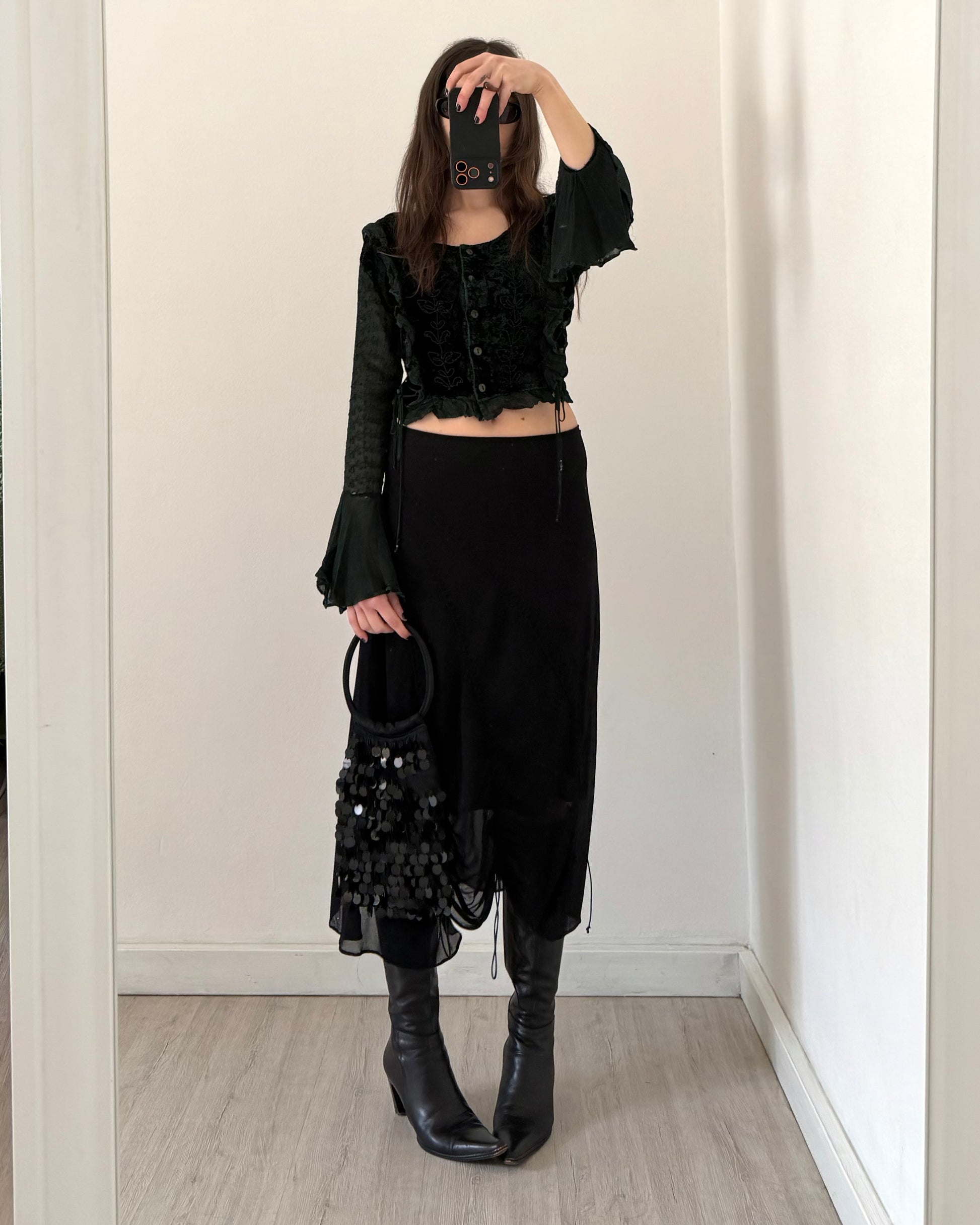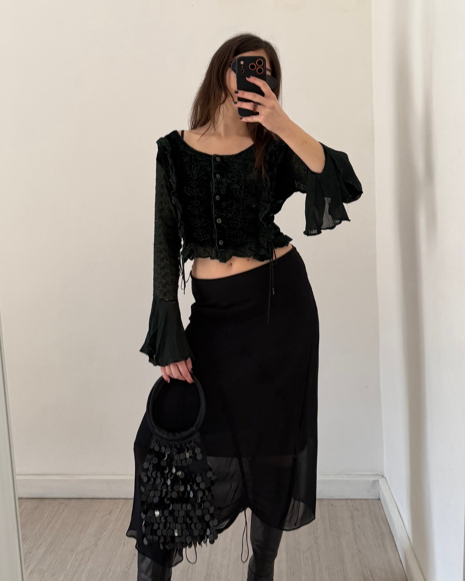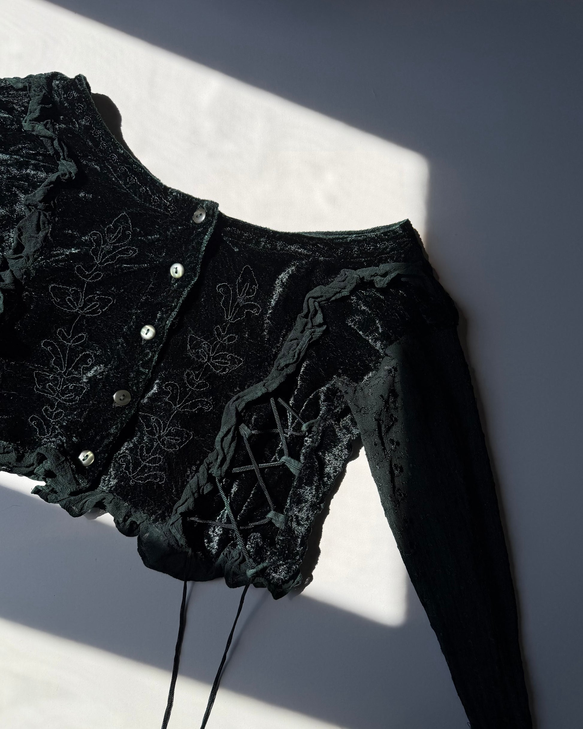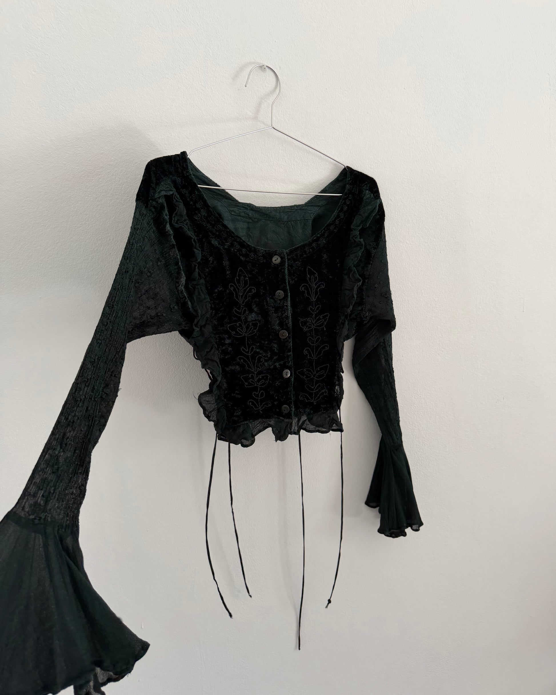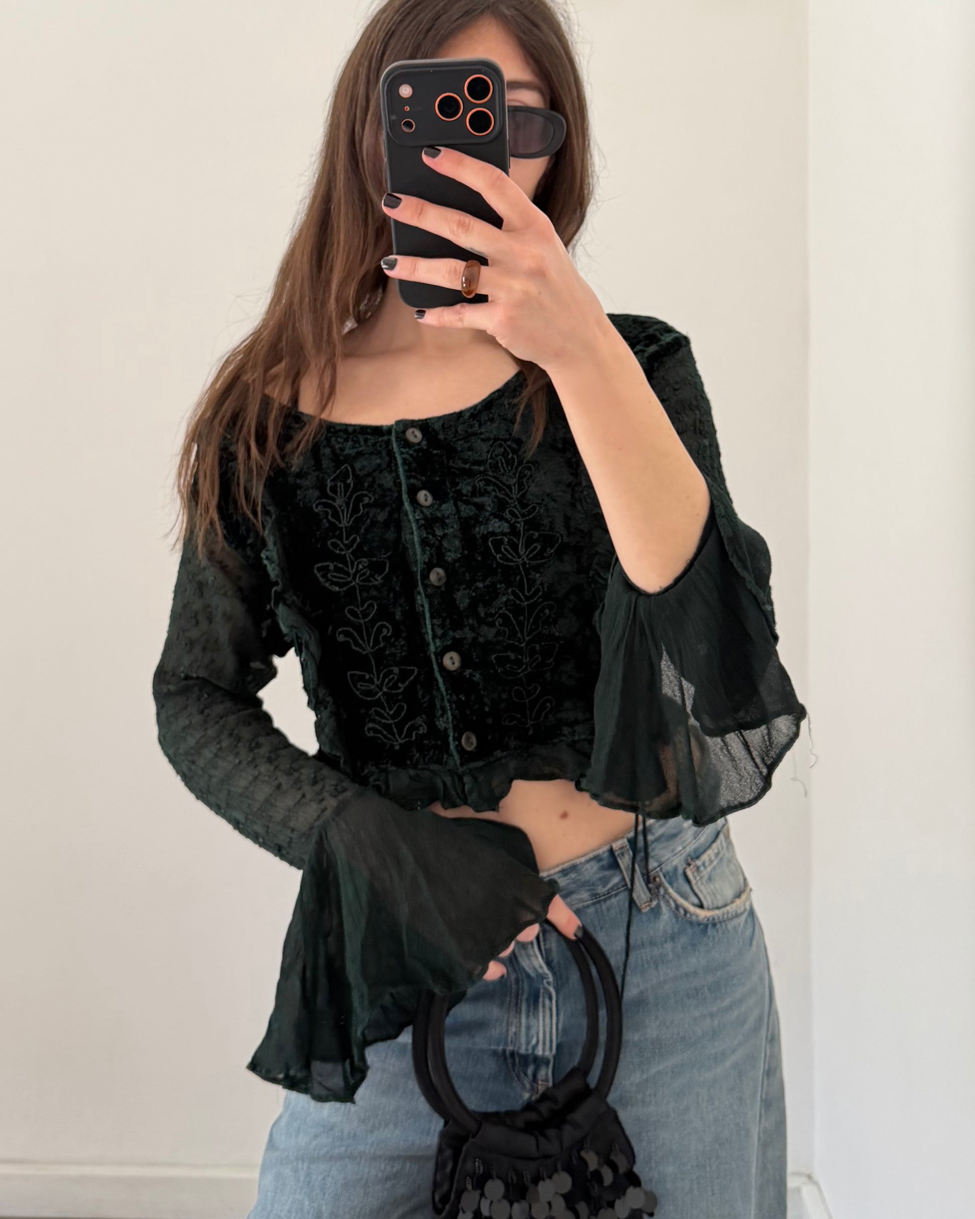 Meraviglioso top vintage anni 90 da fatina, modello morbido ma con taglio a corsetto:  laccetti laterali per regolare il fit sul davanti e lacci sul retro per regolare la vita, maniche svolazzanti e semi trasparenti, motivo con ricami e tessuto simile alla ciniglia e alla seta