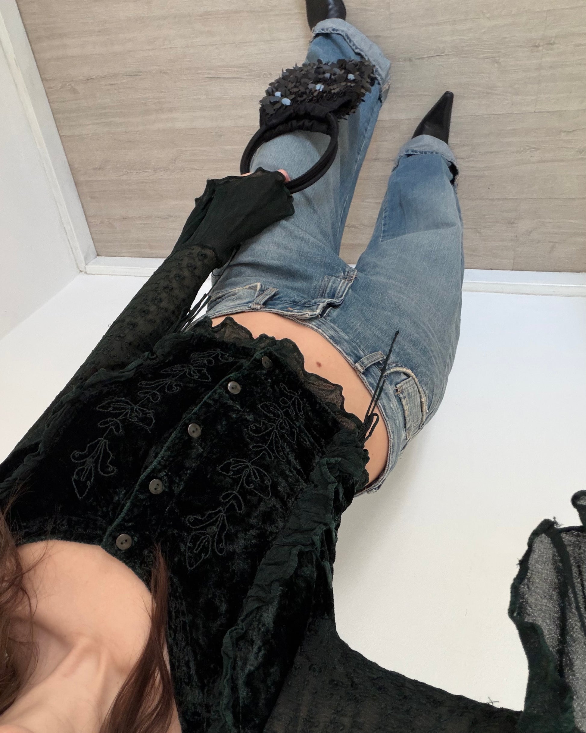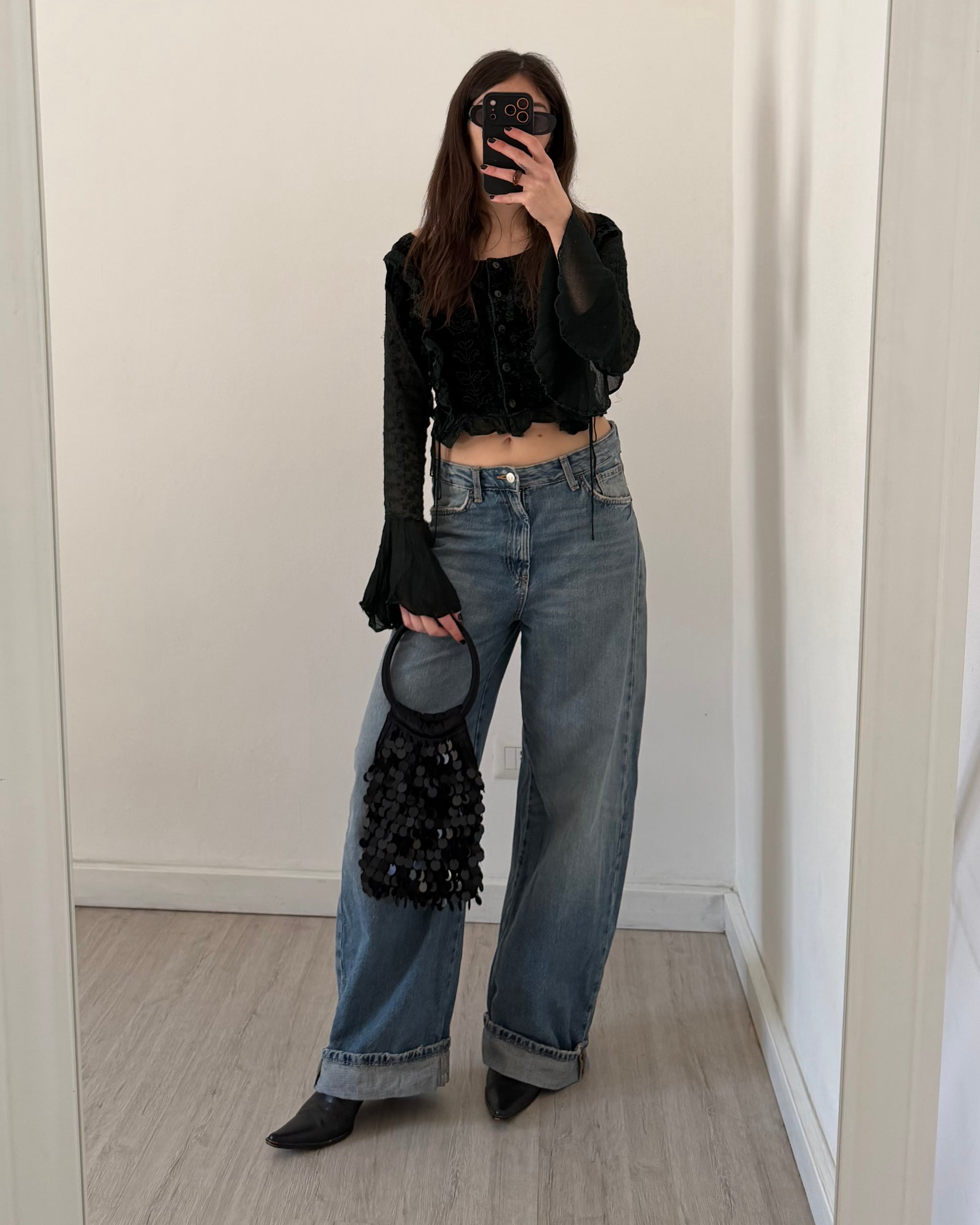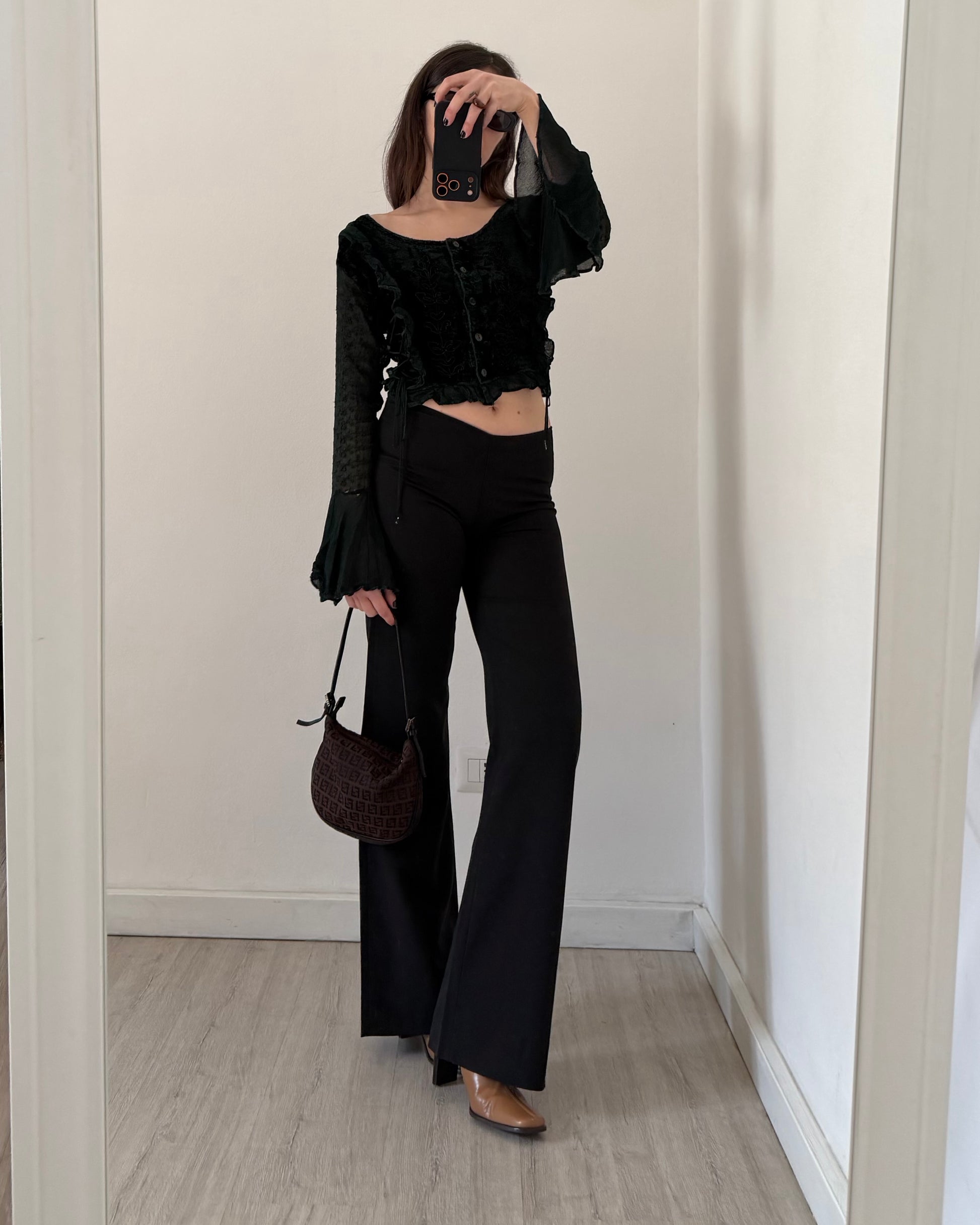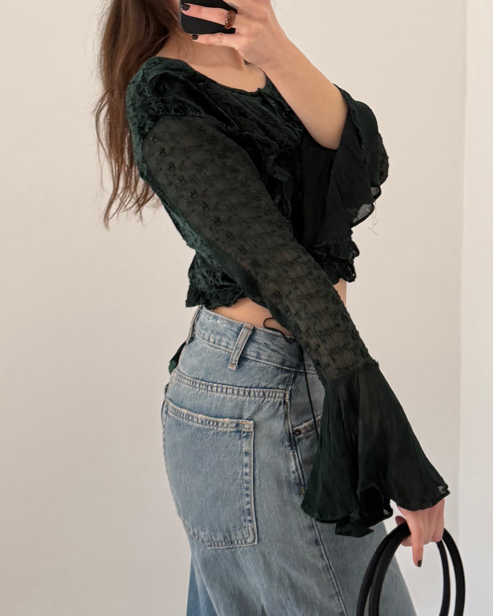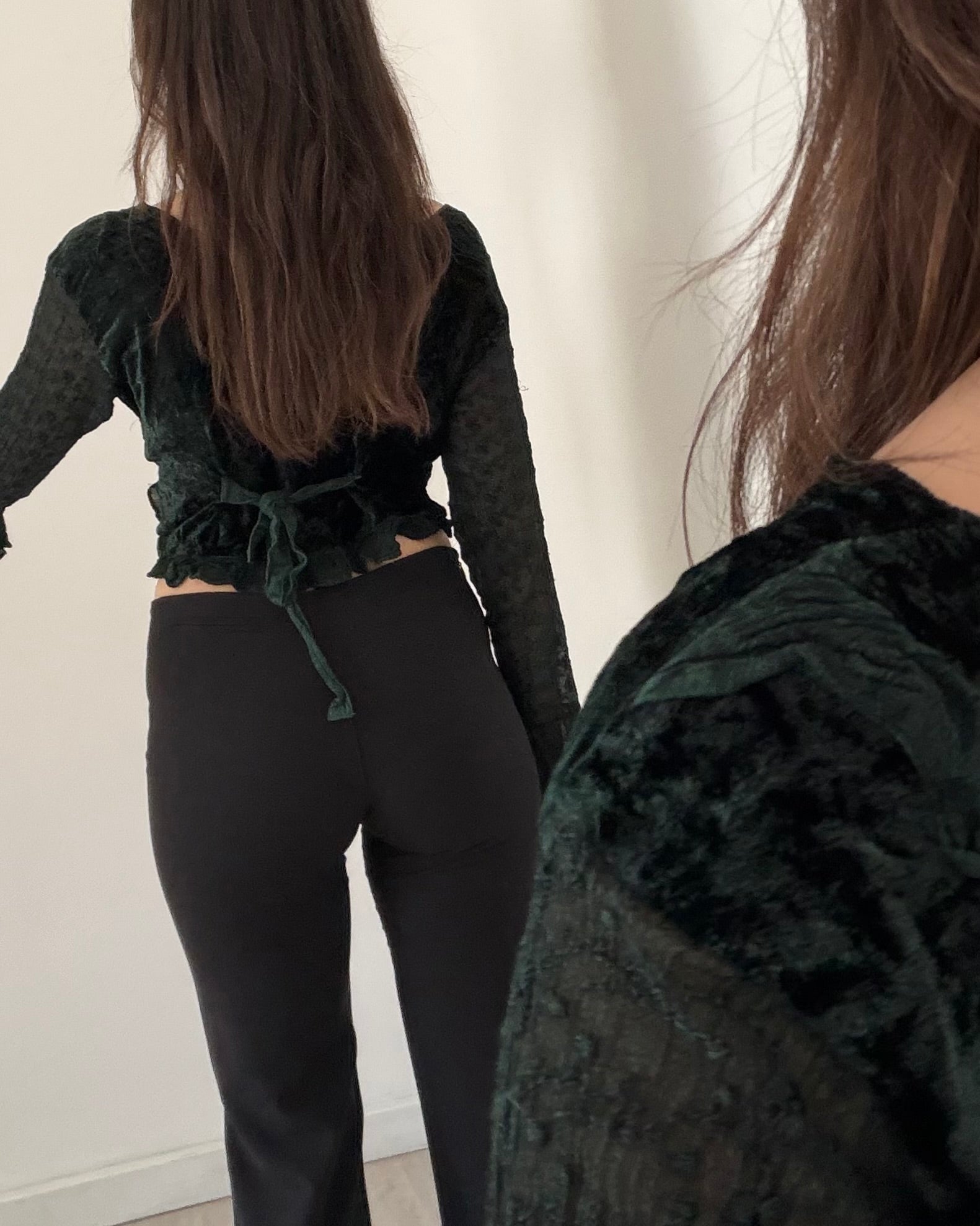 Meraviglioso top vintage anni 90 da fatina, modello morbido ma con taglio a corsetto:  laccetti laterali per regolare il fit sul davanti e lacci sul retro per regolare la vita, maniche svolazzanti e semi trasparenti, motivo con ricami e tessuto simile alla ciniglia e alla seta