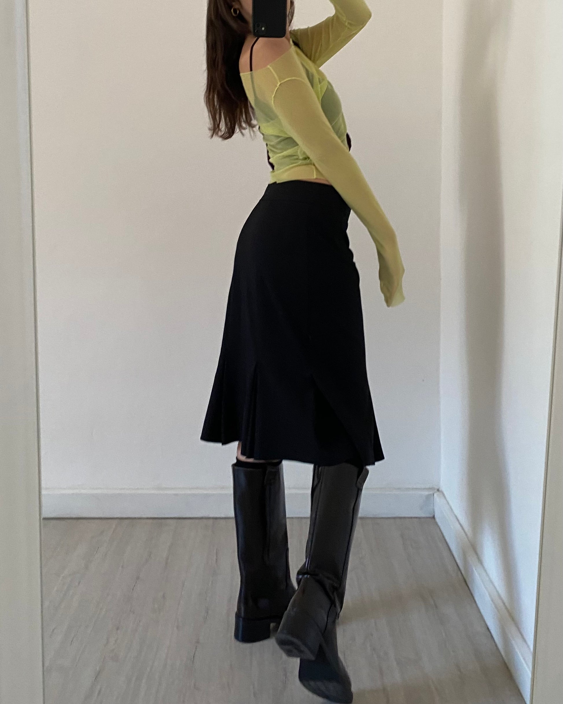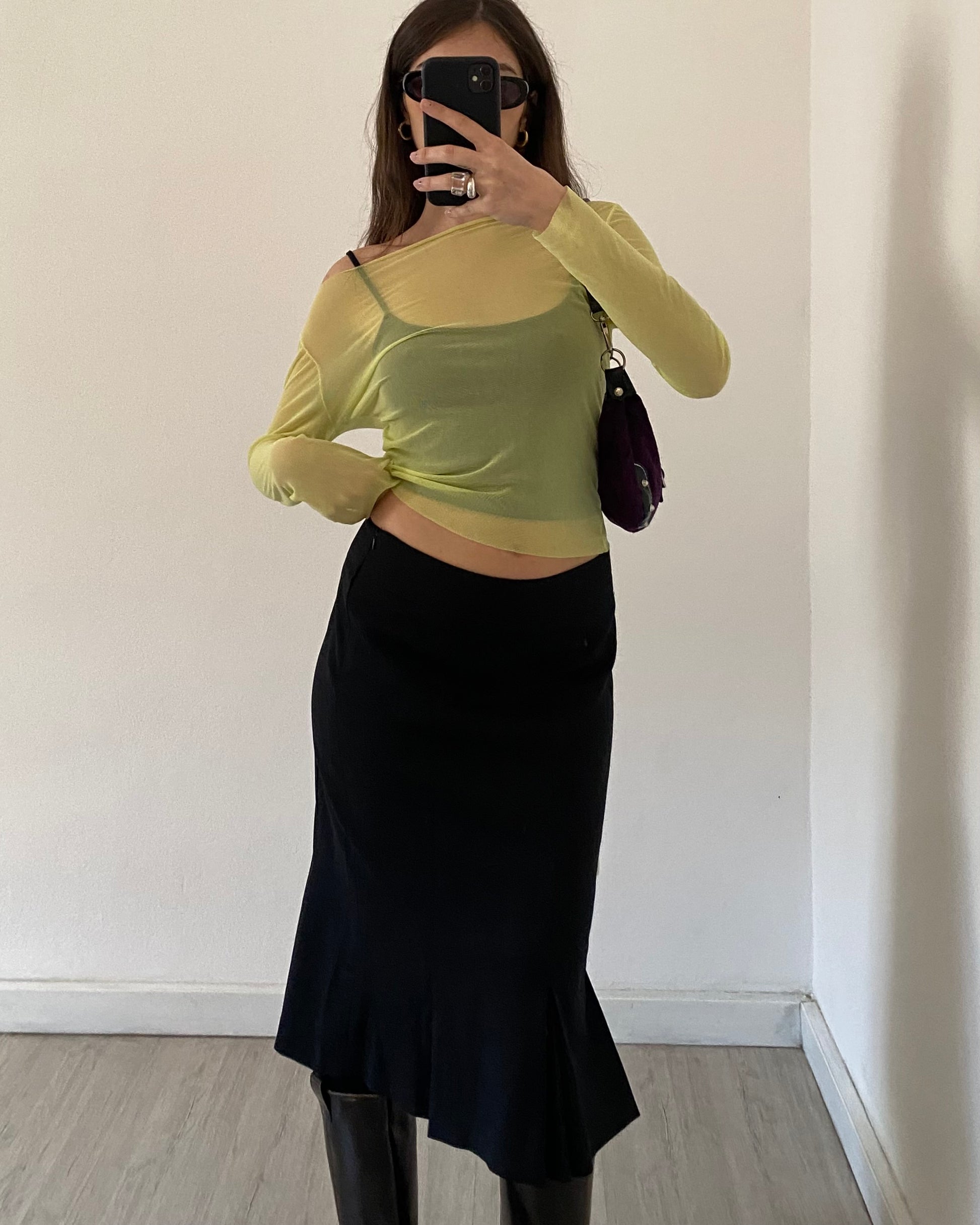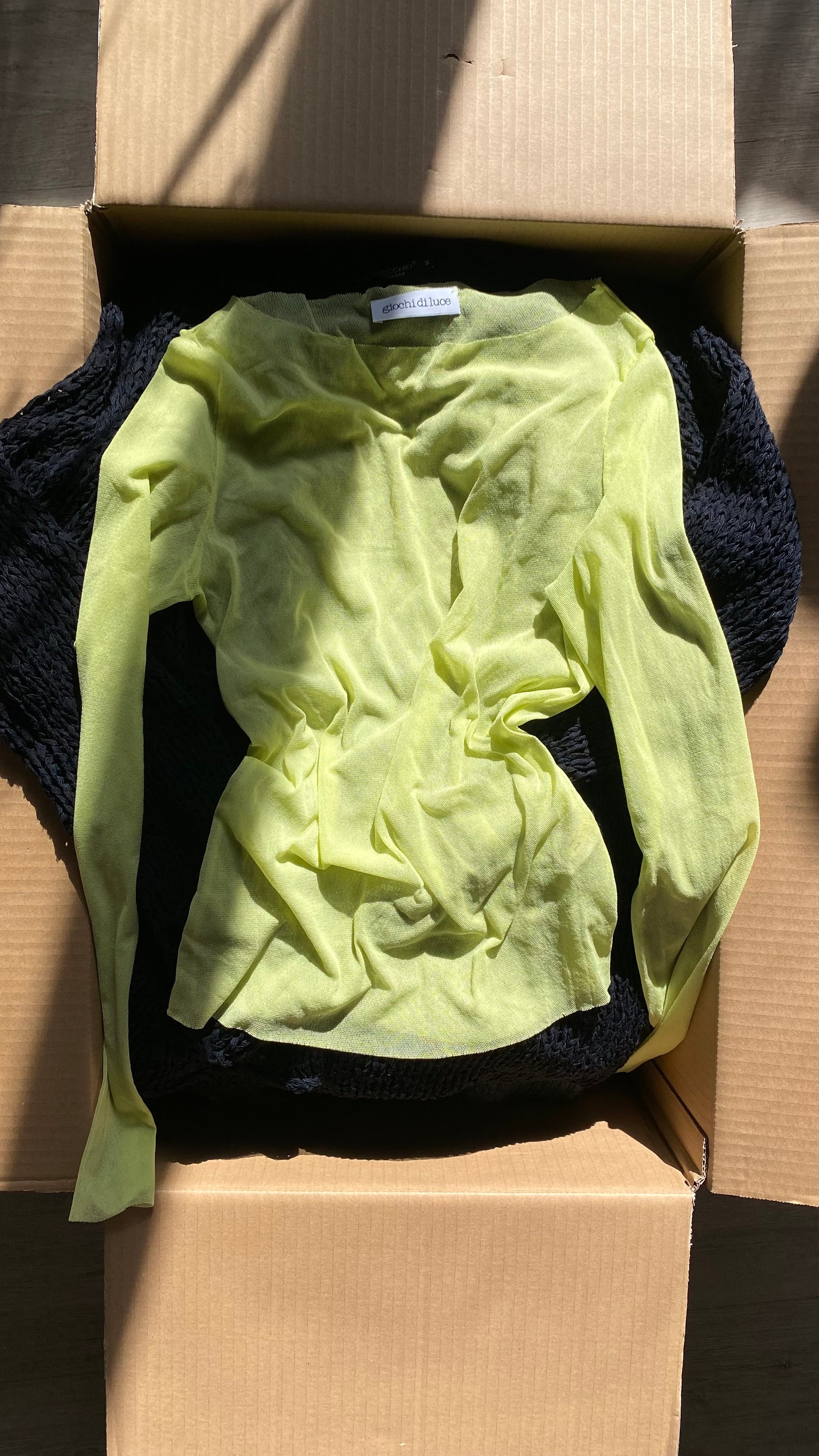 Top primi anni 2000 in micro mesh trasparente, maniche lunghe, tessuto stretch, bellissimo color lime.
