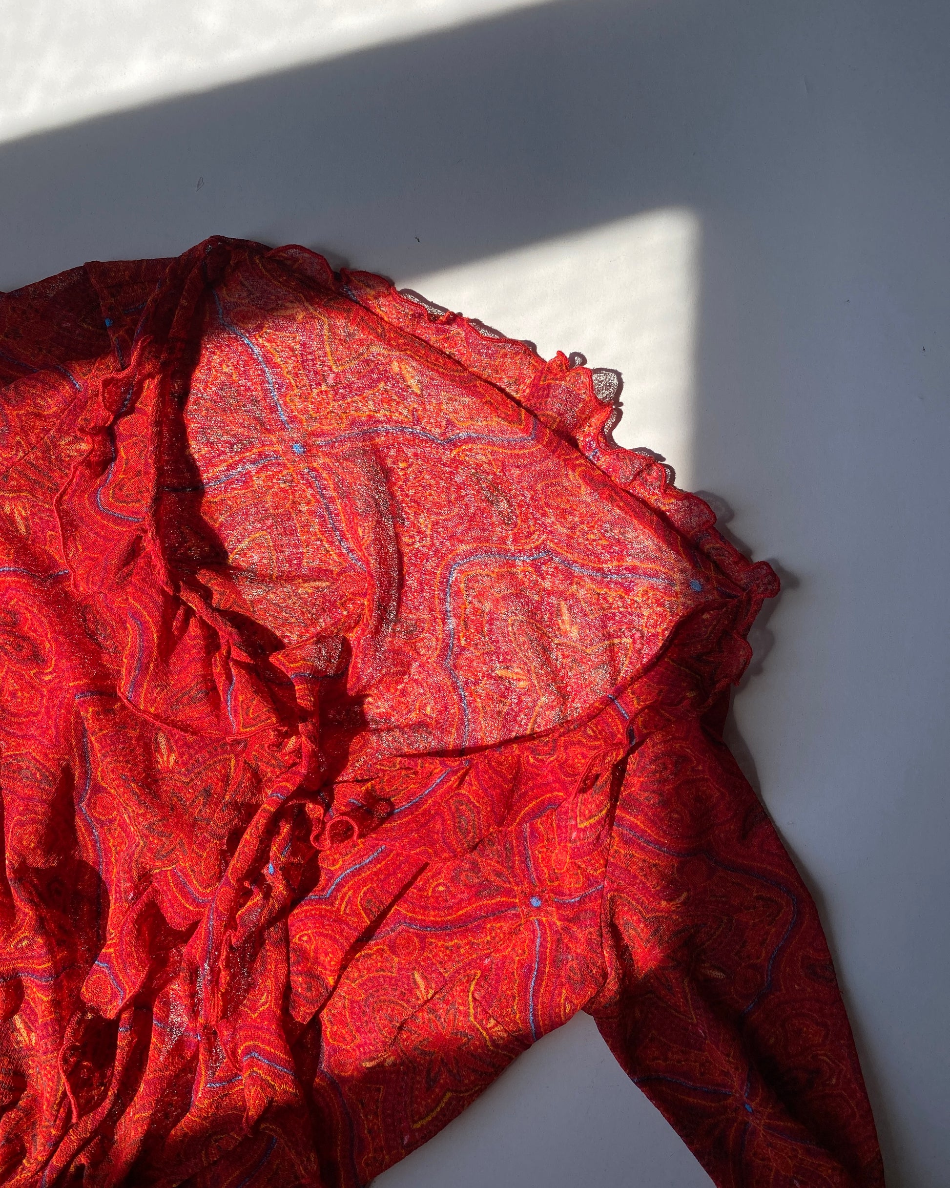 Top primi anni 2000 in micro tulle trasparente con volants, maniche svasata, fantasia paisley, chiusura con gancetti.