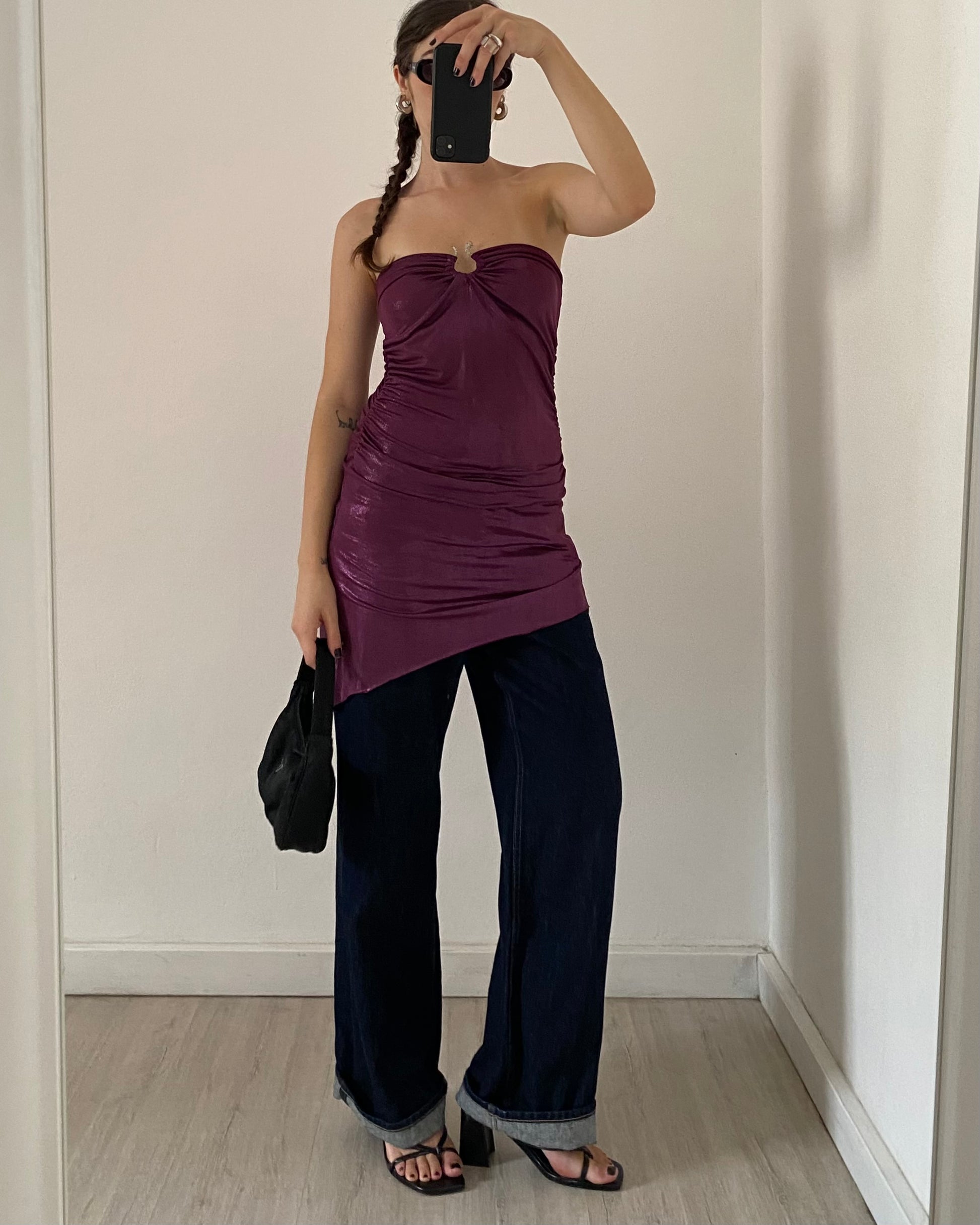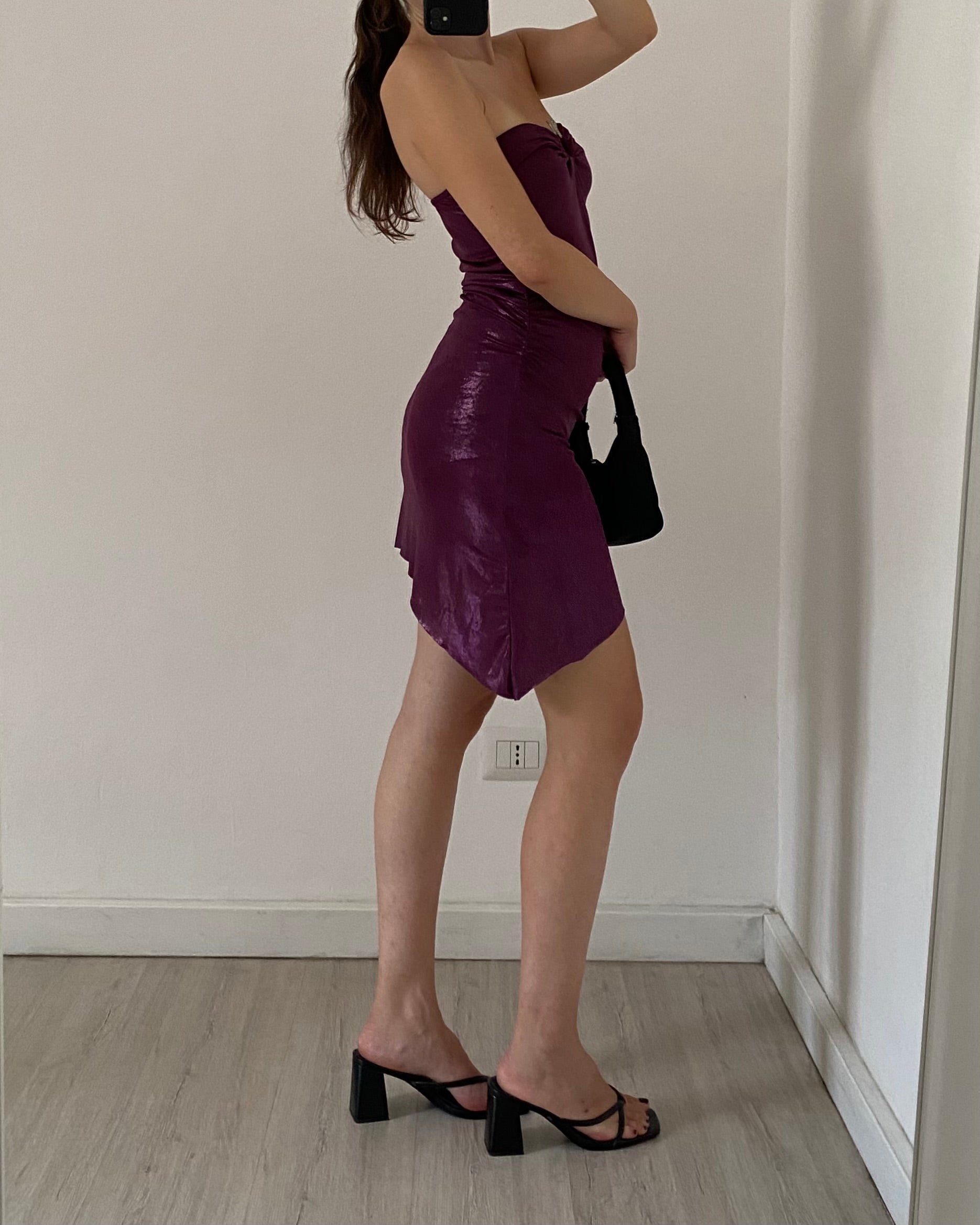 Meraviglioso abito primi anni 2000 con dettaglio serpente in metallo e strass, taglio svasato con spacchetto, orlo asimmetrico arricciatura sulla vita, tessuto leggero, metallico effetto "liquid", leggermente iridescente. Unico!