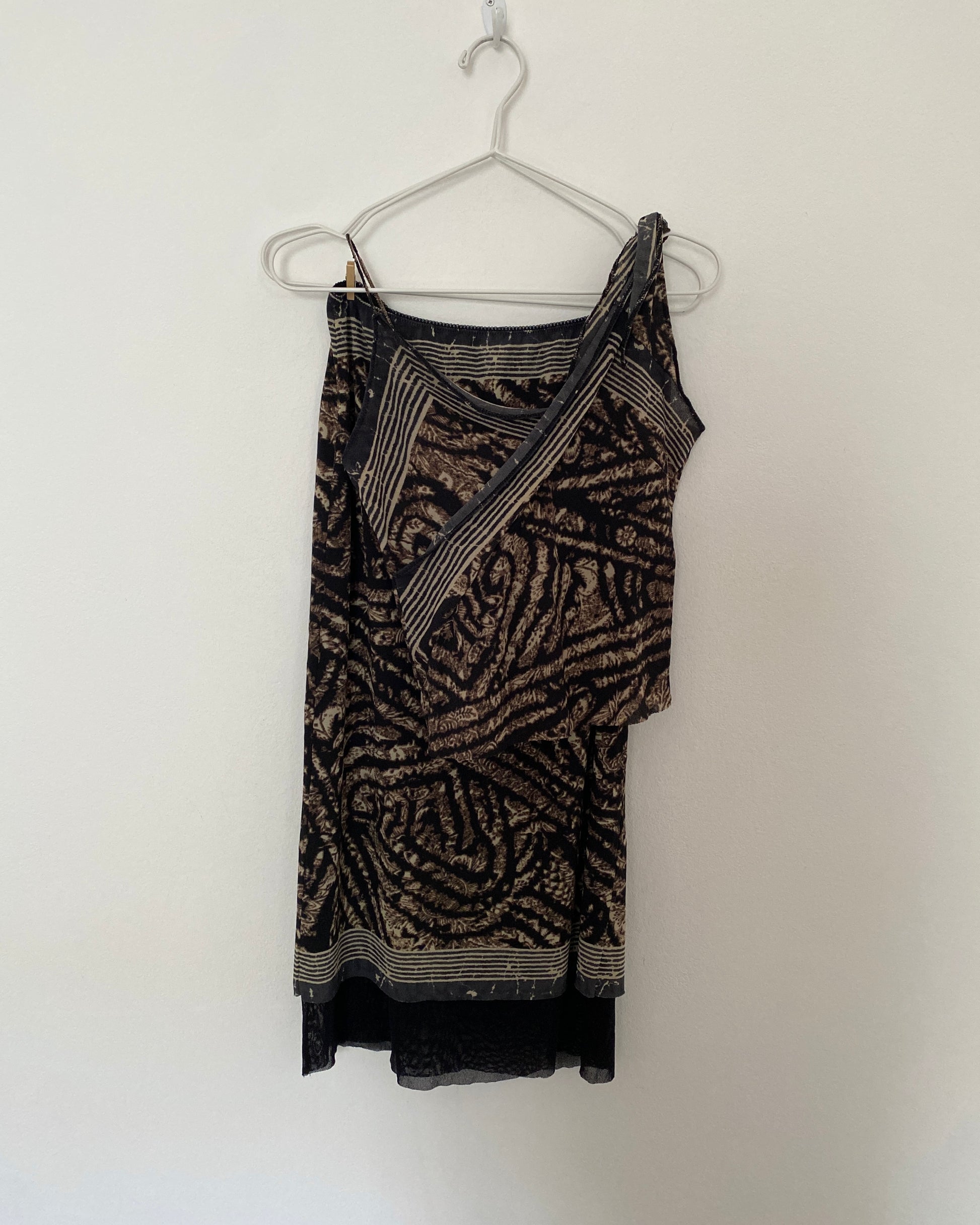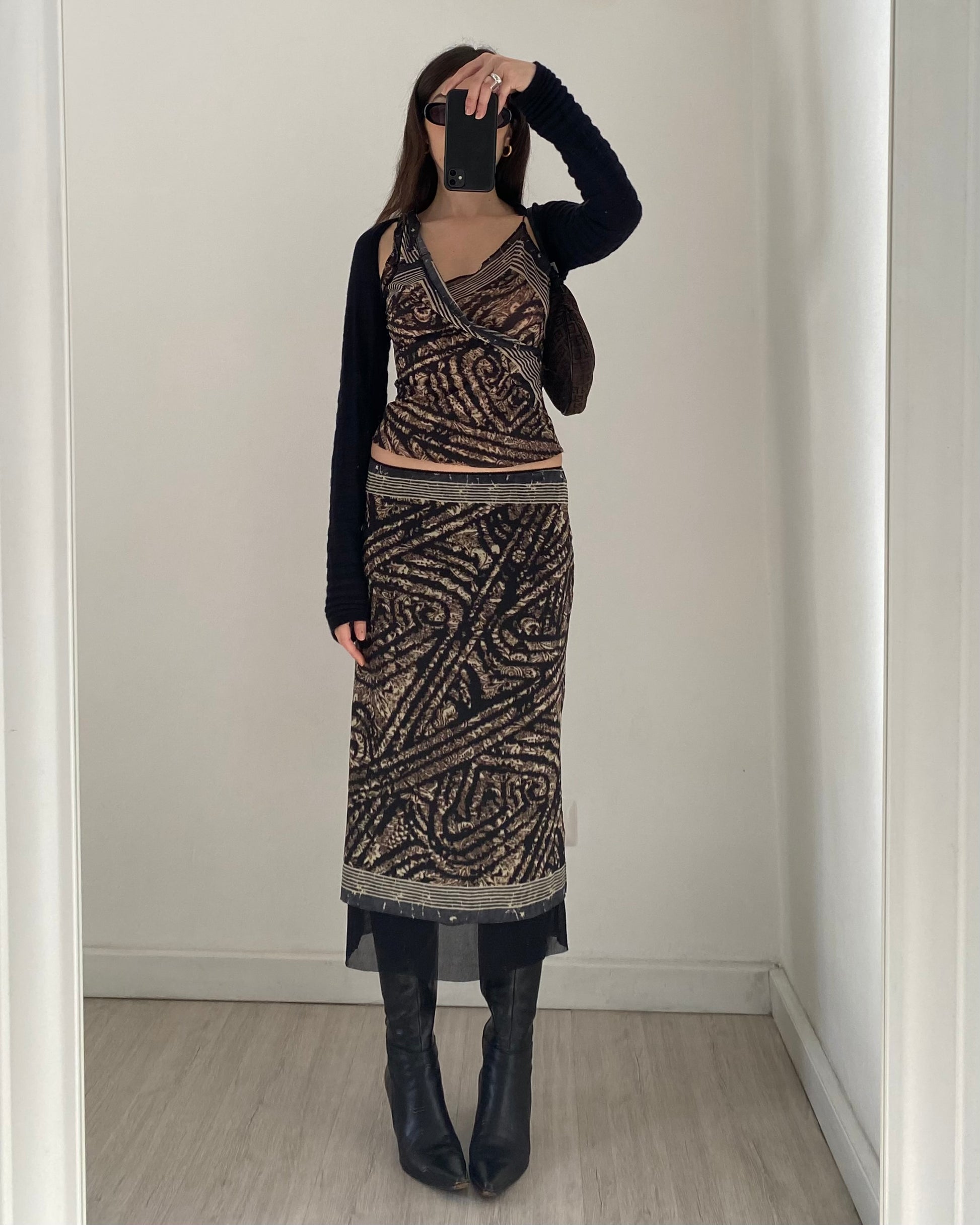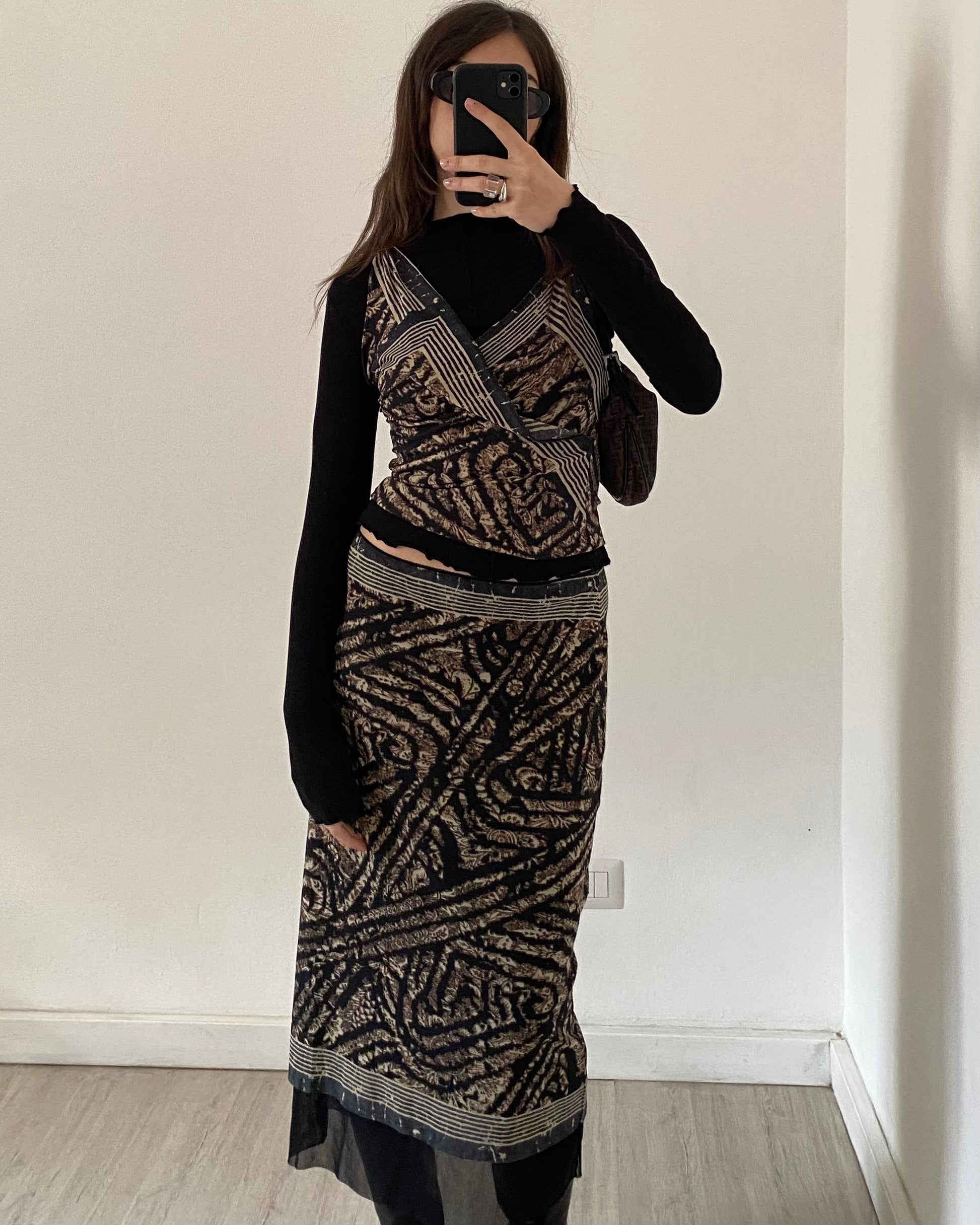 Meraviglioso completo coordinato in micro mesh primi anni 2000 composto da gonna midi vita media, con doppio strato interno e top con una spallina sottile ed una annodata con fiocco. Acquistabili anche separatamente.