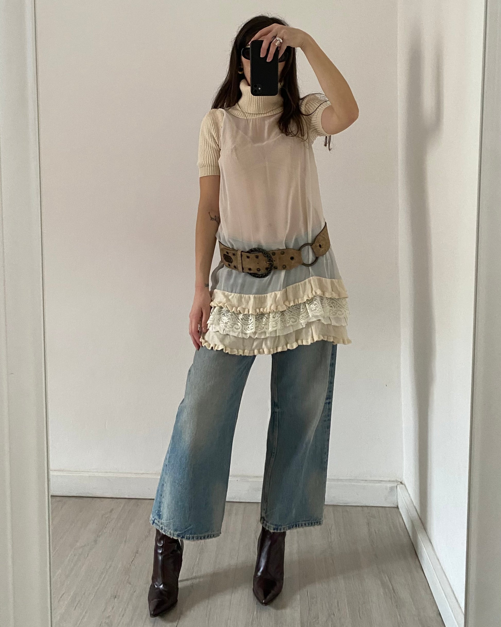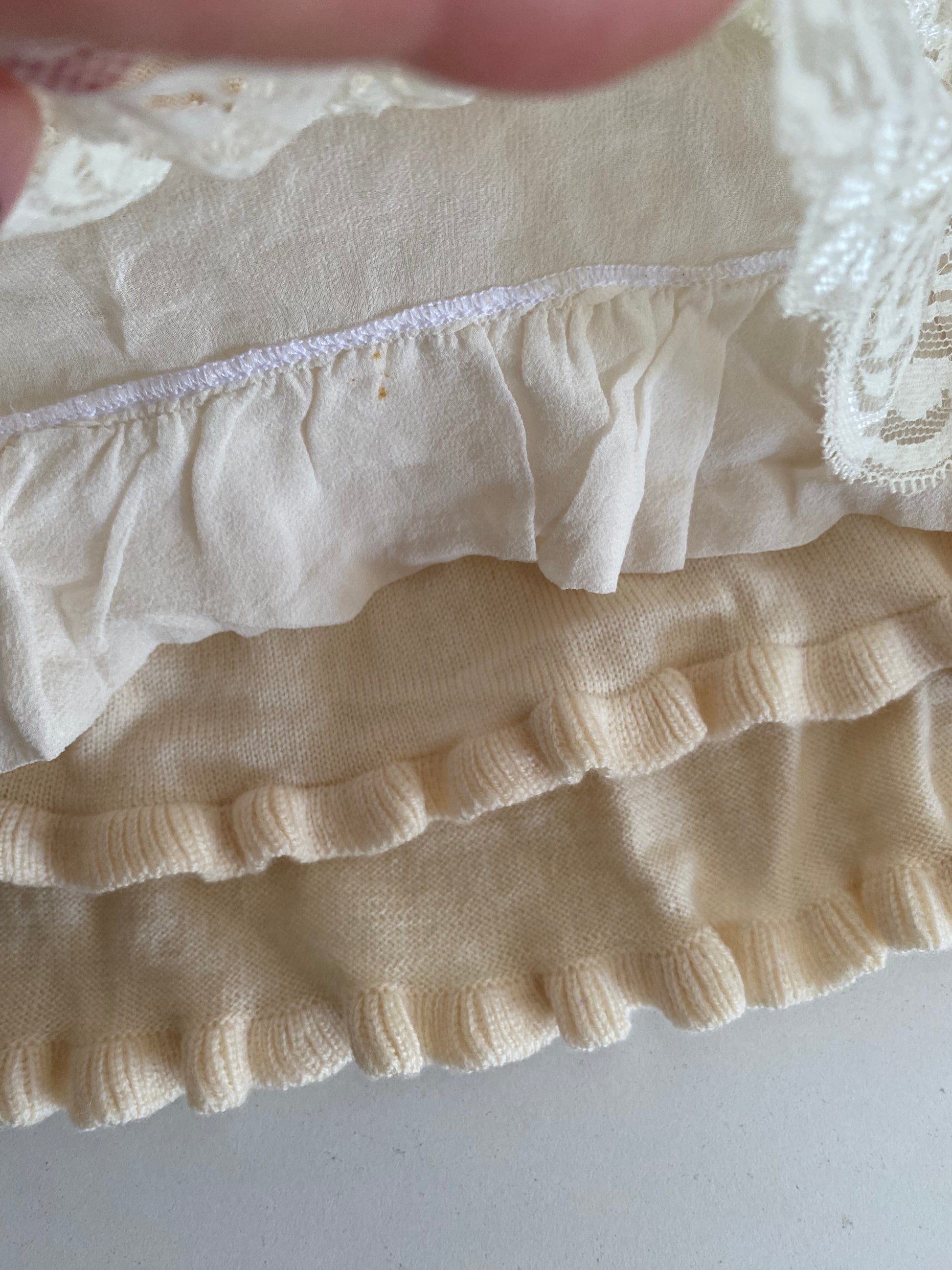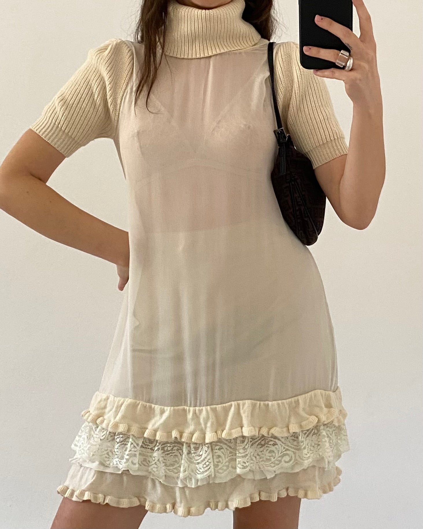 Meraviglioso mini abito ani 2000 in chiffon trasparente con collo alto e dettagli in maglia, micro volants con ricami e pizzo. Unico <3