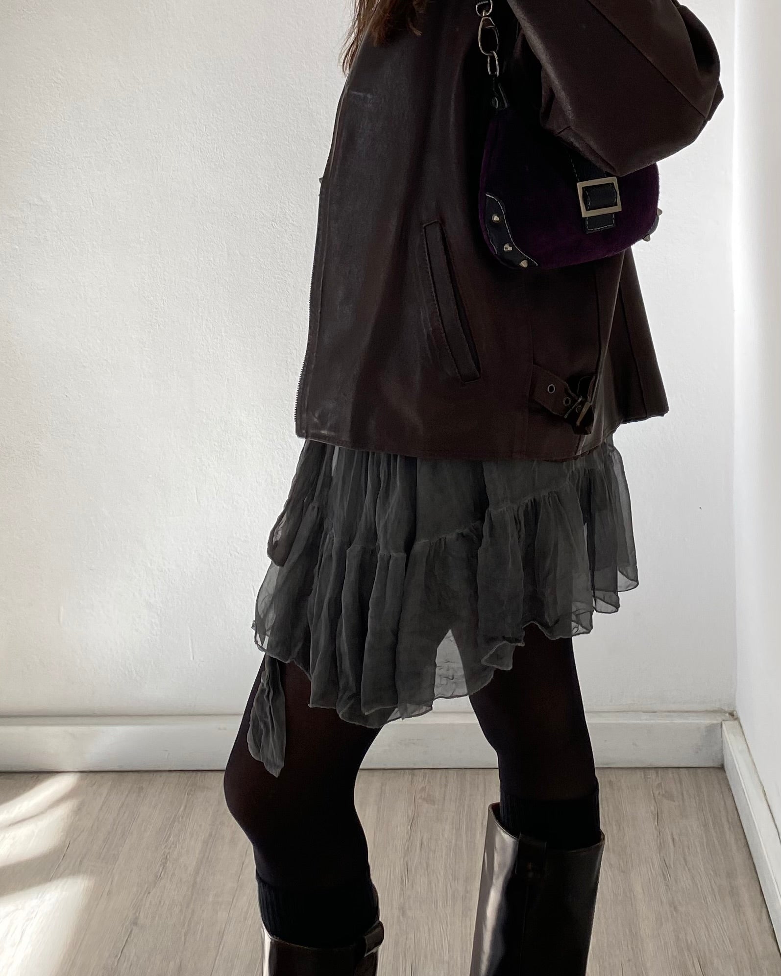 Composizione: 52%acrilico/28%polyammide/15%mohair/5%elastane con gonna a balze 100% pura seta + fodera in viscosa.