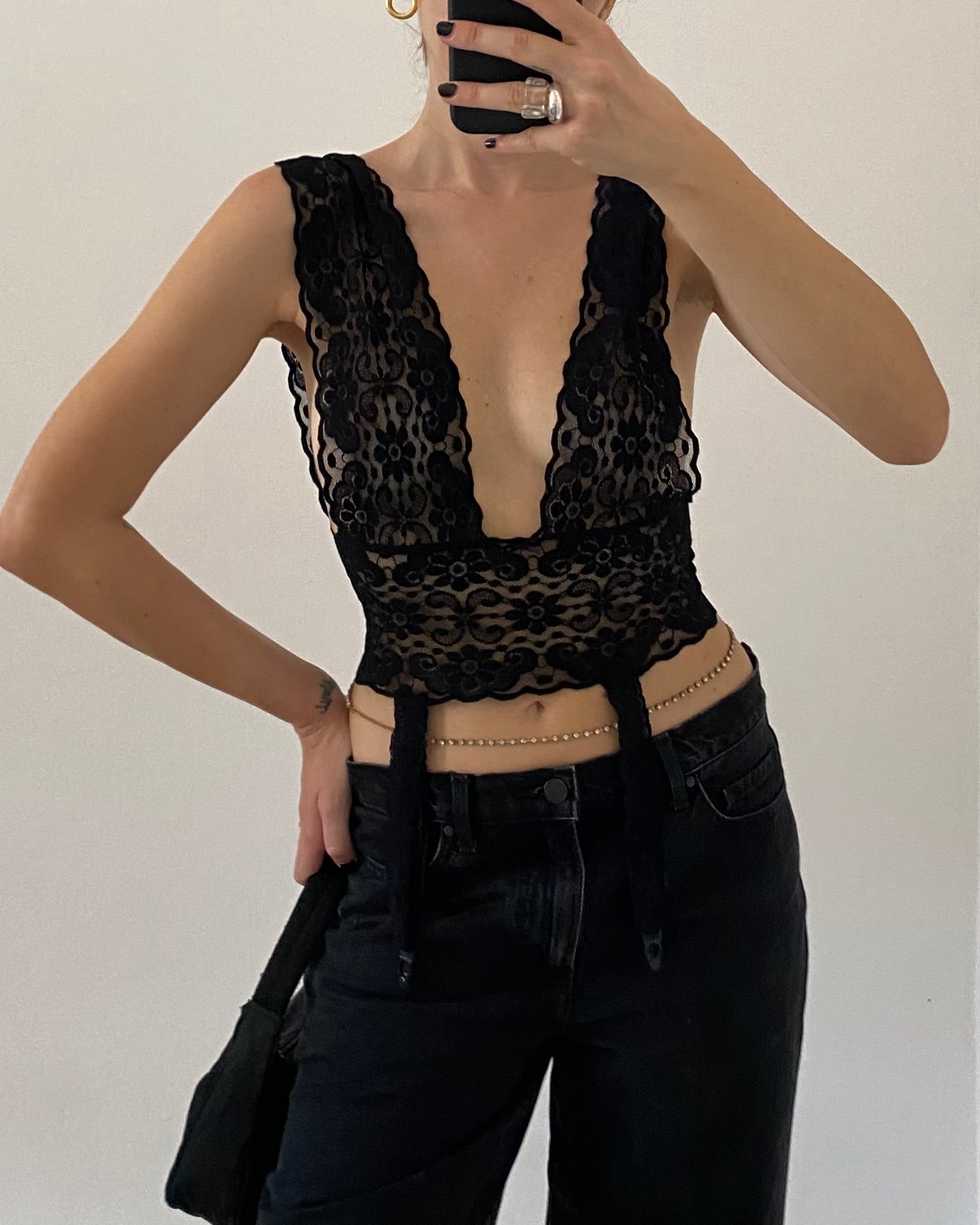 Sexissimo top in pizzo vintage con profonda scollatura a V fronte e retro e reggicalze incorporato.