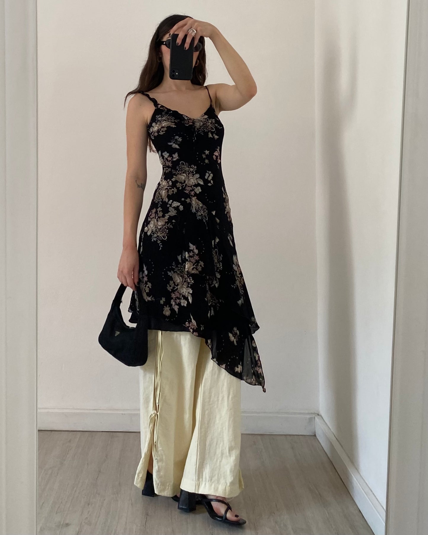 Meraviglioso abito primi anni 2000 con gonna asimmetrica, fantasia floreale, tessuto dopio strato, laccetti sul retro e volants delicati sulle spalline.