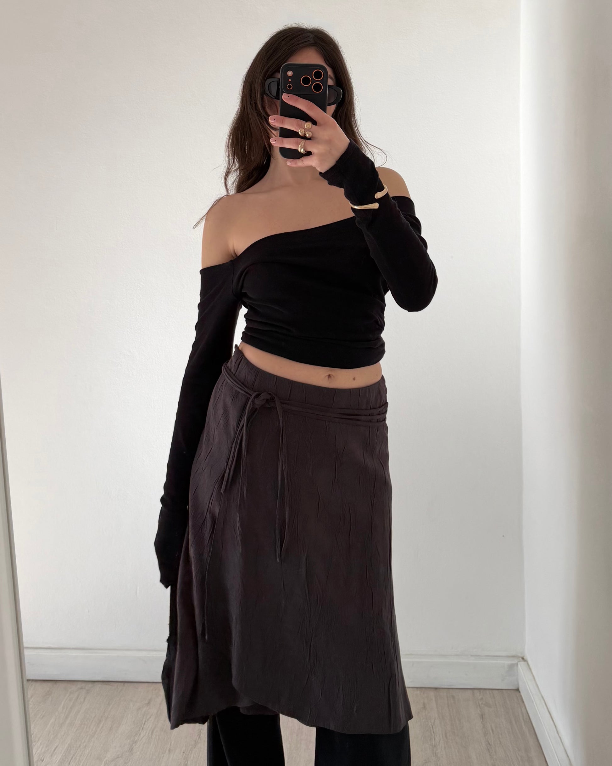 Meravigliosa gonna midi anni 2000, taglio svasato, fodera interna, tessuto effetto stropicciato, chiusura con zip laterale, laccetti laterali da allacciare come cintura sulla vita o da far scendere lungo i fianchi come elemento decorativo. Ottima fattura e fit fantastico.